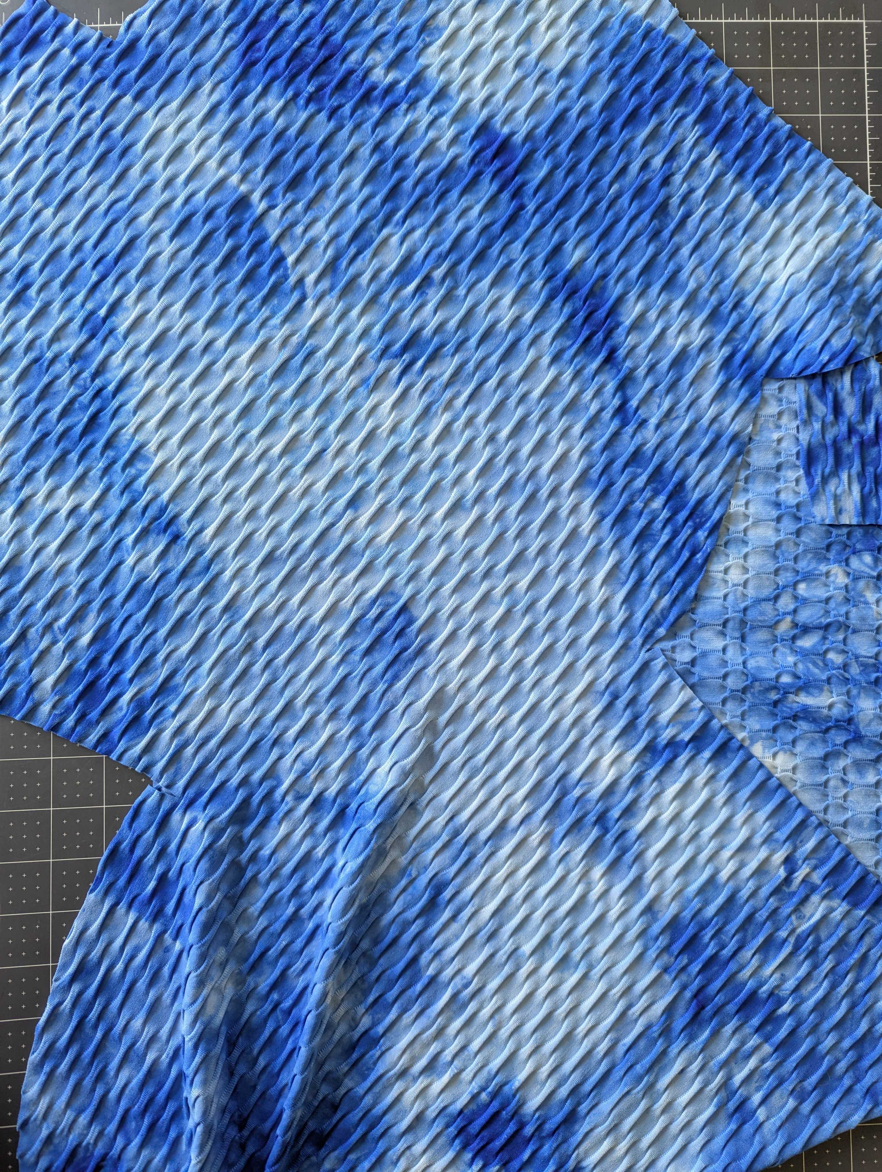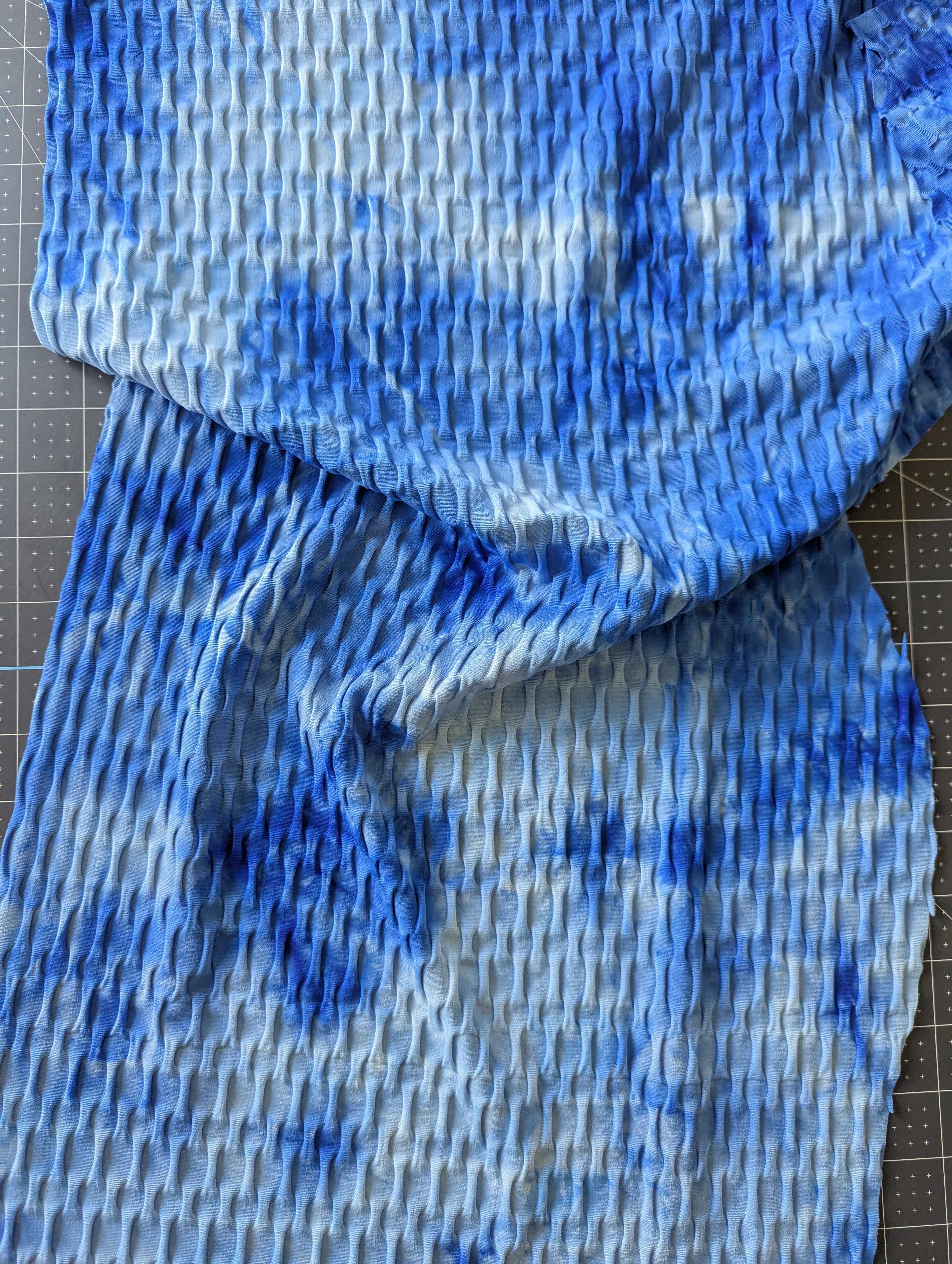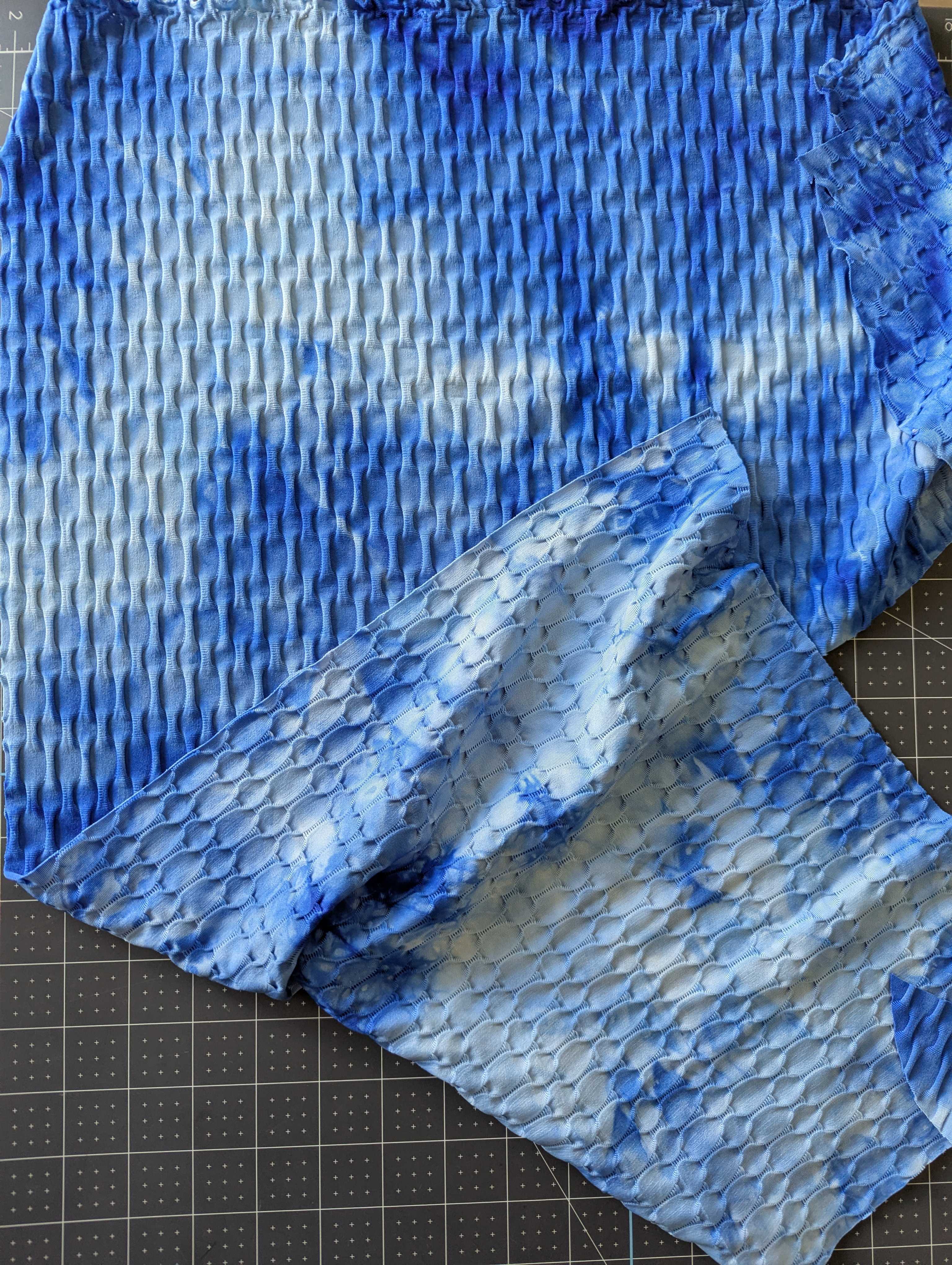 Great for swimwear? Beautiful ocean blue fabric, cut but plenty of fabric remains. We don't take exact measurements of misshapen remnants, but mat board is in inches for size reference.