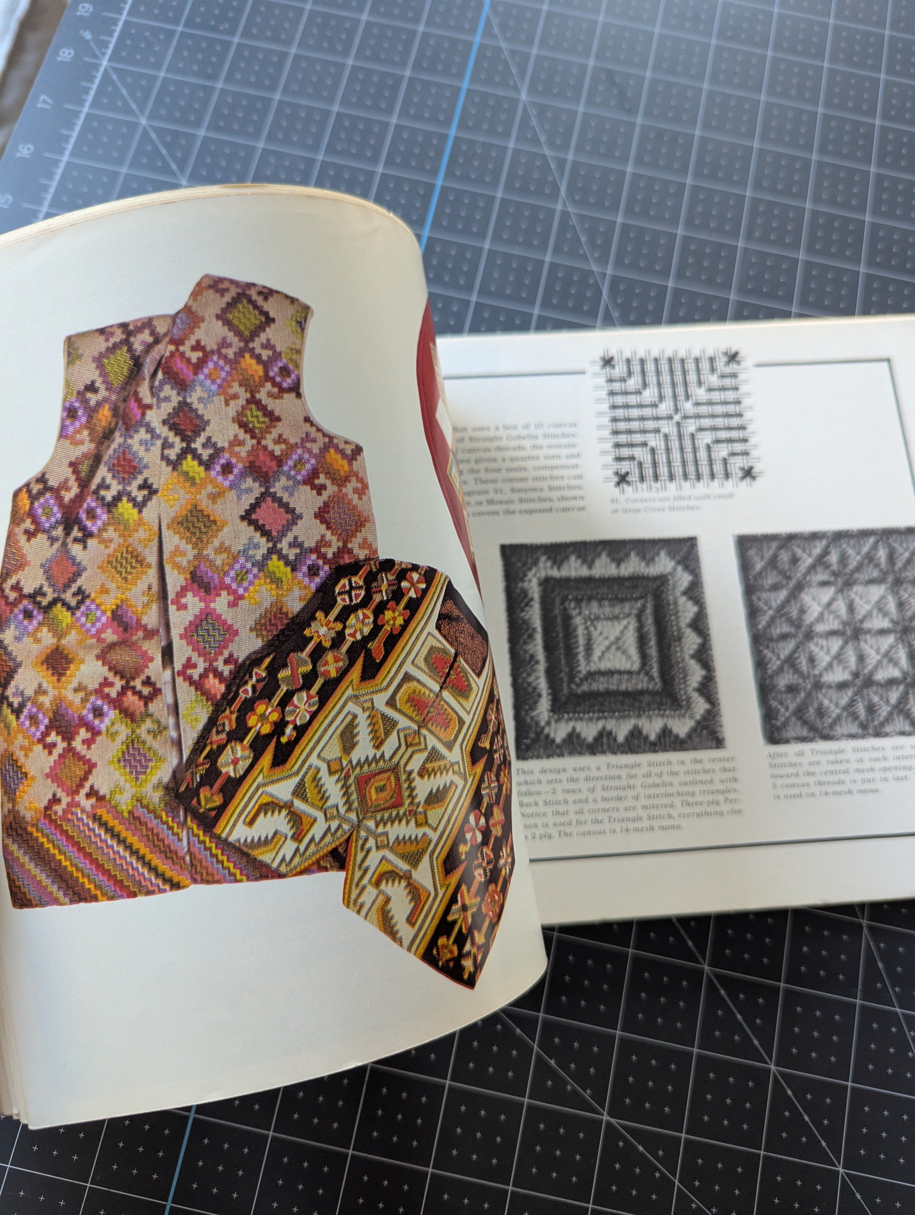 Quite a cool book, a few color photos, mostly black and white with stitch guides. Spiral bound. In good condition overall. Some discoloration around inside covers from age. We'll ship for free, USPS media mail shipping.