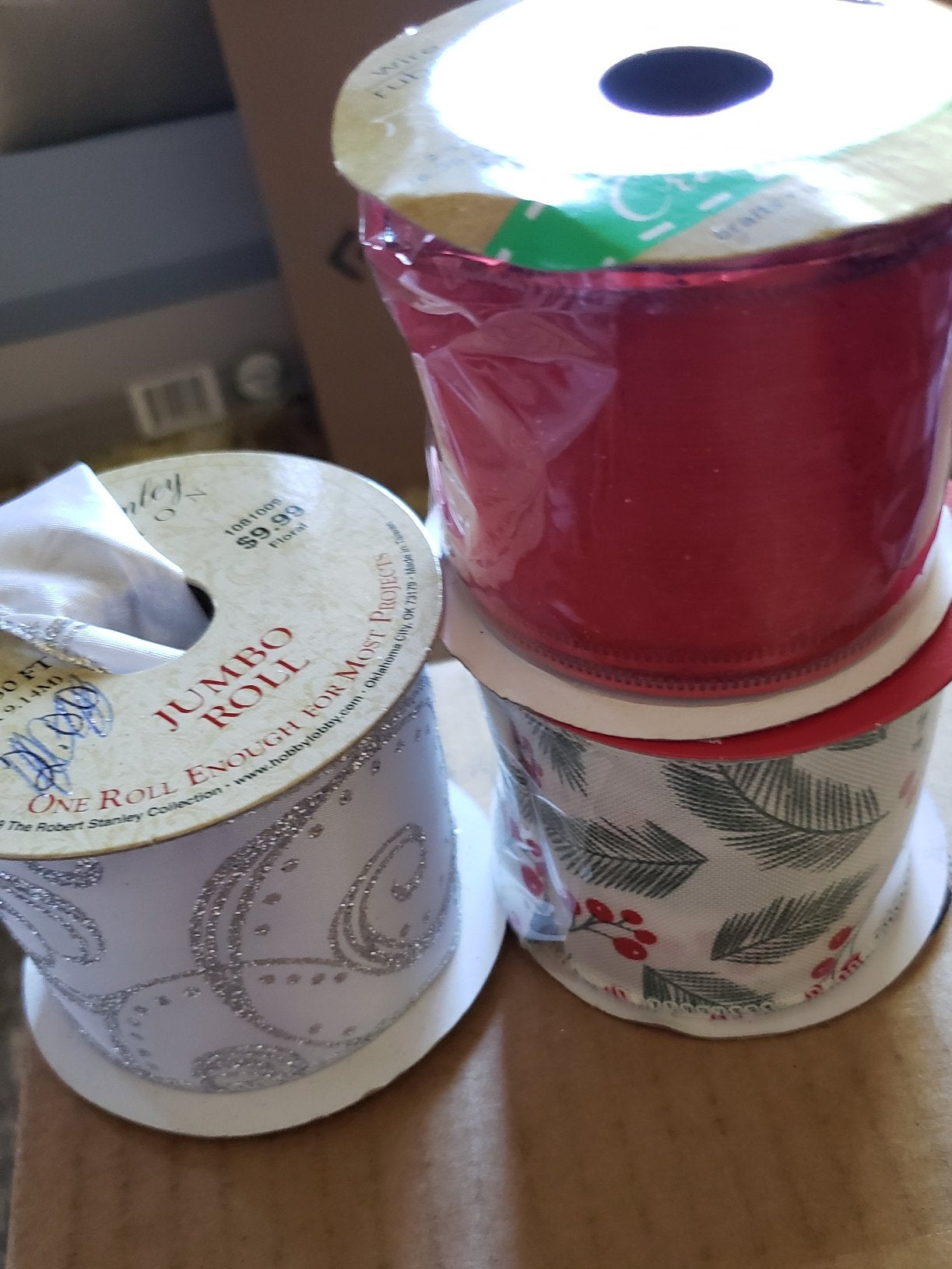 Cute Christmas wired ribbon, white and silver swirl, sold red. And holly leaf design. Perfect for wreaths, etc