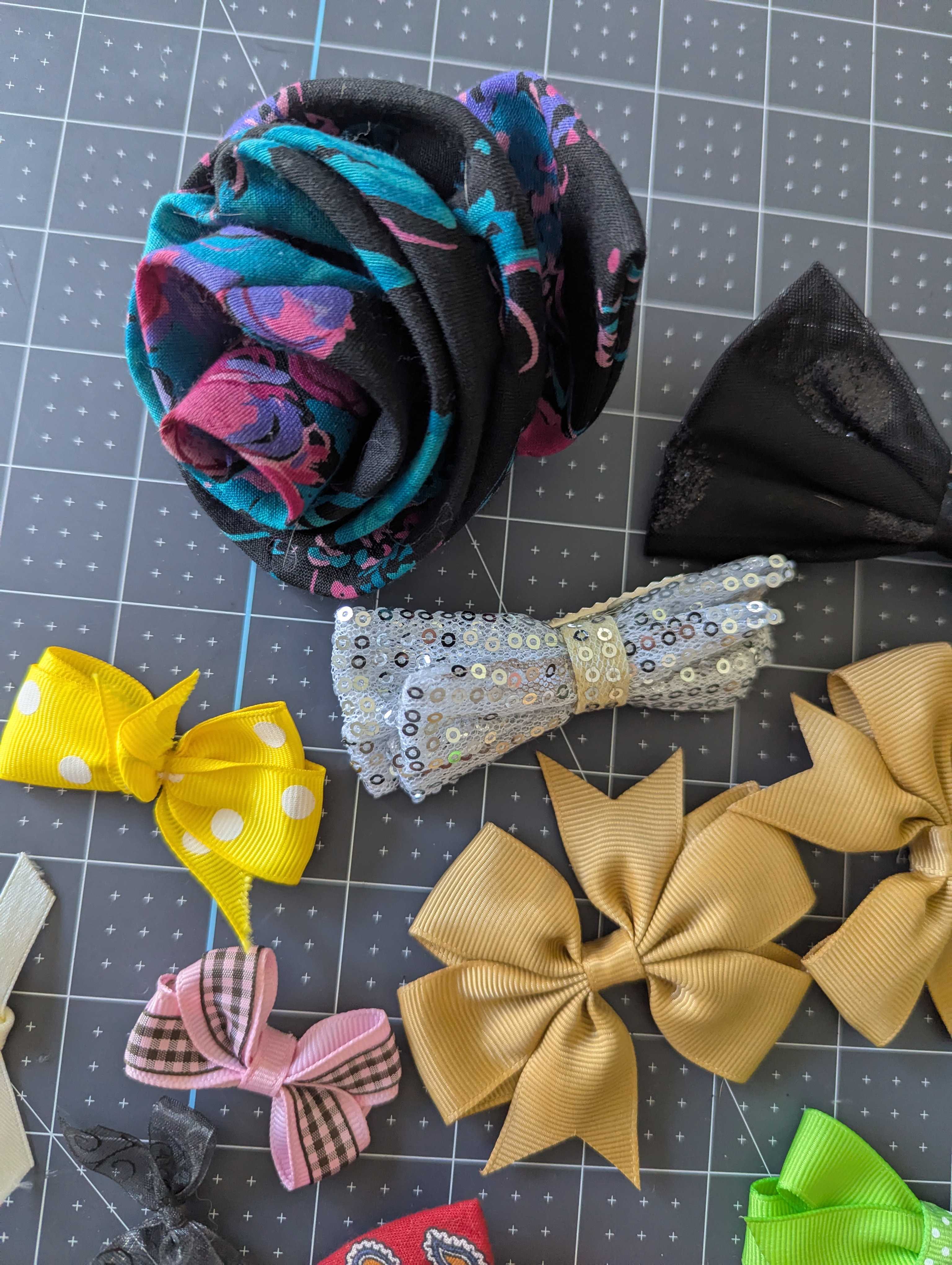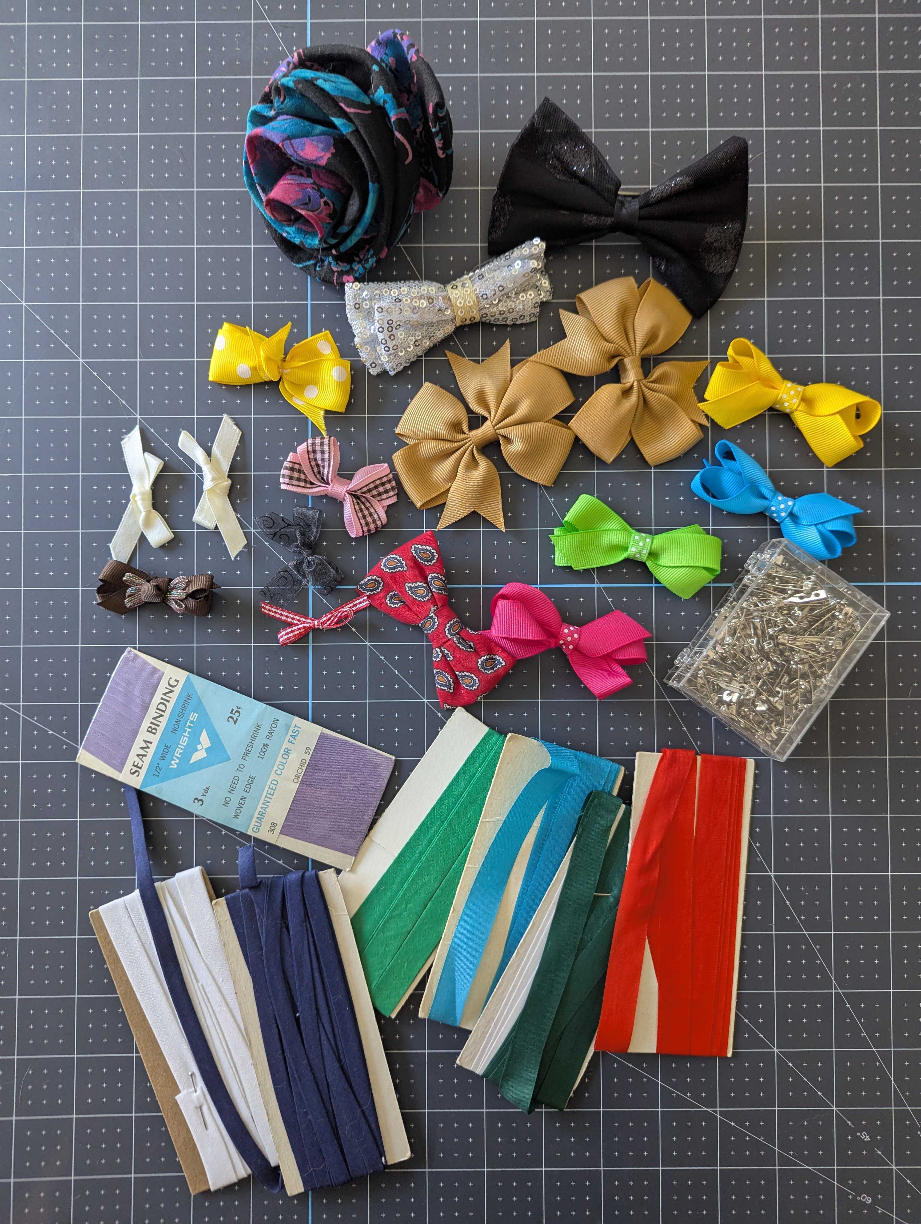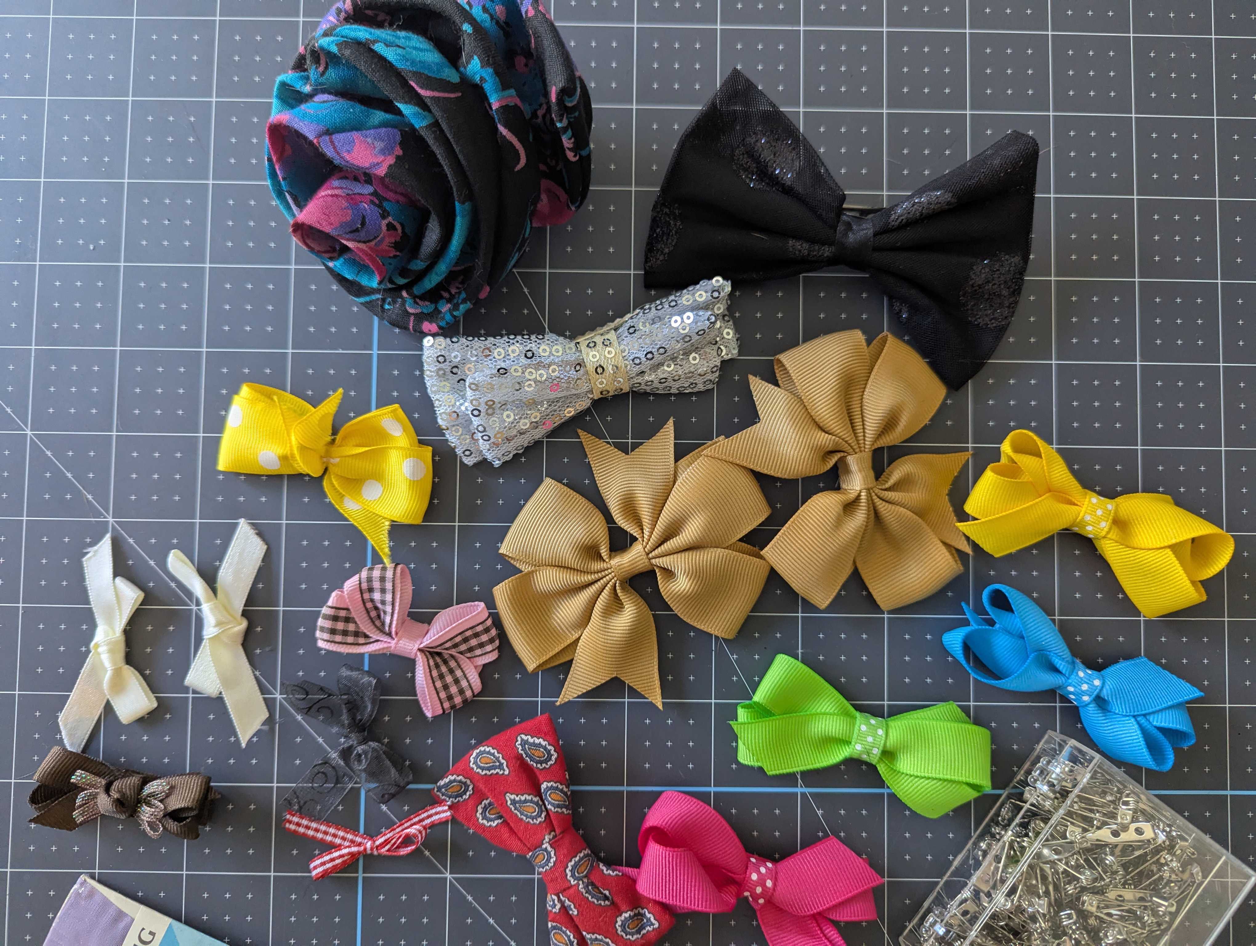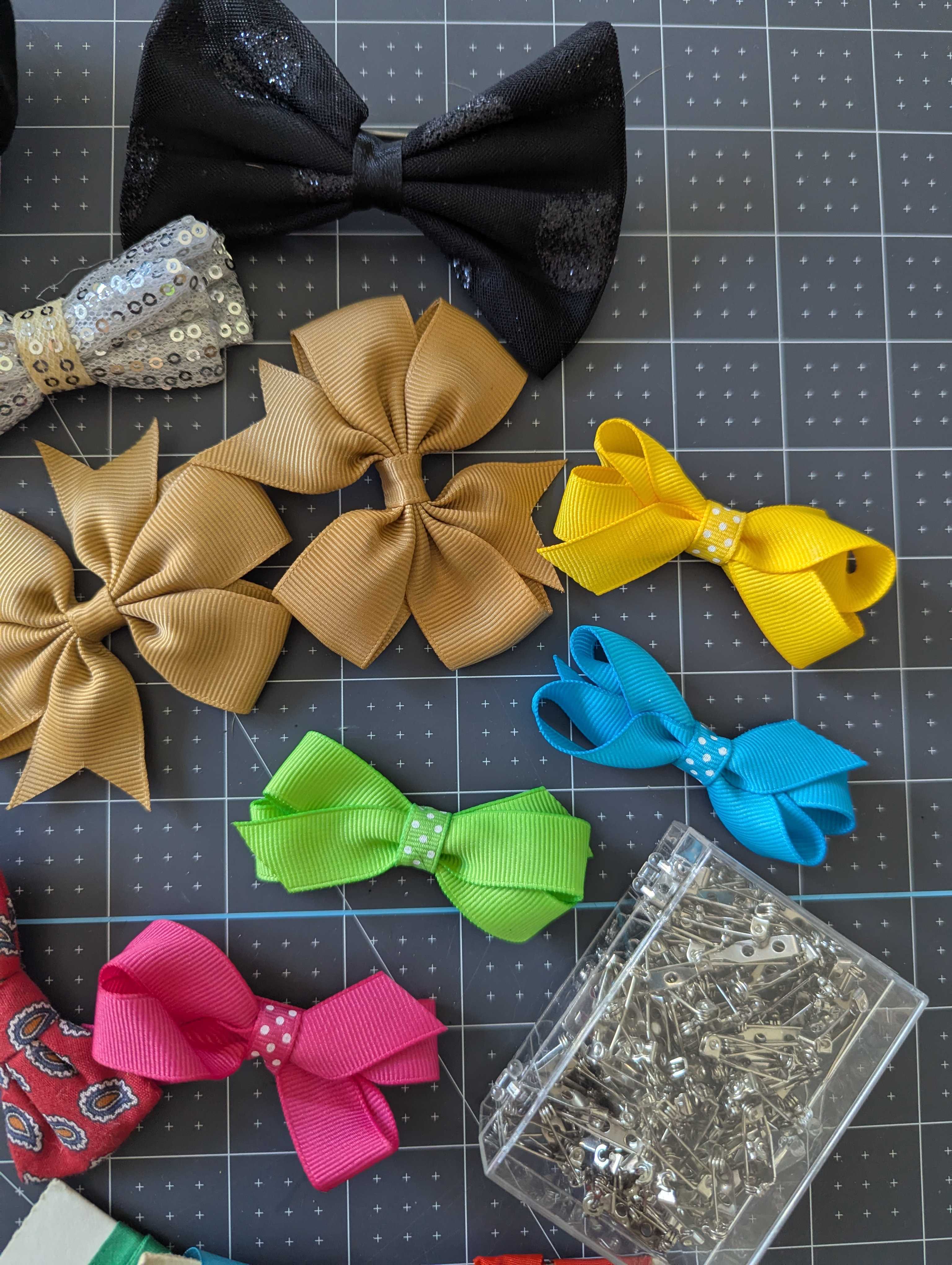 • A set of bowties, some with backings or clips, others without.