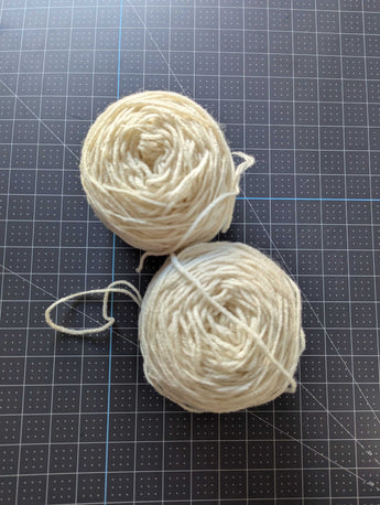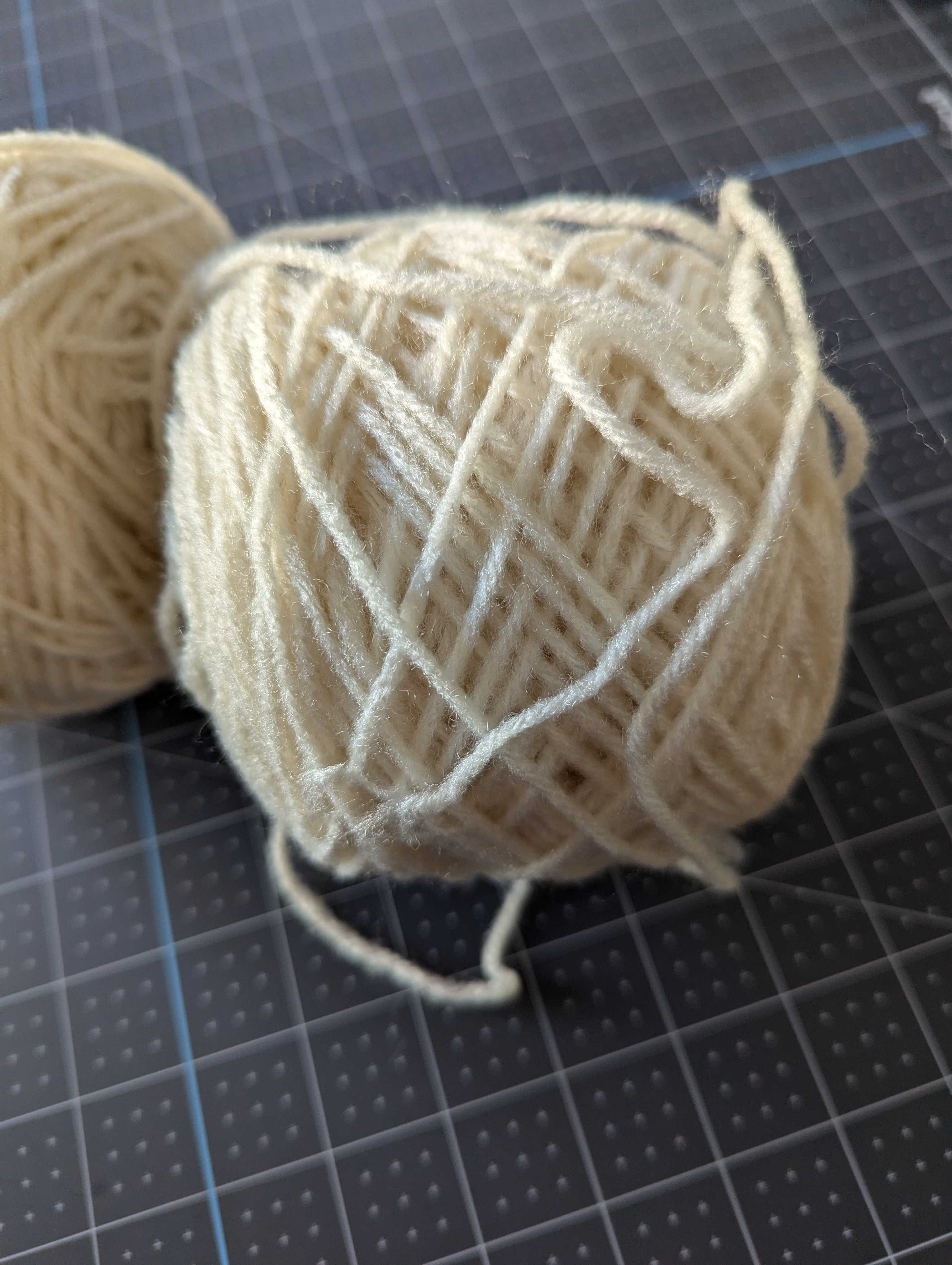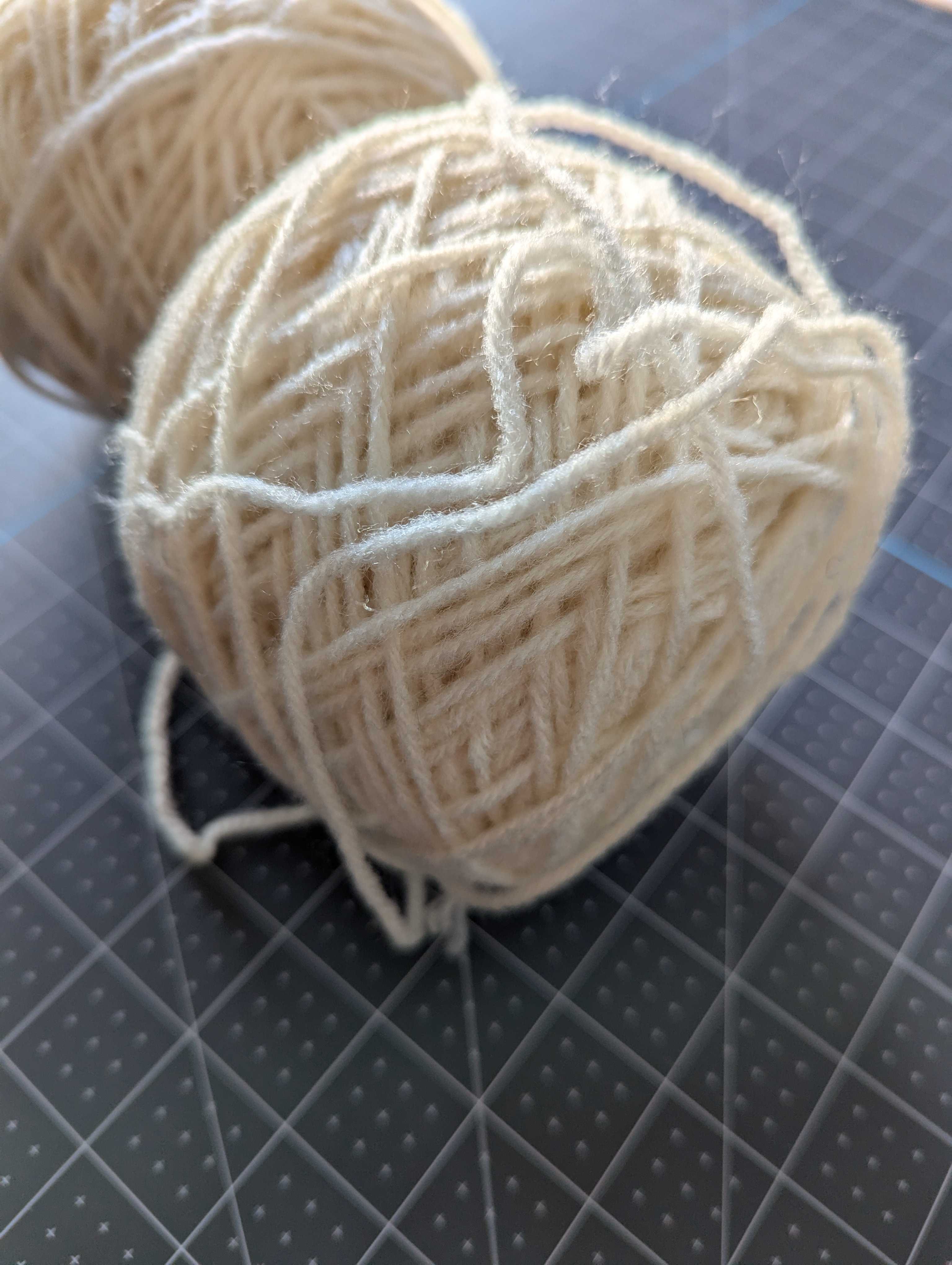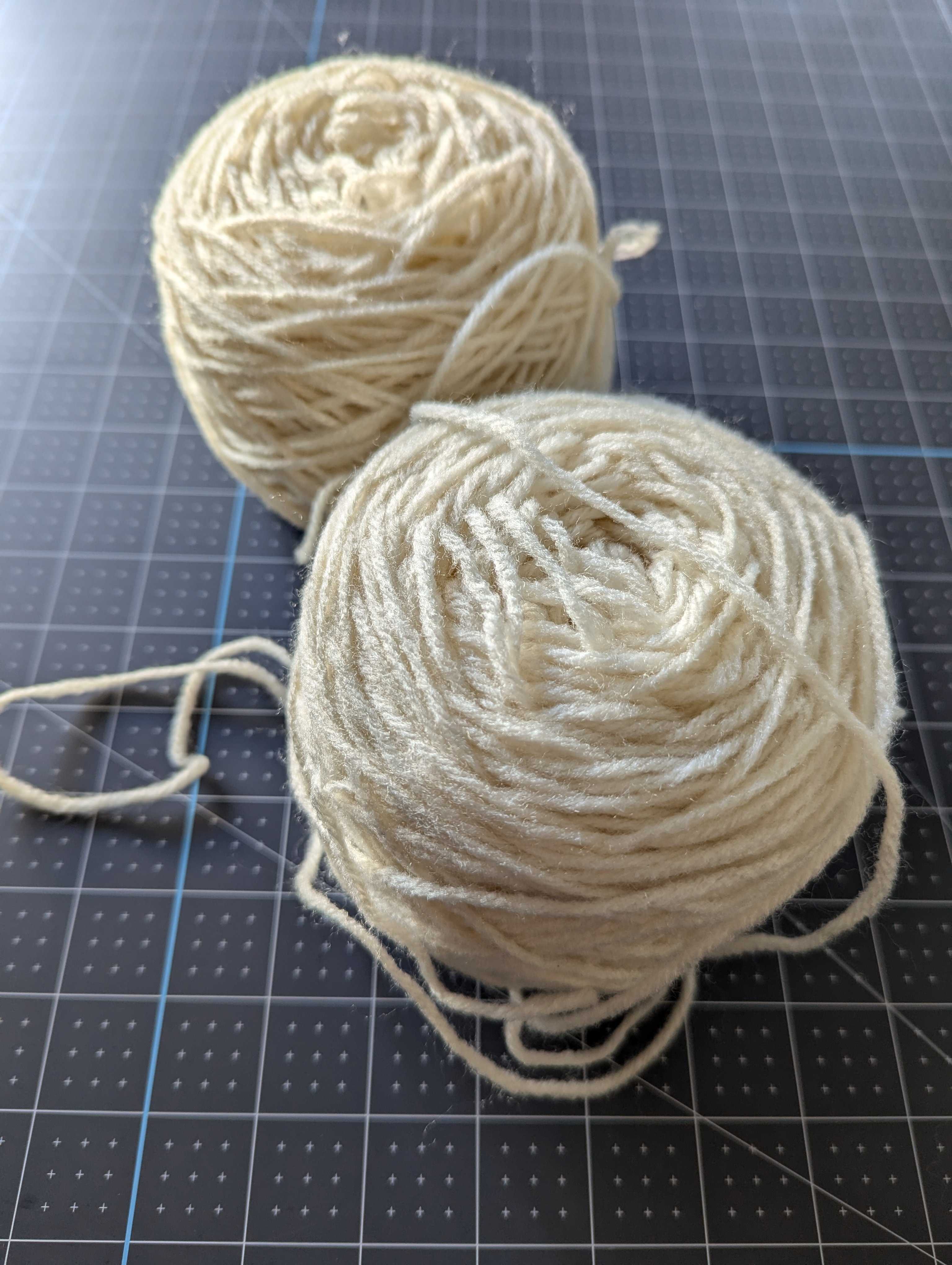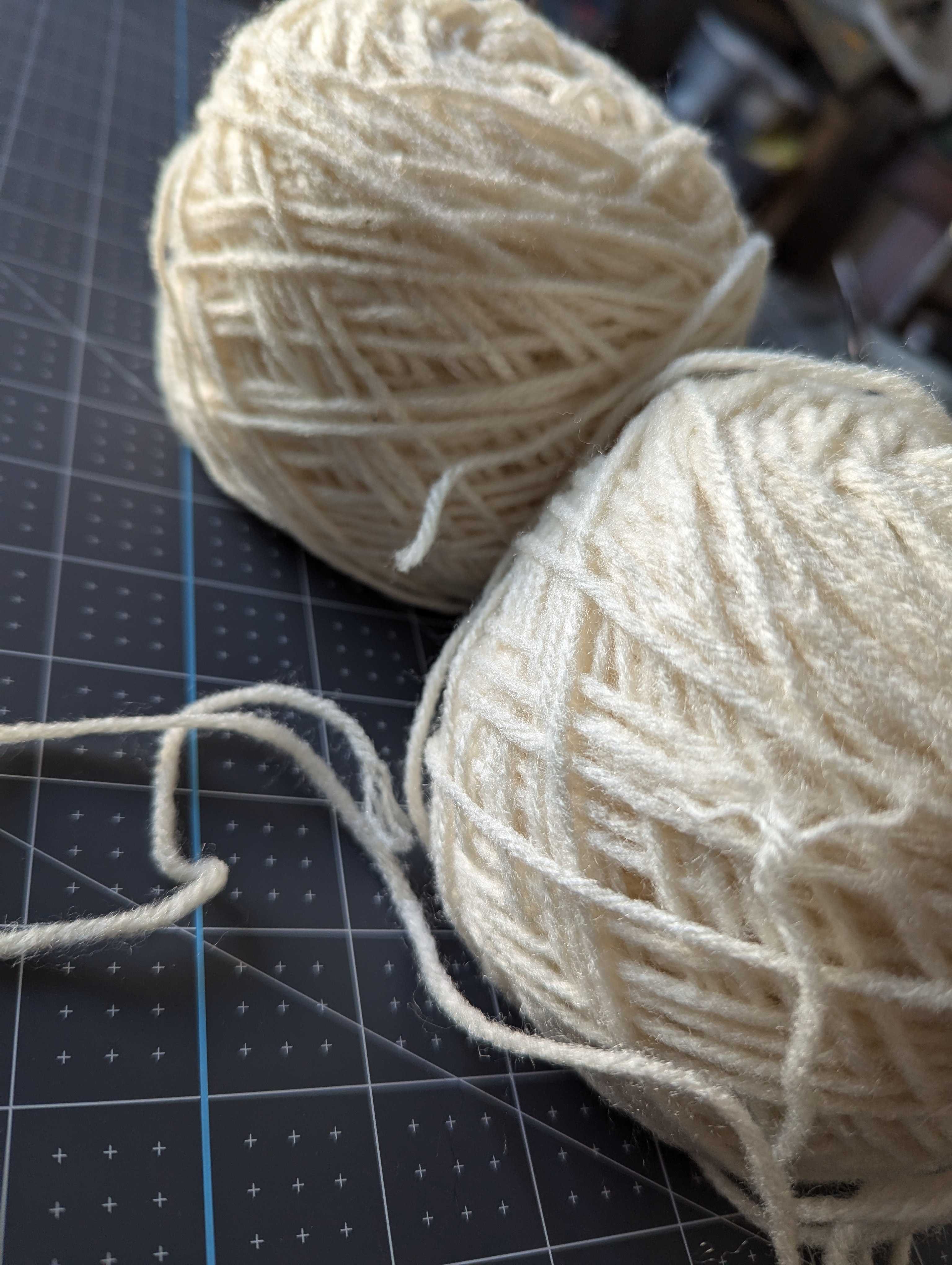 Two large balls of cream yarn. Hate to see these hit the waste bin, hoping someone can make something lovely from them. Length unclear, but weight totals 6.2 ounces. No tags or other info.