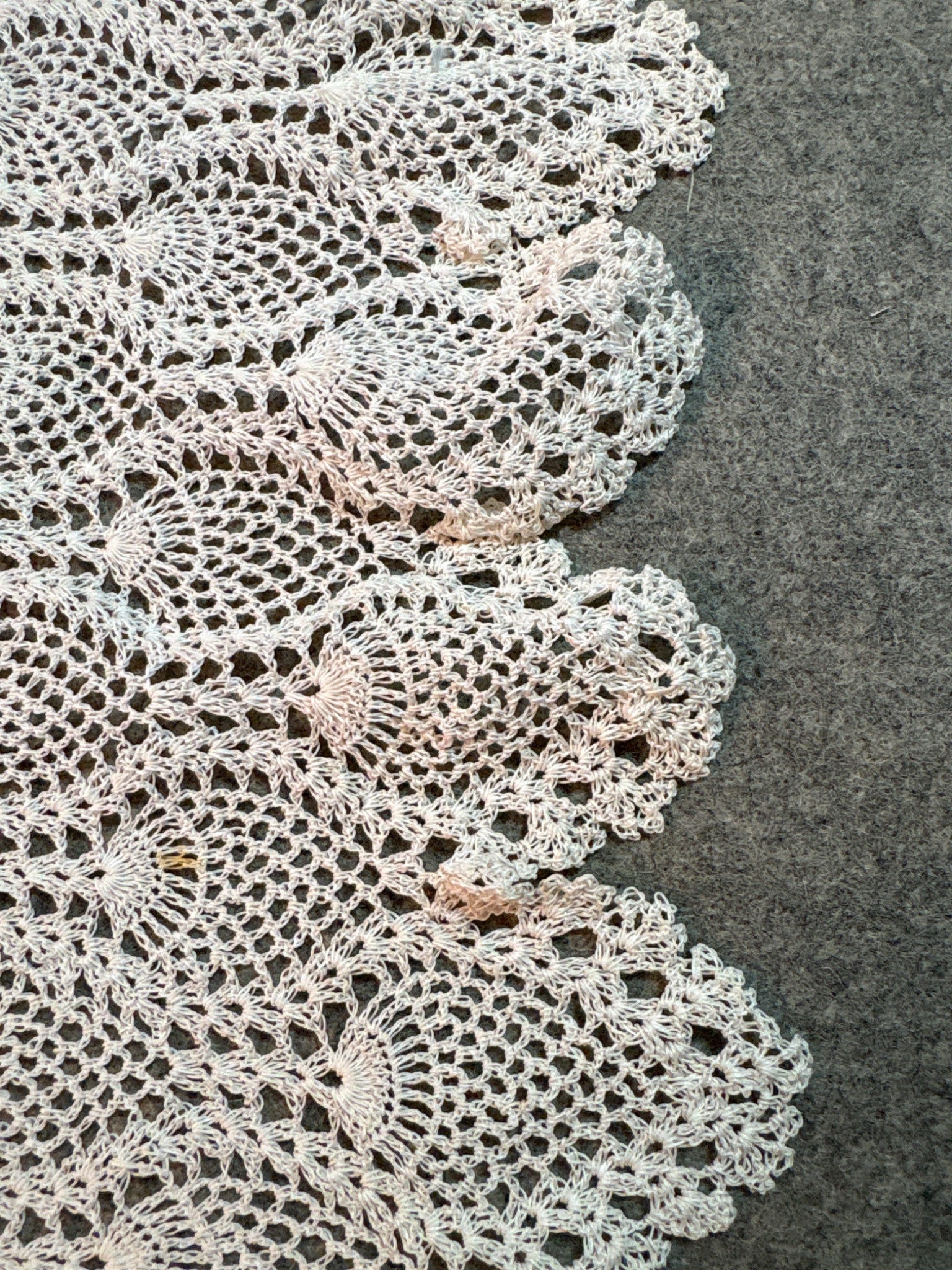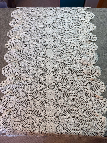 Feels like a rayon or rayon blend thread, 14" x 36", perfect crochet runner