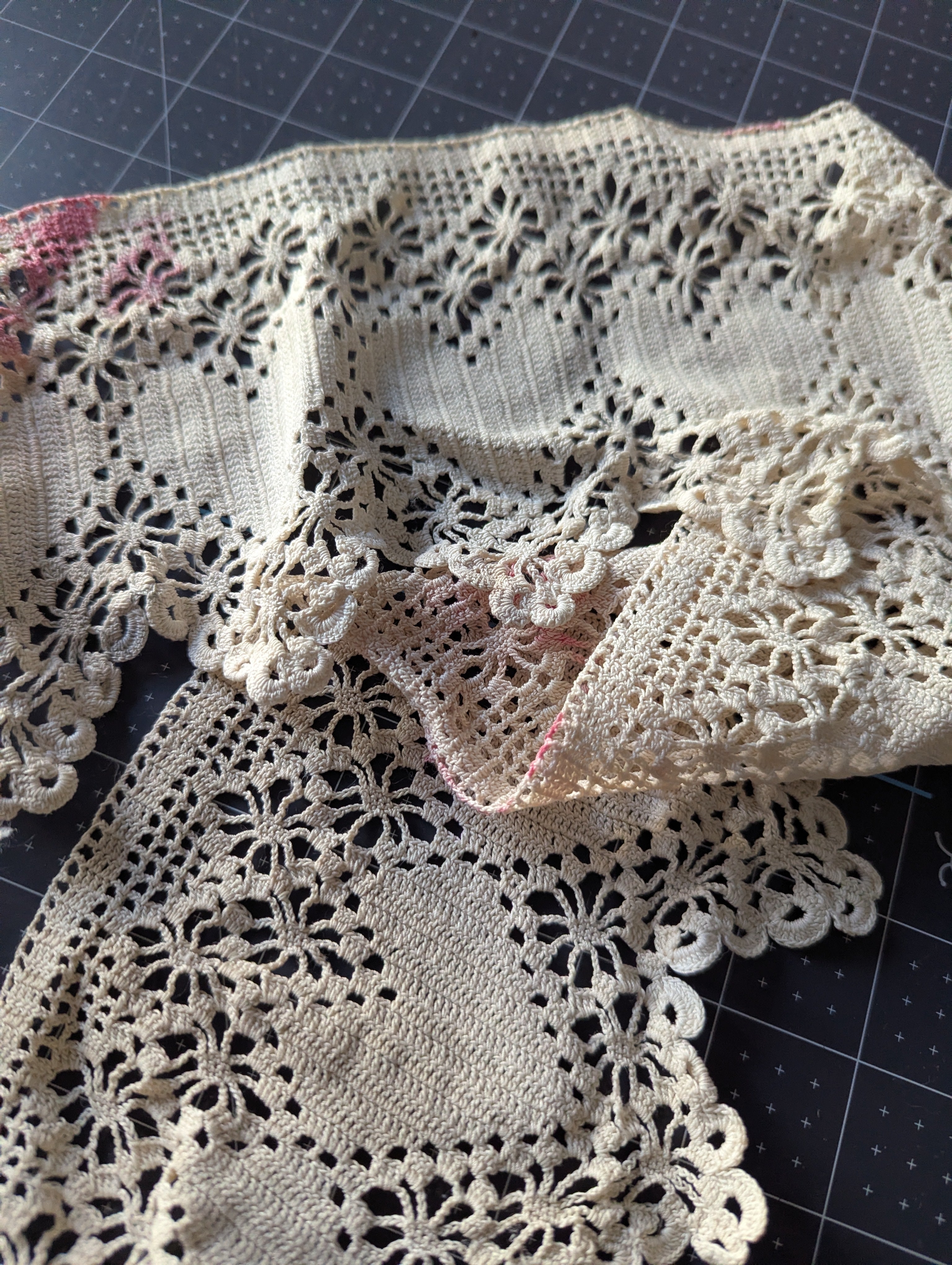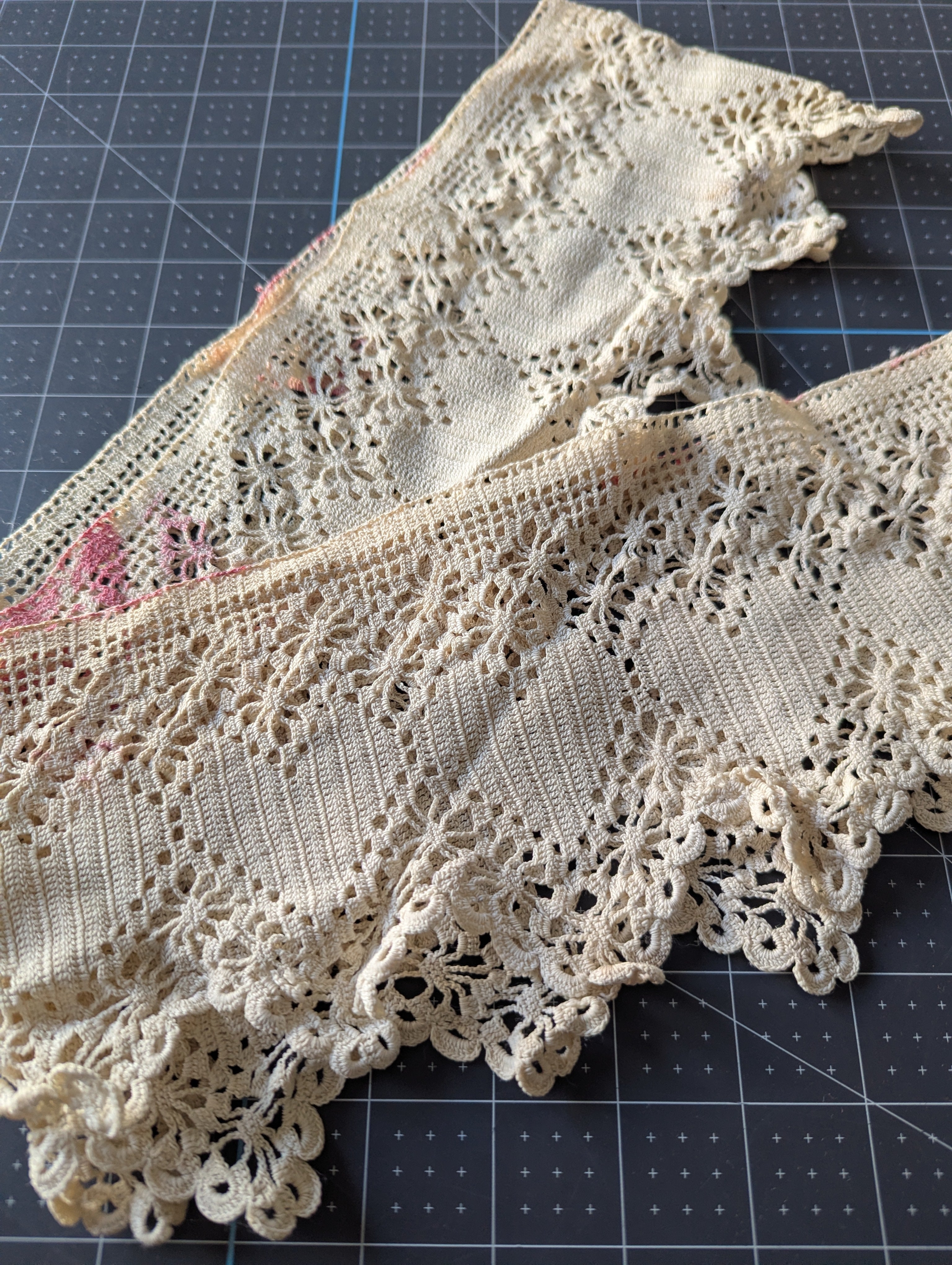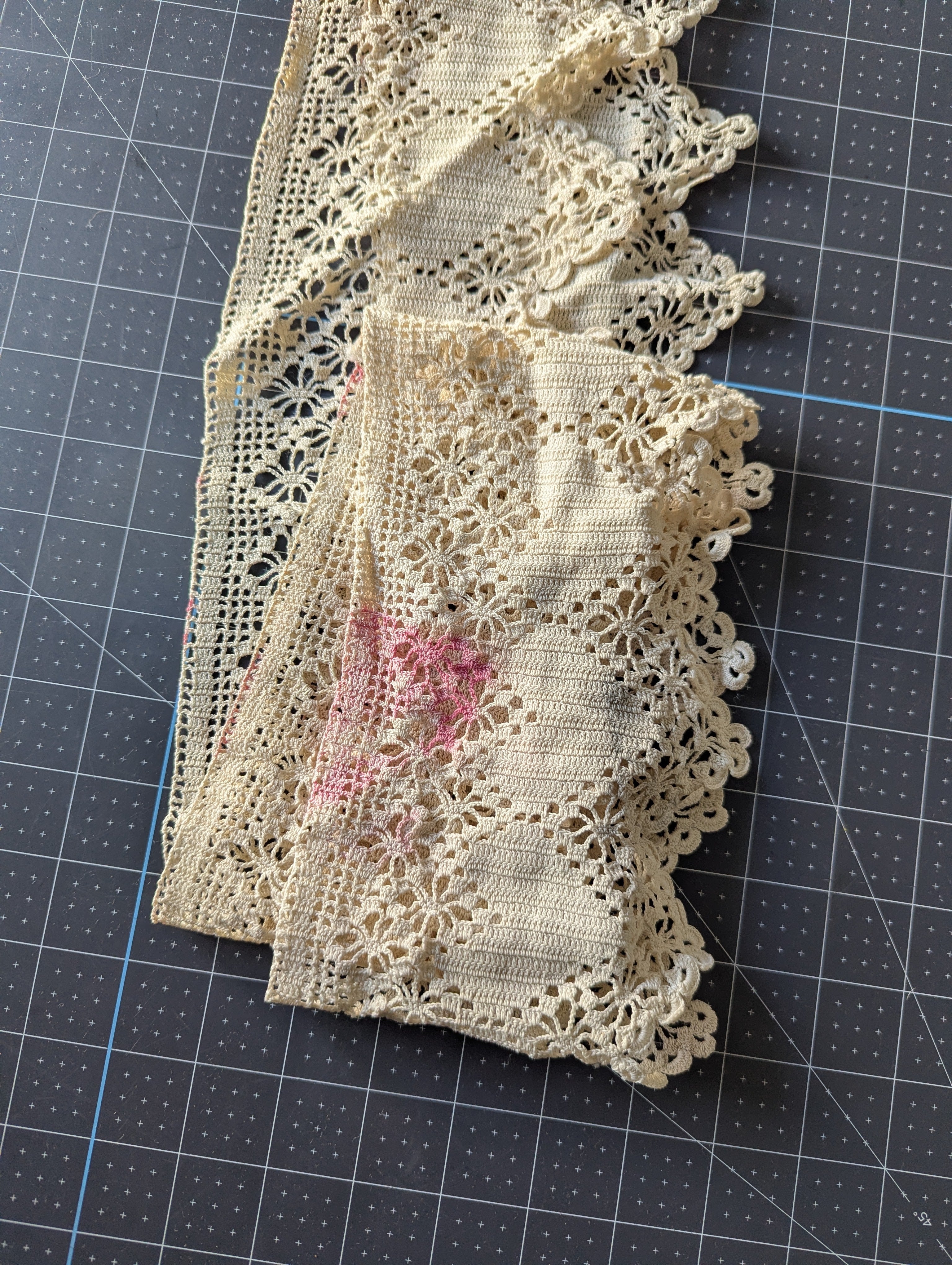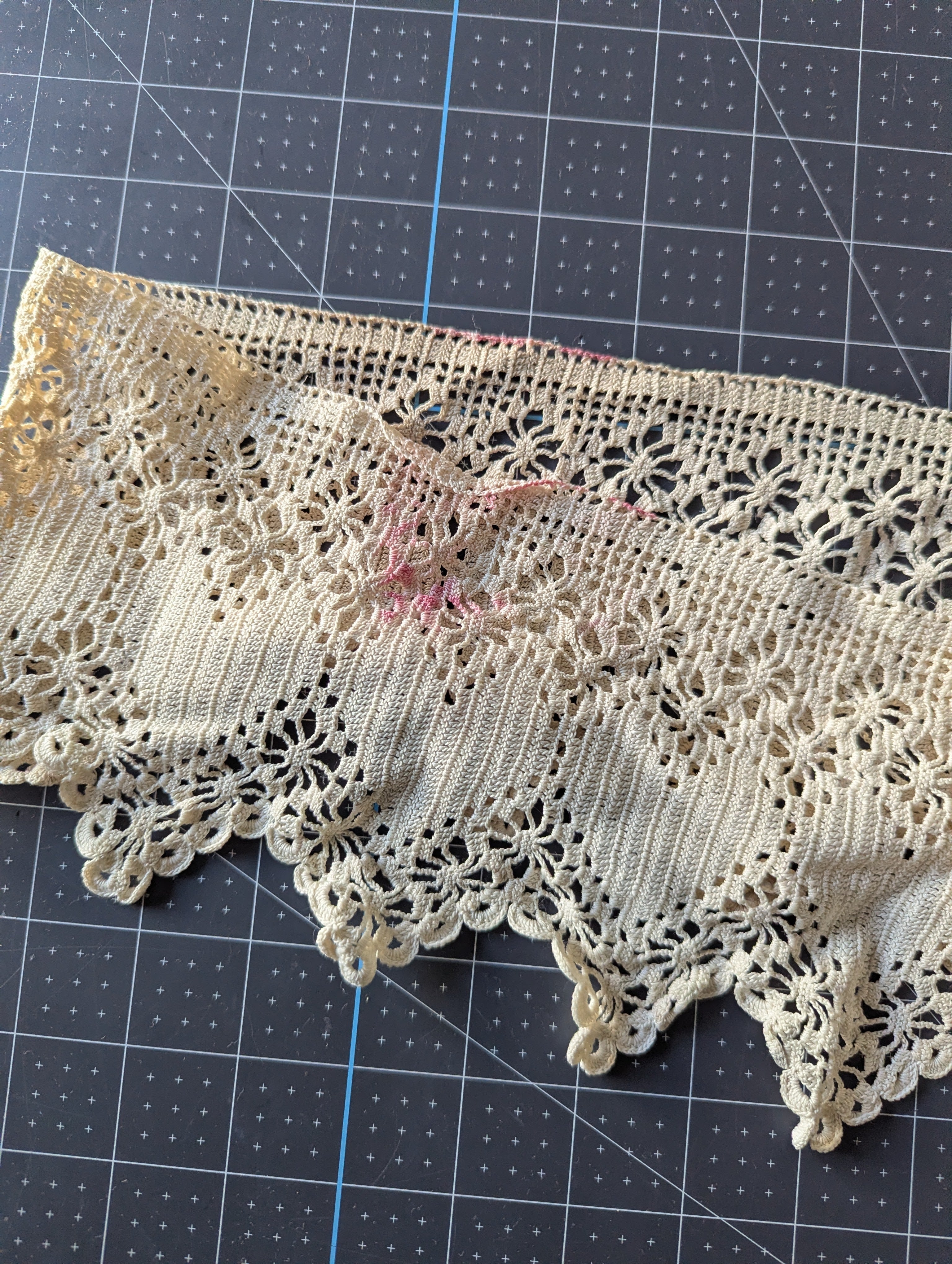 This piece has stains and should be considered for upcycle use. It was washed due to being a rescue from a wet bin and does have a detergent smell.