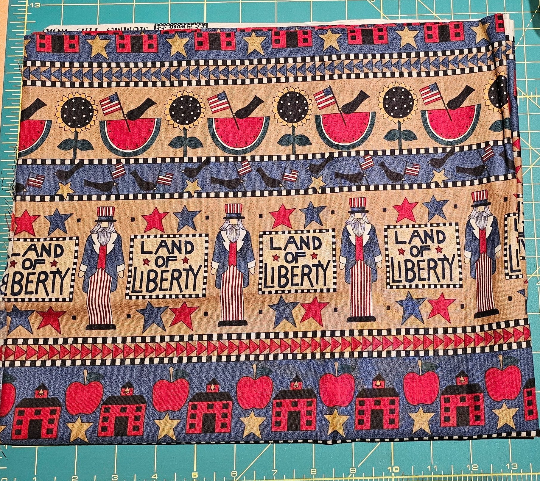 Fabric 1.5 yards Land of Liberty Dark Red & Blue Schoolhouse Stars Sunflower Watermelon Blackbird