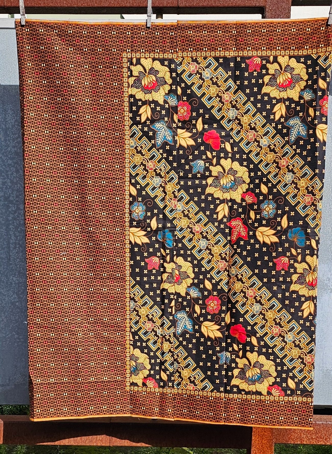 This is a second hand but brand new (sarong), cotton, batik dyed. Has labels on it "Primisima cap Cent" "Motif Halus" "Batik Tulis Halus Super Solo Asli"
