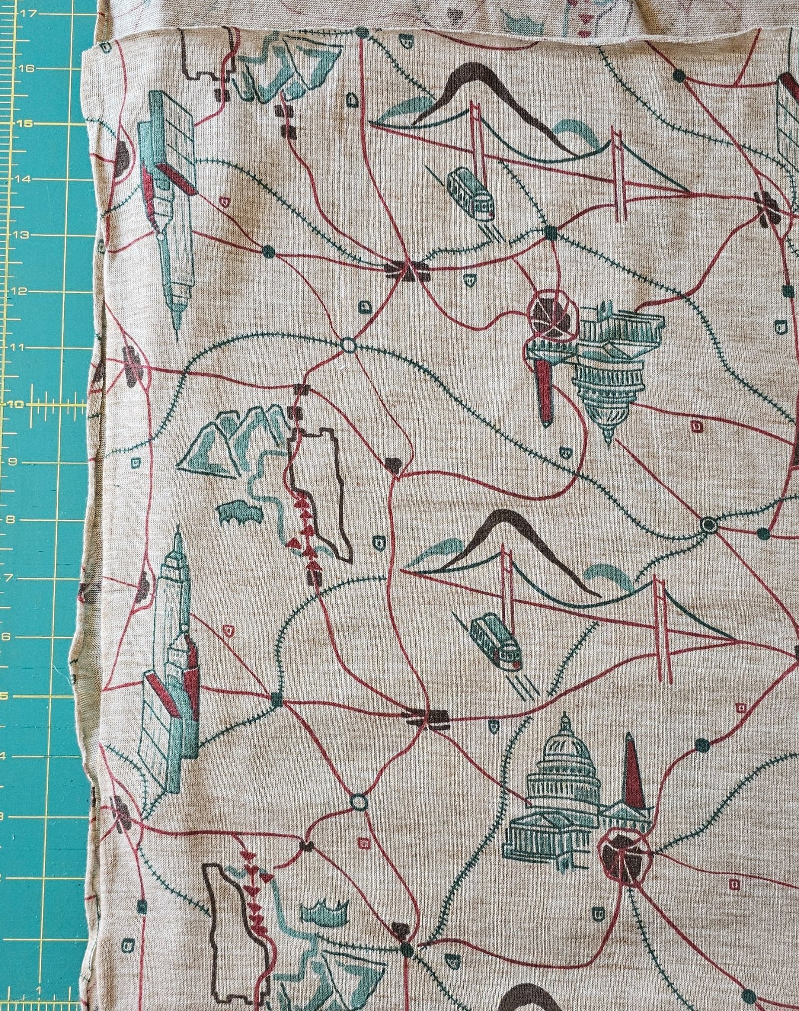 Fabric Jersey Knit Vintage Stretch Brown Green Red Map Landmarks Roads