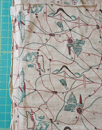 Fabric Jersey Knit Vintage Stretch Brown Green Red Map Landmarks Roads 72"x60" (2 Yards)
