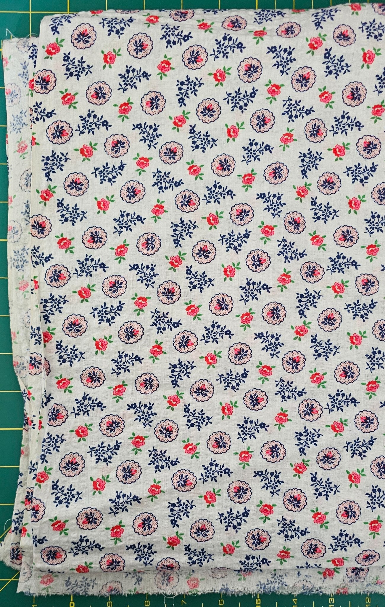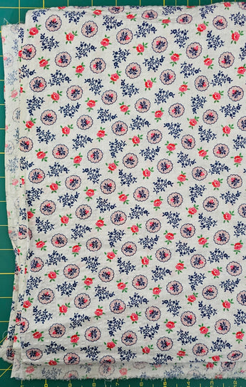 Super cute blue, red, pink, green floral motif on a white background.