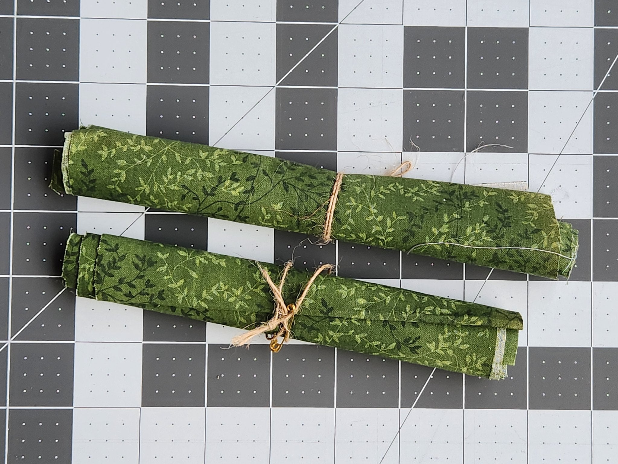 Two rolled scraps of green floral fabric. Yardage unknown but weighs approximately 1.3 oz.