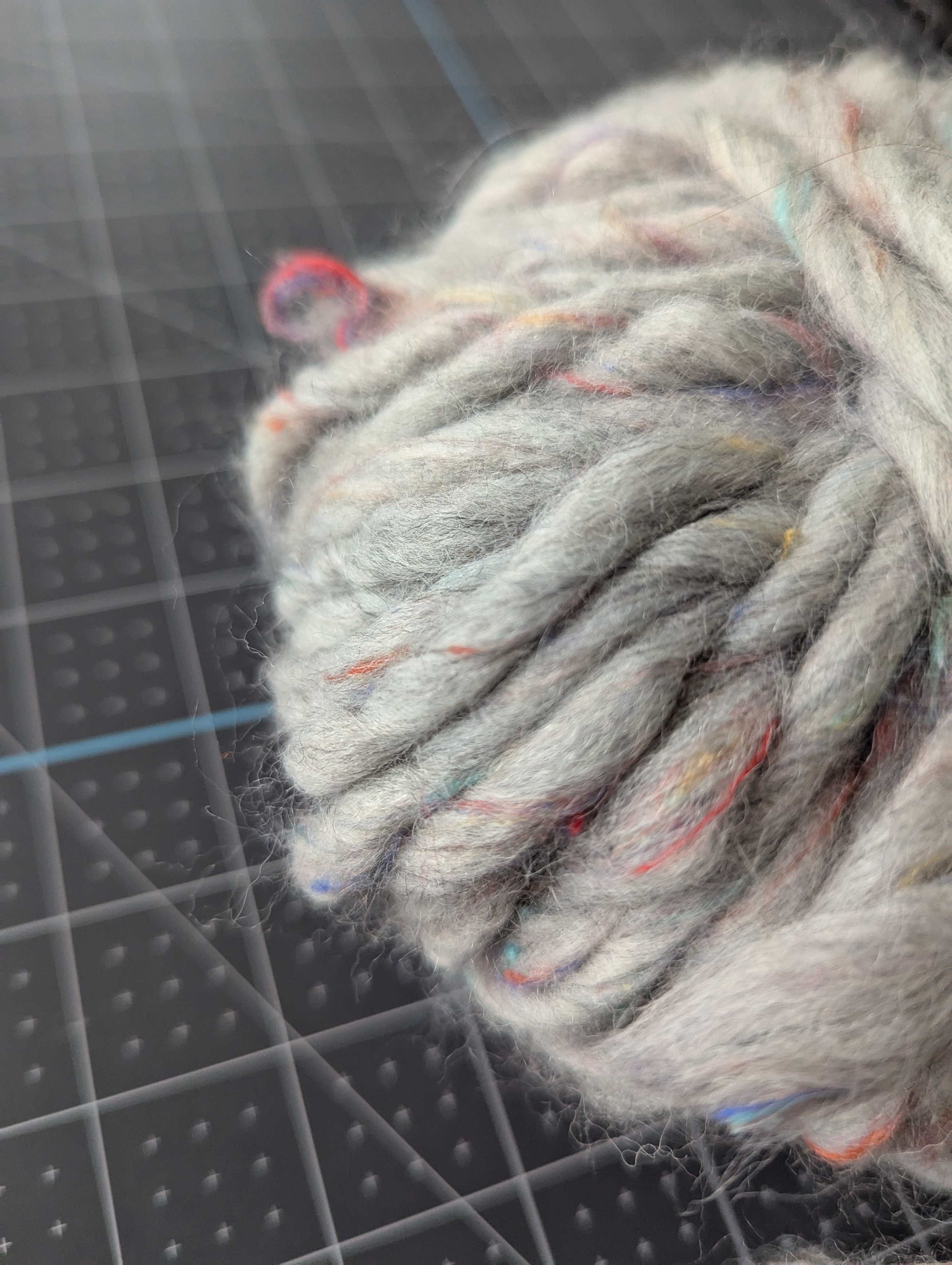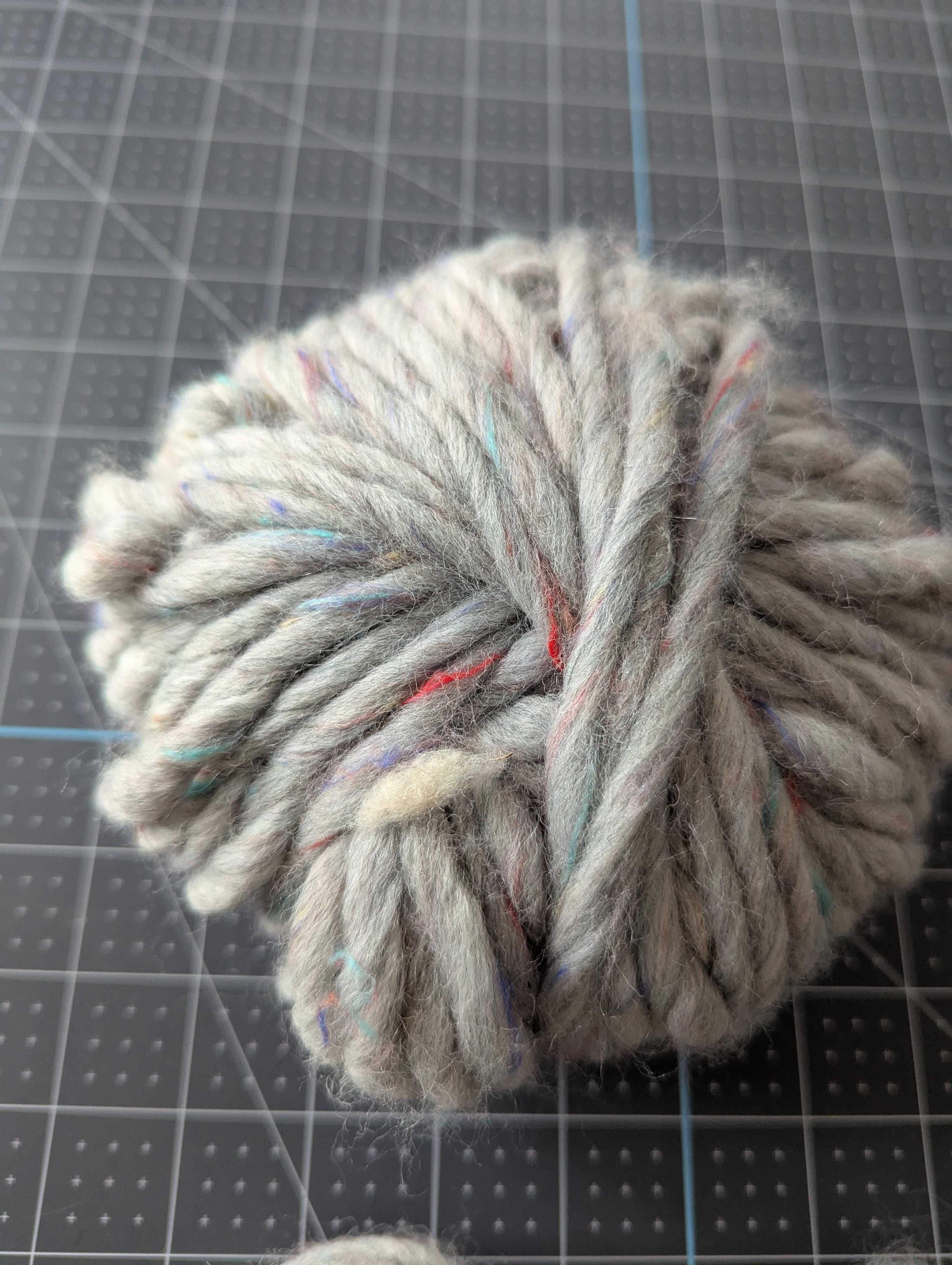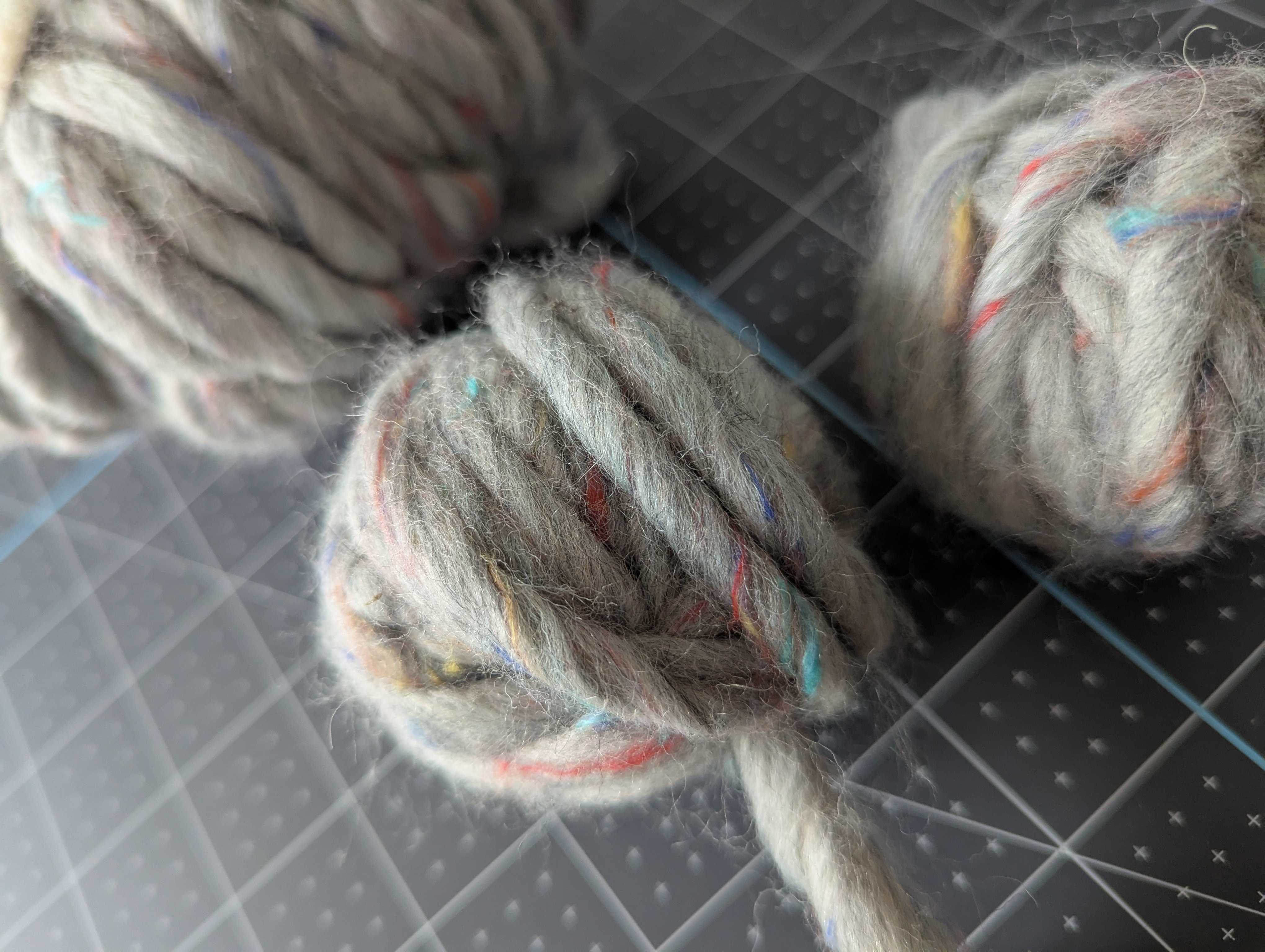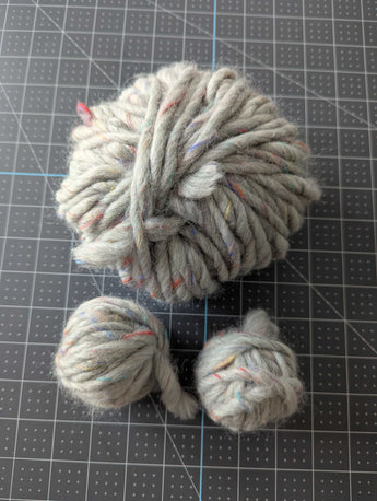 A set of grey speckled yarn remnants. Rolled into three balls, not much remains but there is 4.8 usable ounces here we hope someone can use and love.