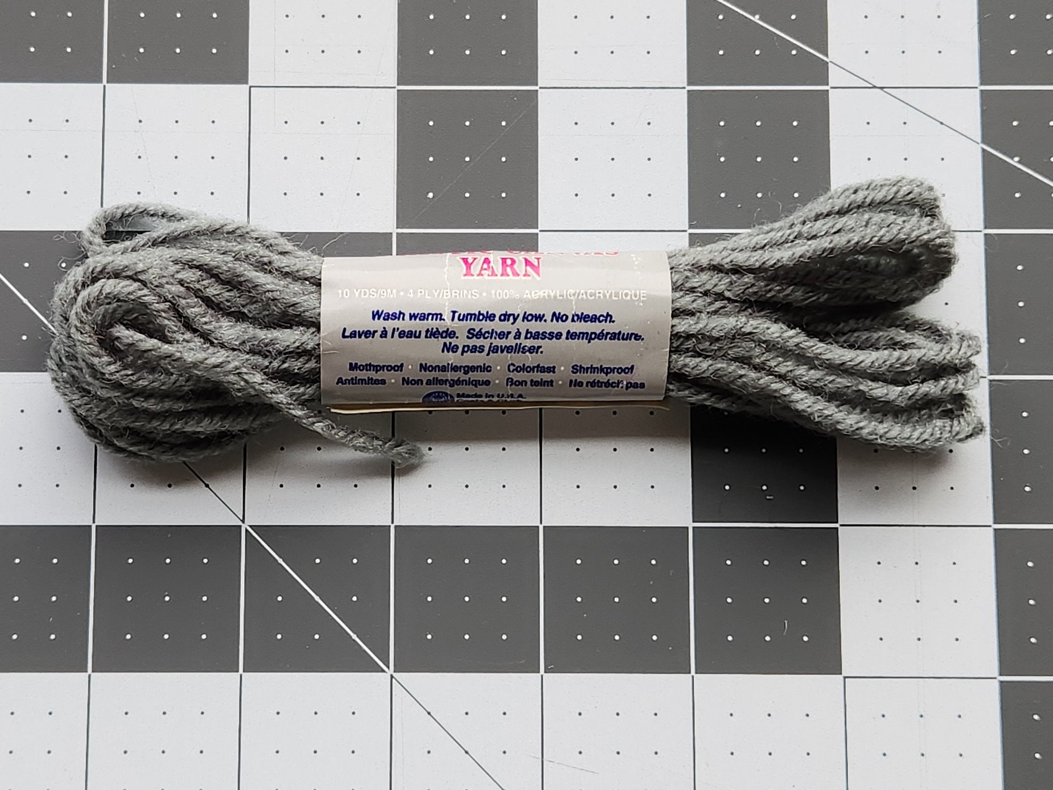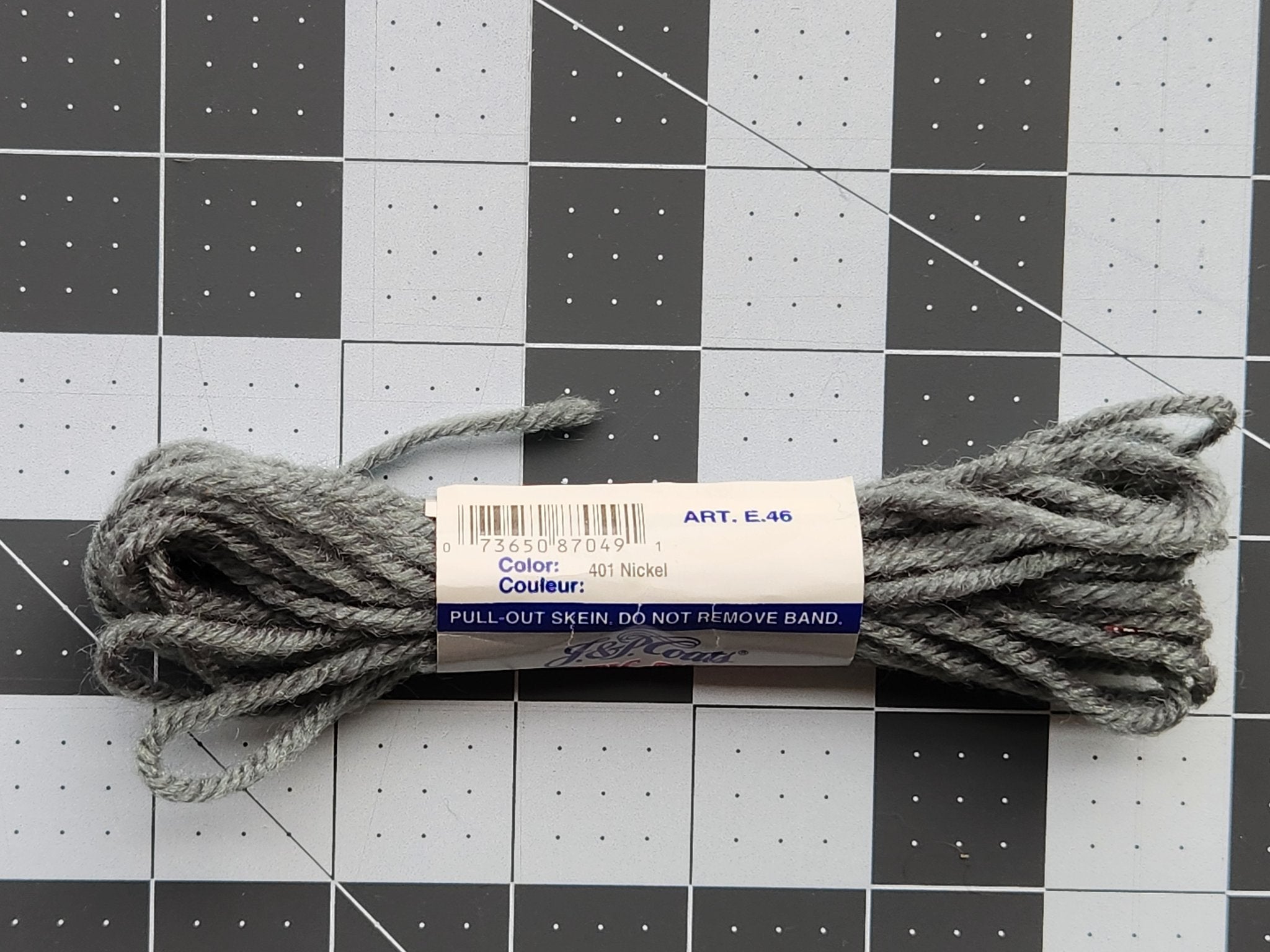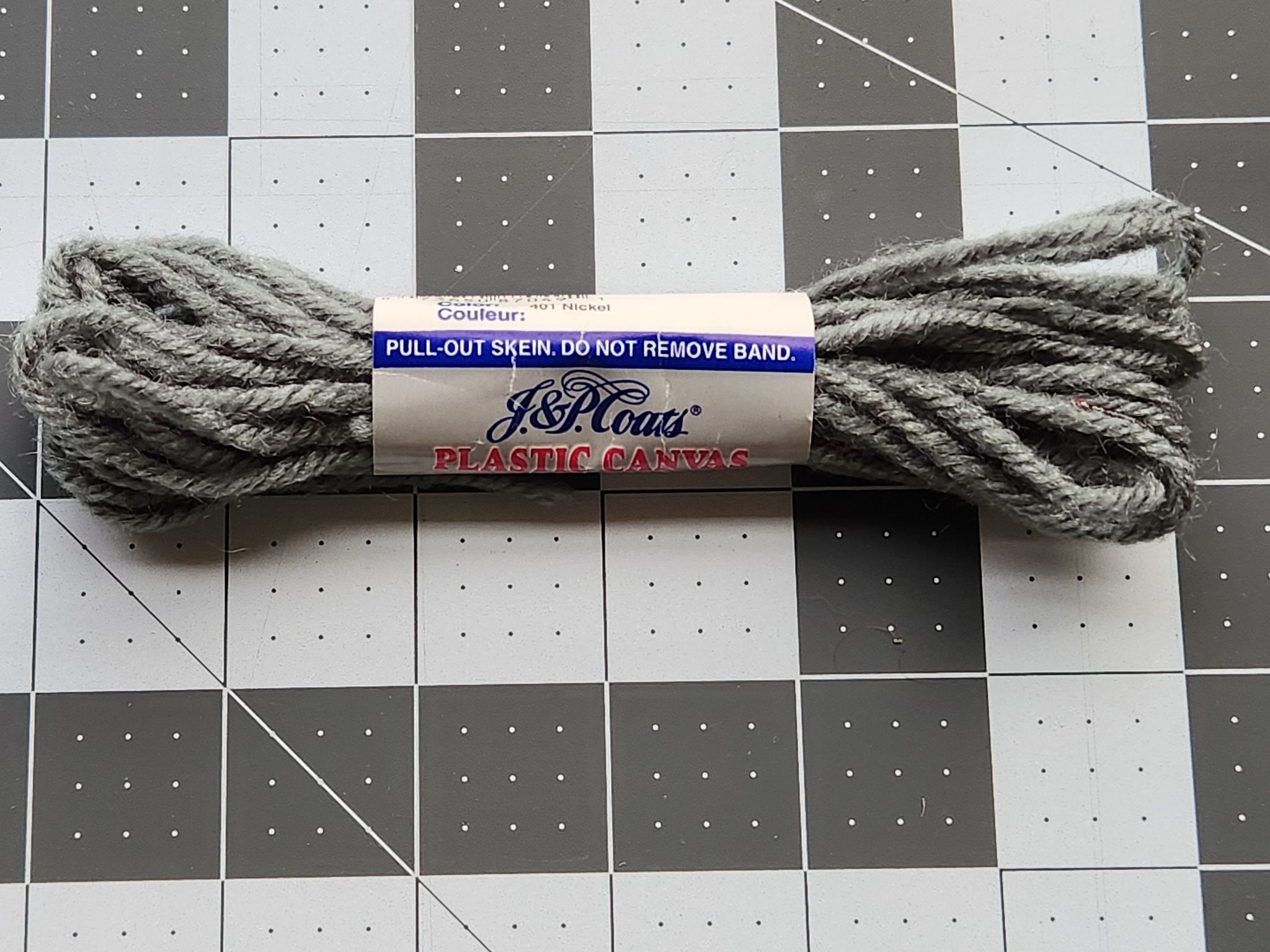 1 skein of J. & P. Coats brand plastic canvas yarn. Packaging states that it is 10 yards, 4-ply, 100% acrylic. It appears to be unused. The color looks gray and is "401 Nickel"