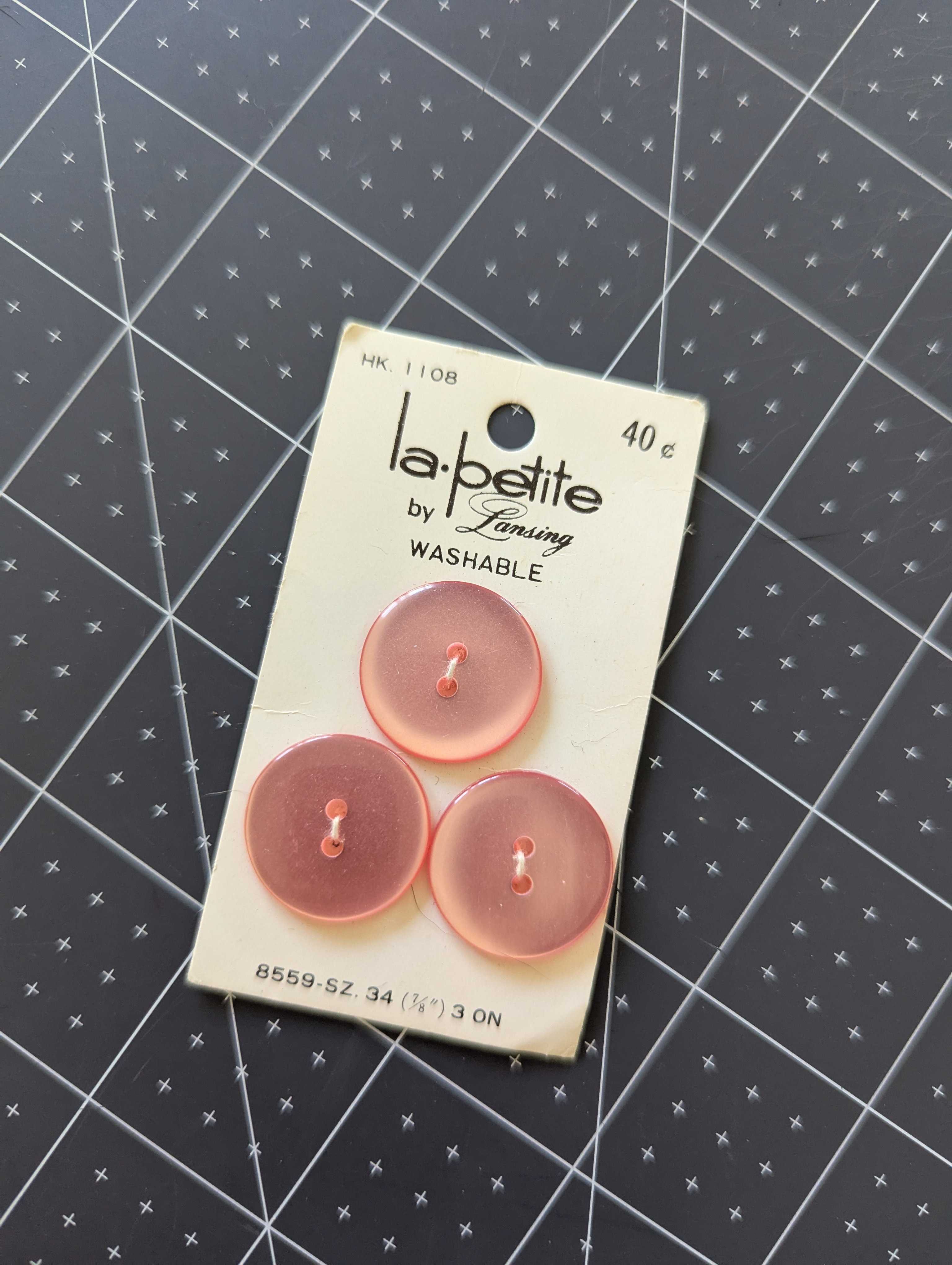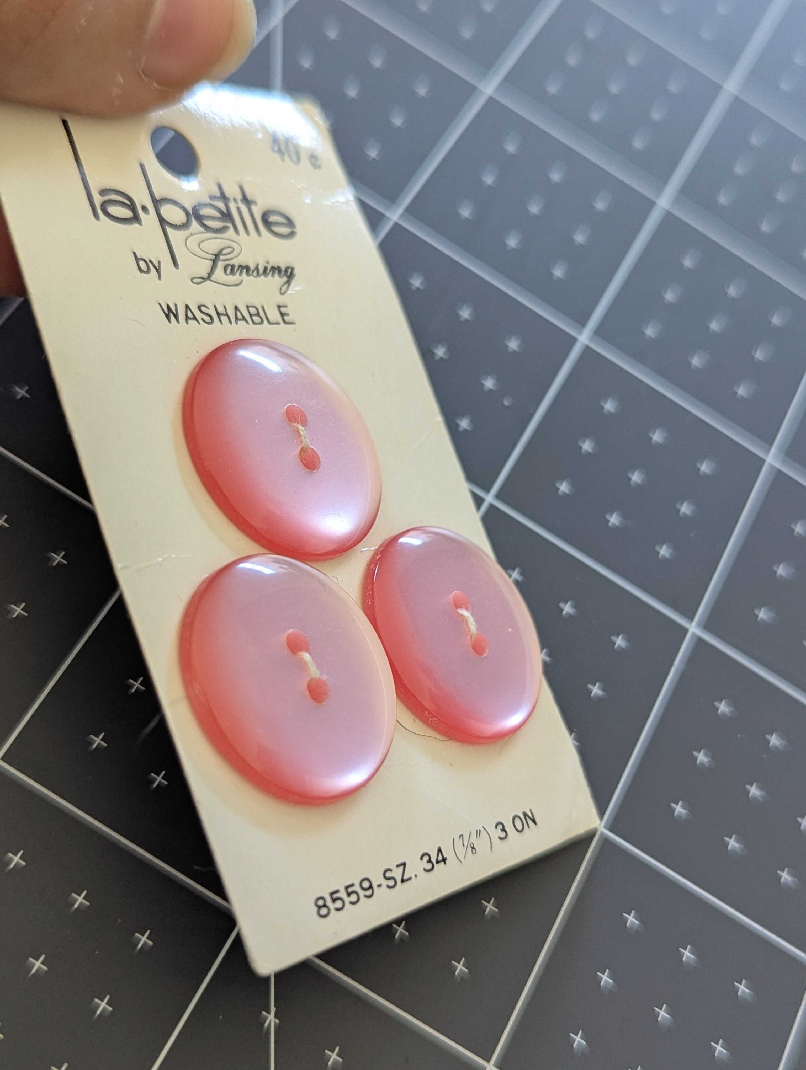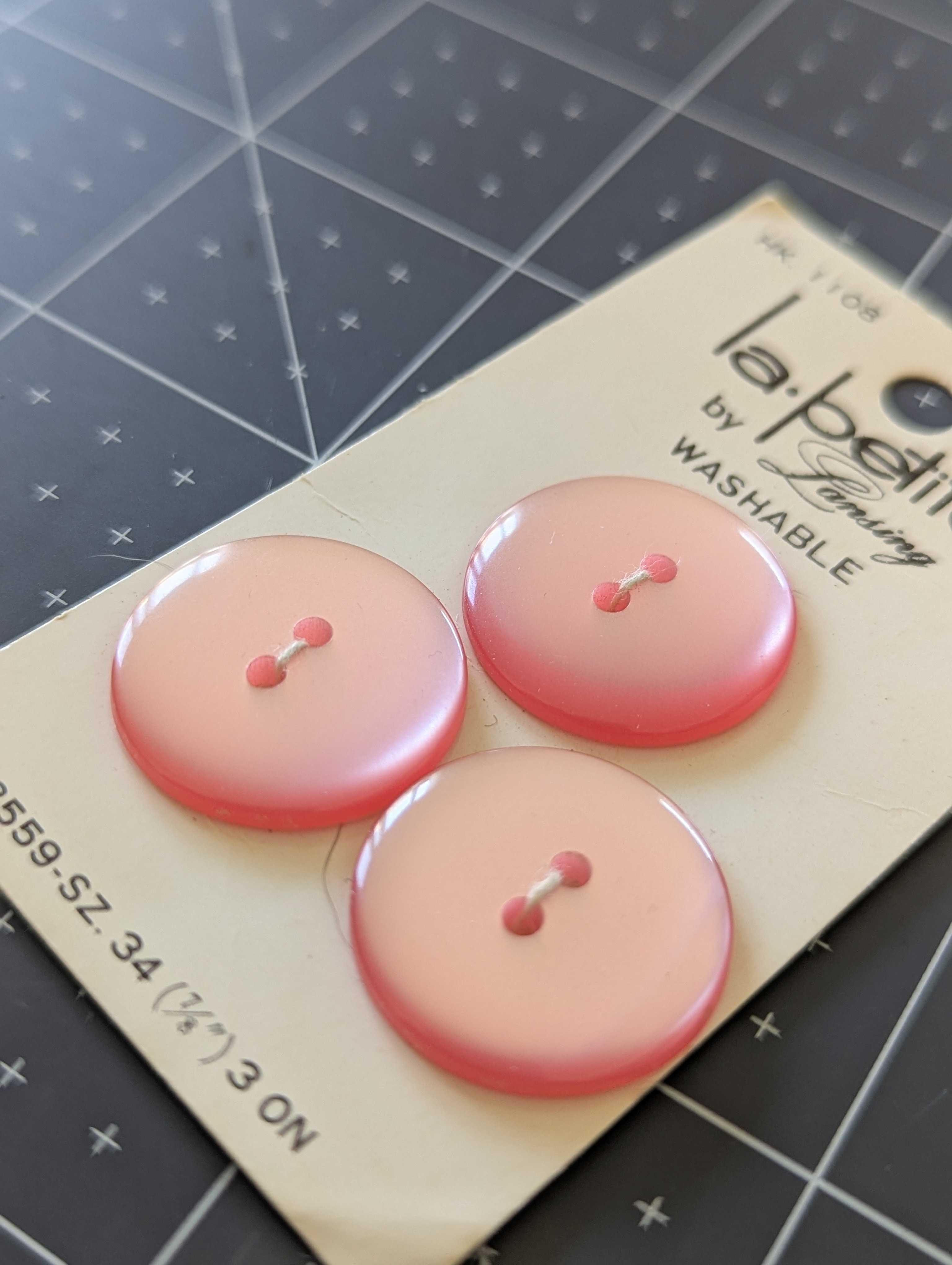 A set of three buttons, on original button card. Size 7/8 inch. Pink with a fiber optic look. Made in Japan.