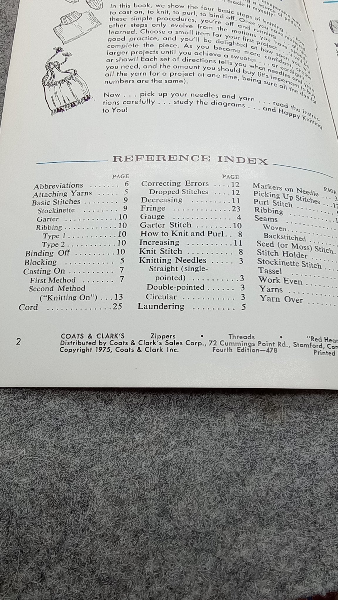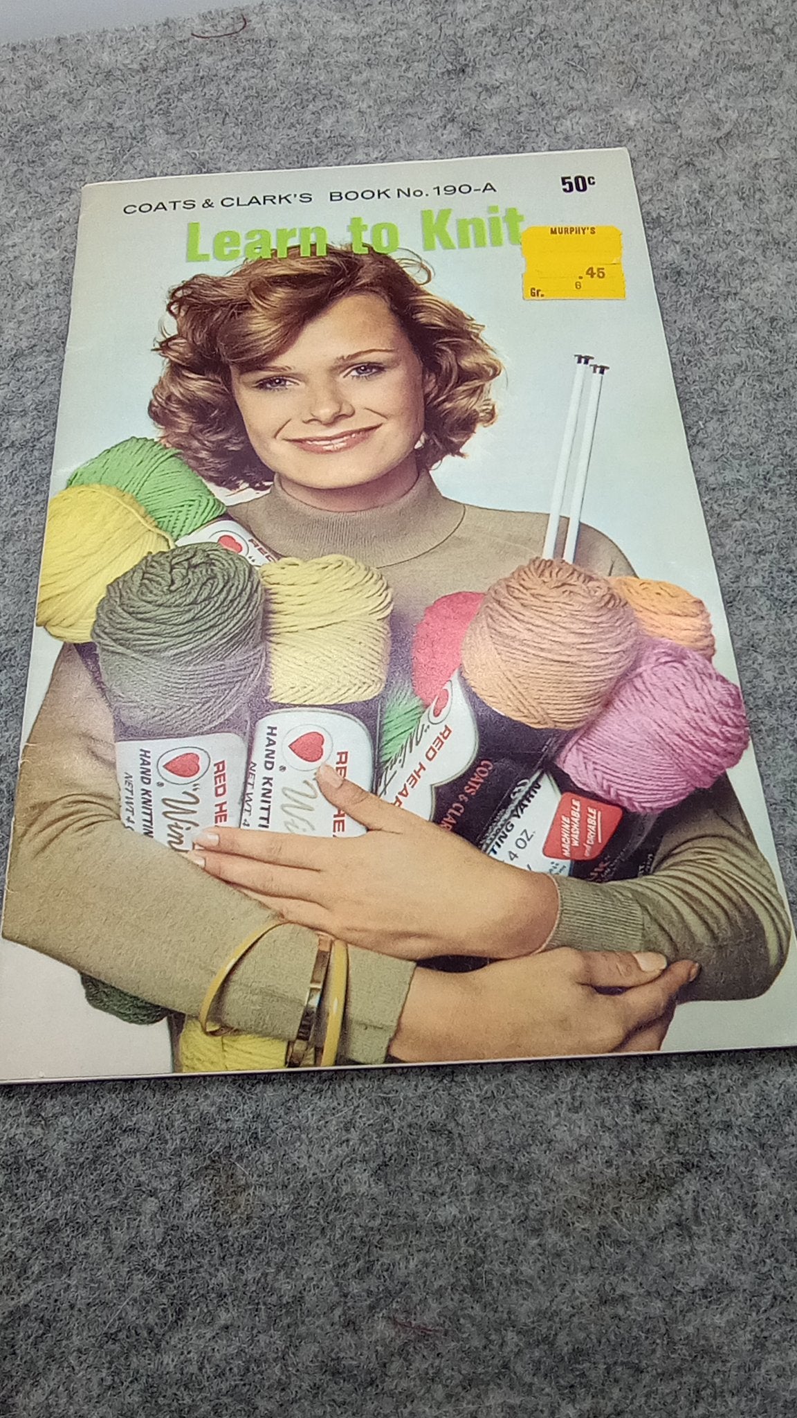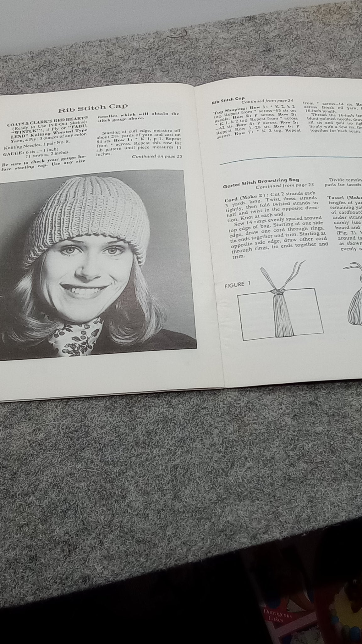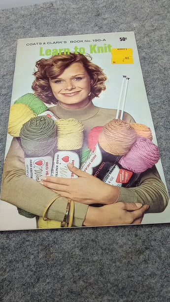 Coats & Clark's Book No. 190-A copywrite 1975. In pristine condition. 35 pages of instructions and simple patterns, including hat, slippers, vest, cardigan, shawl.