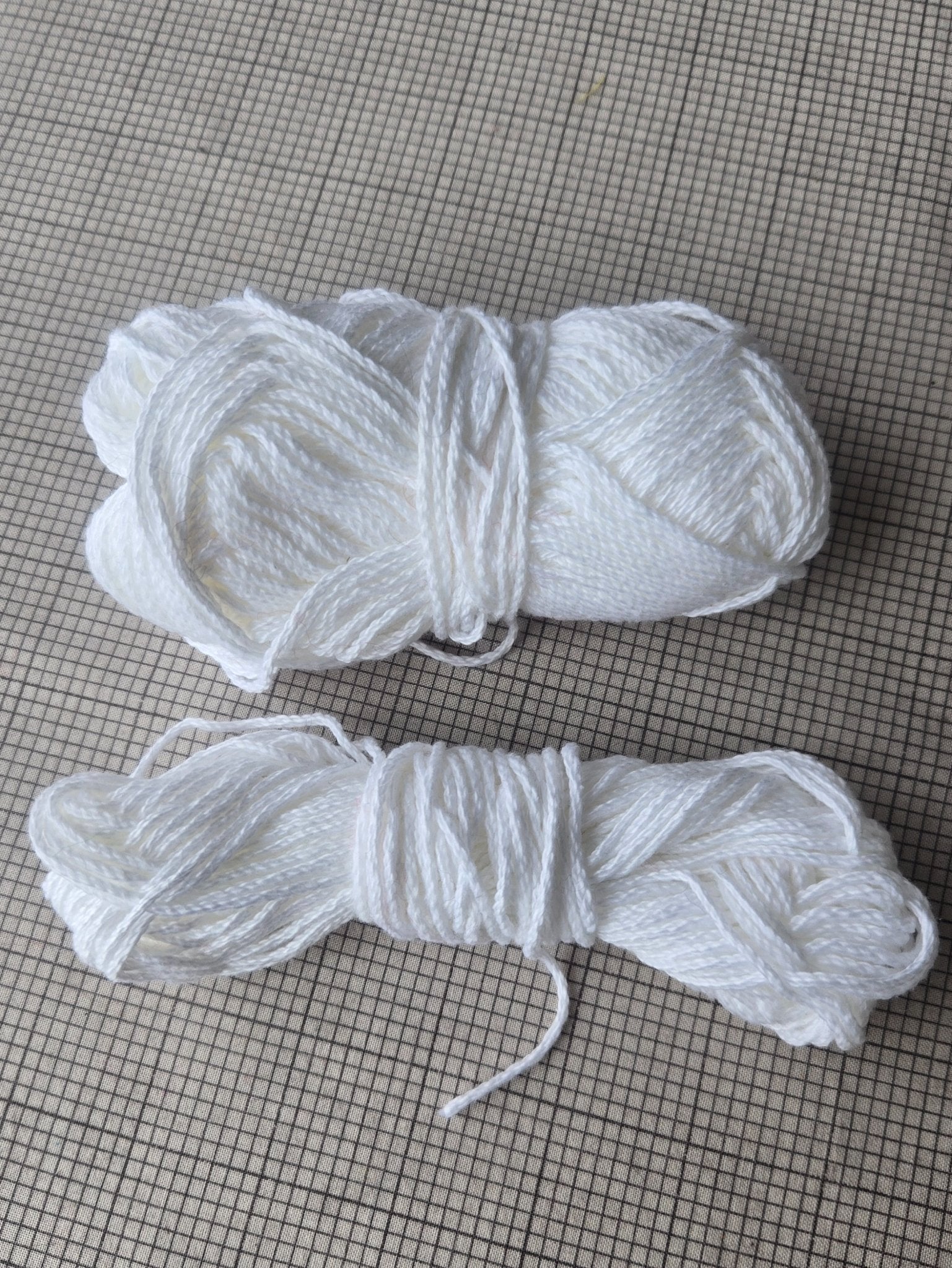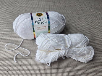 Lion Brand 24/7 Cotton white 100% mercerized cotton yarn. One new/unused 3.5 oz / 100 g skein and two smaller partial skeins. The smaller one weighs about 0.5 oz and the smaller about 1.5 oz.