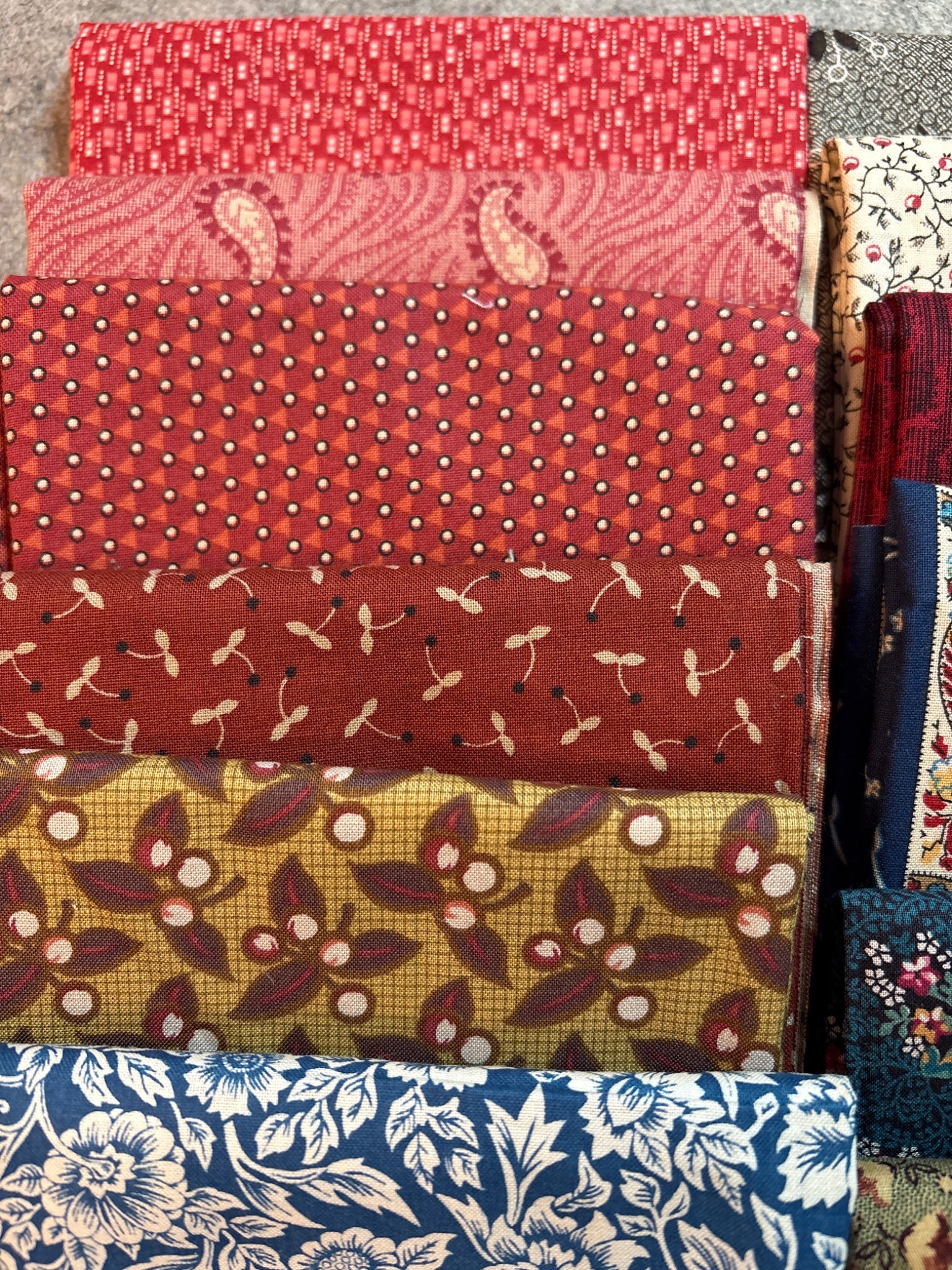 12 cotton fat quarters each approximately 18" x 21". Some have been pre washed. Kirk collection, Moda,windham, Marcus Judie Rothermel. Civil war and 1800's Repros.