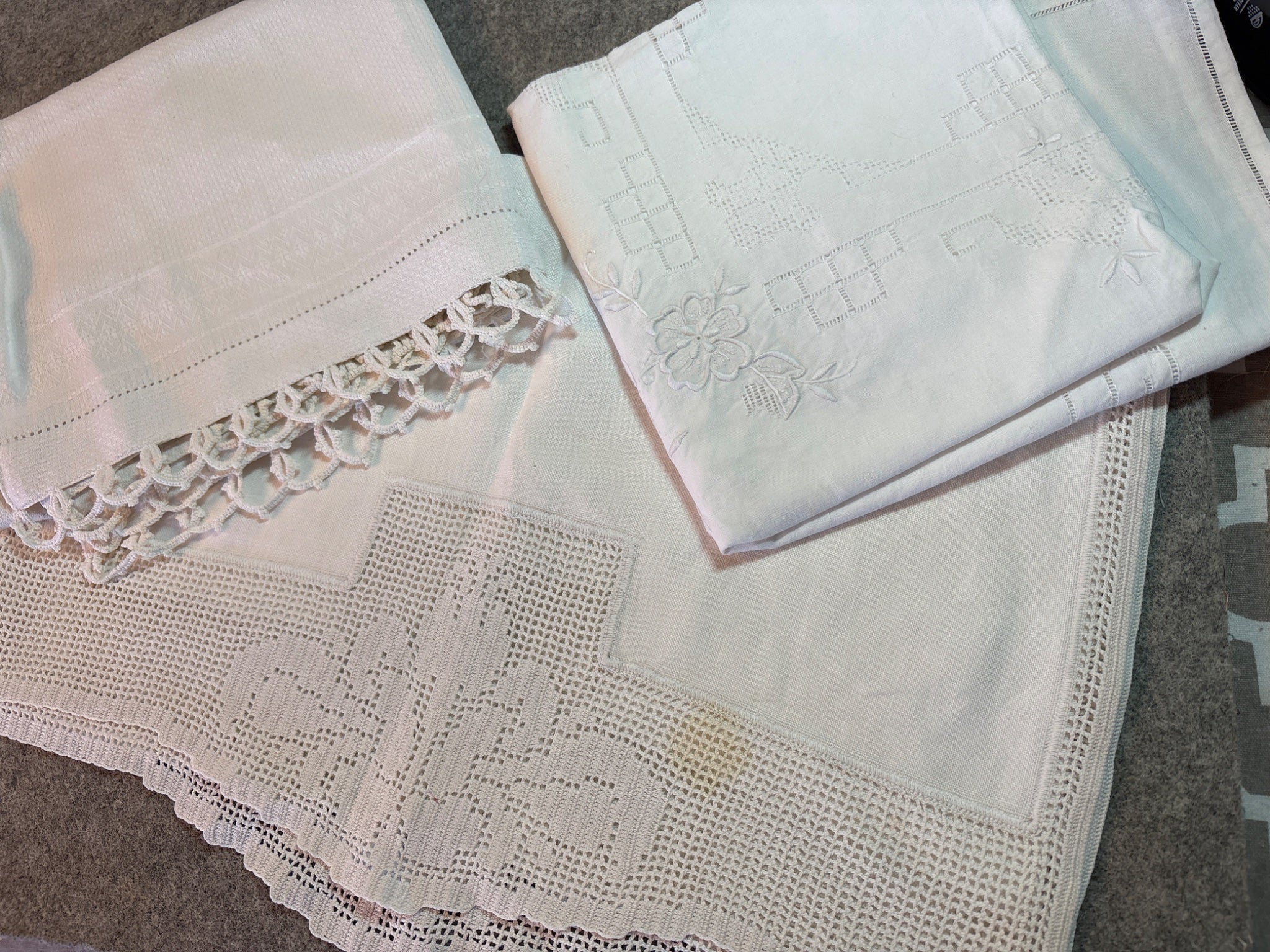 Lot of 3 Antique linens white on white crochet embroidery