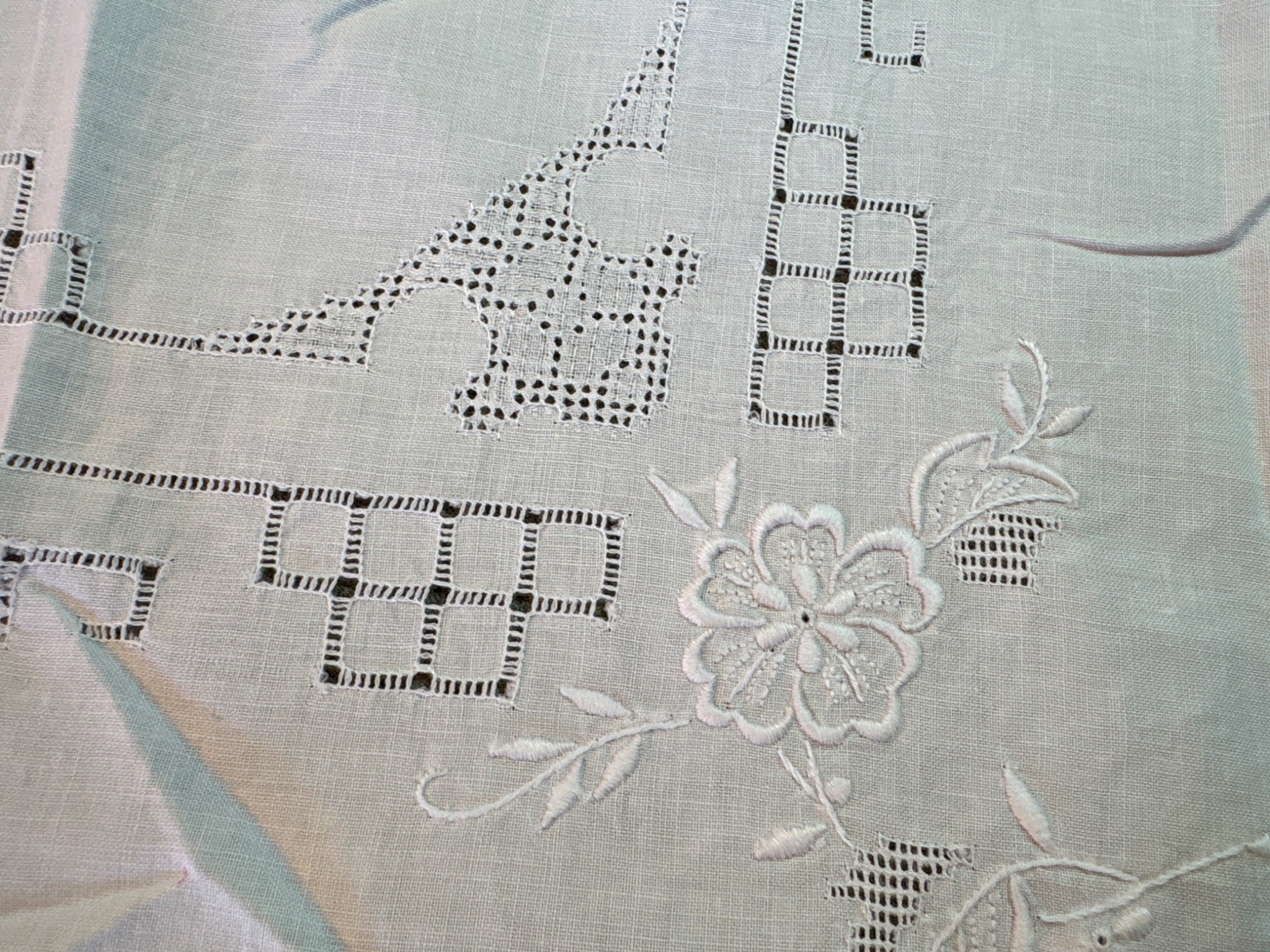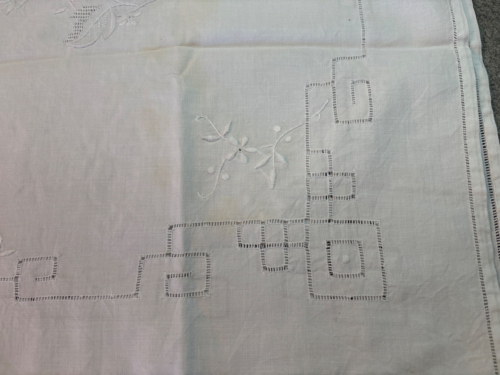 - square cotton table topper with Madeira like embroidery 30" x 32"