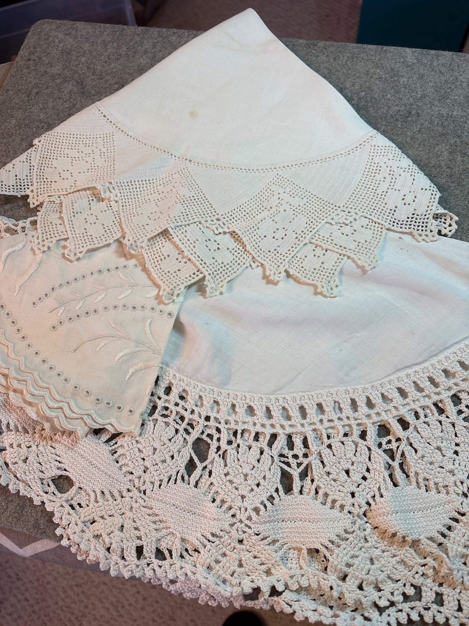 Lot of 3 Antique Vintage round linens whites crochet embroidered