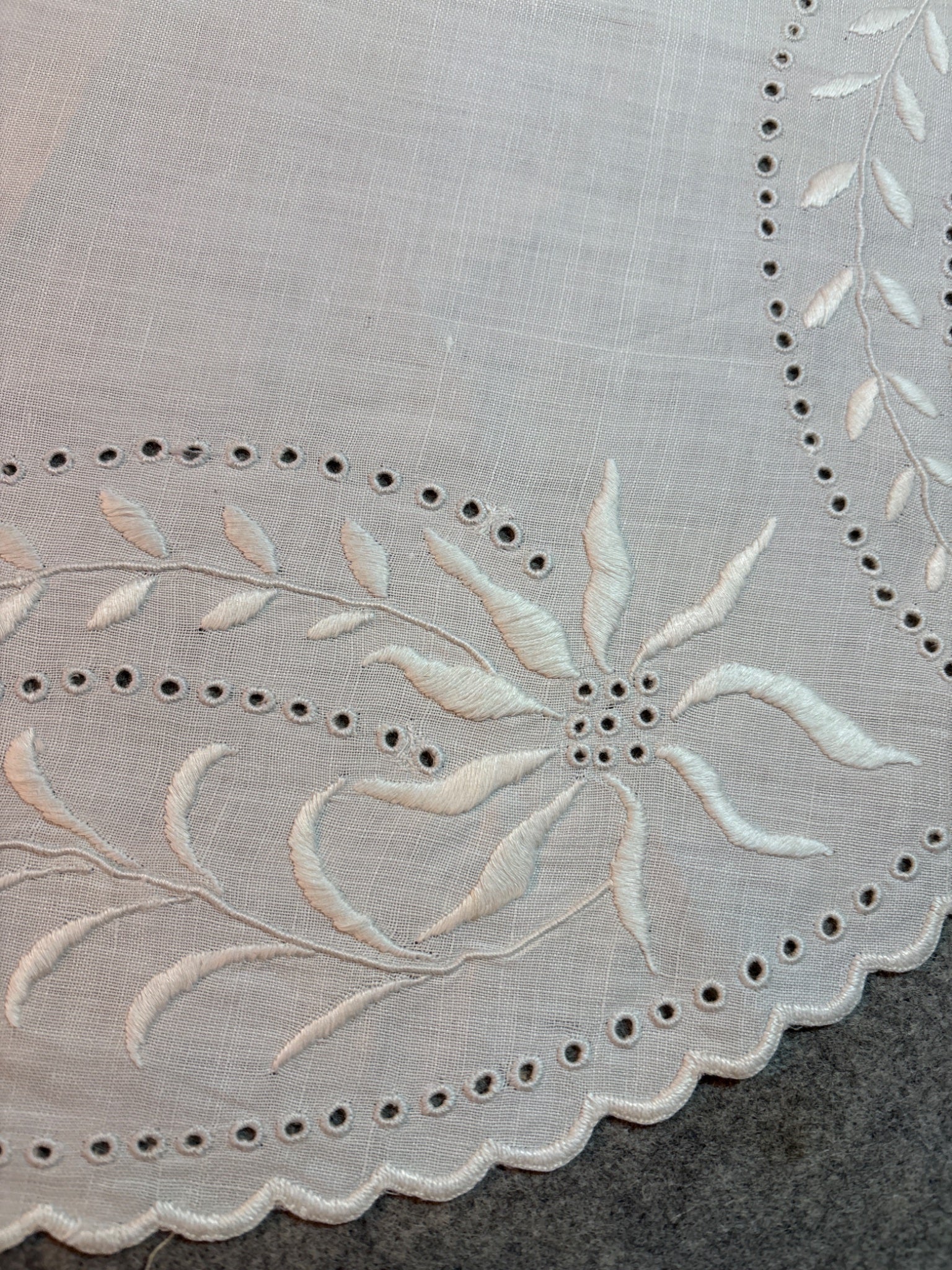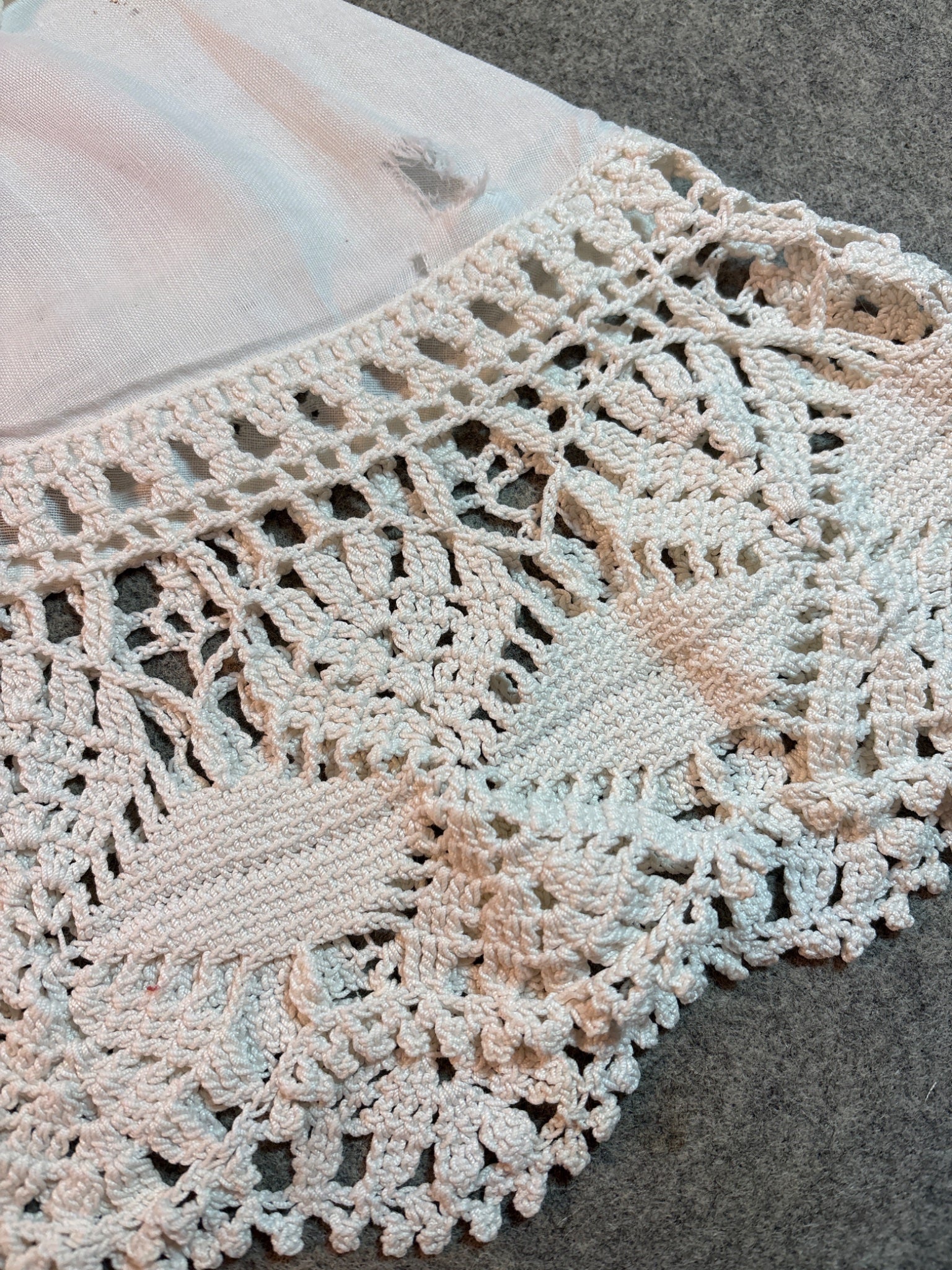 - 24" round linen with 4" filet crochet a few light stains no holes