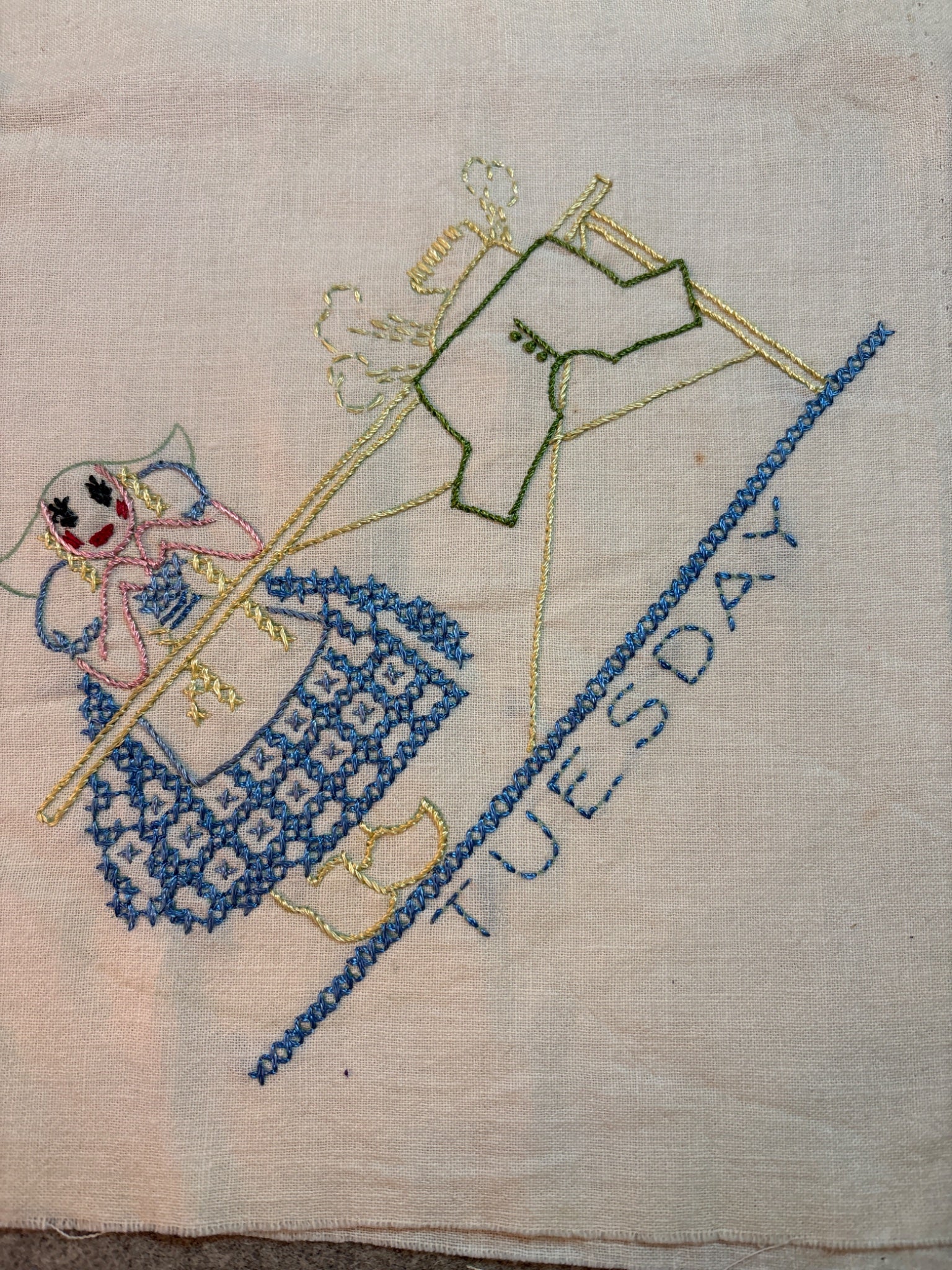 The Tuesday is an unfinished sack that has never been washed and needs a soak, the other 2 are lightly used. The motifs are 8-10",