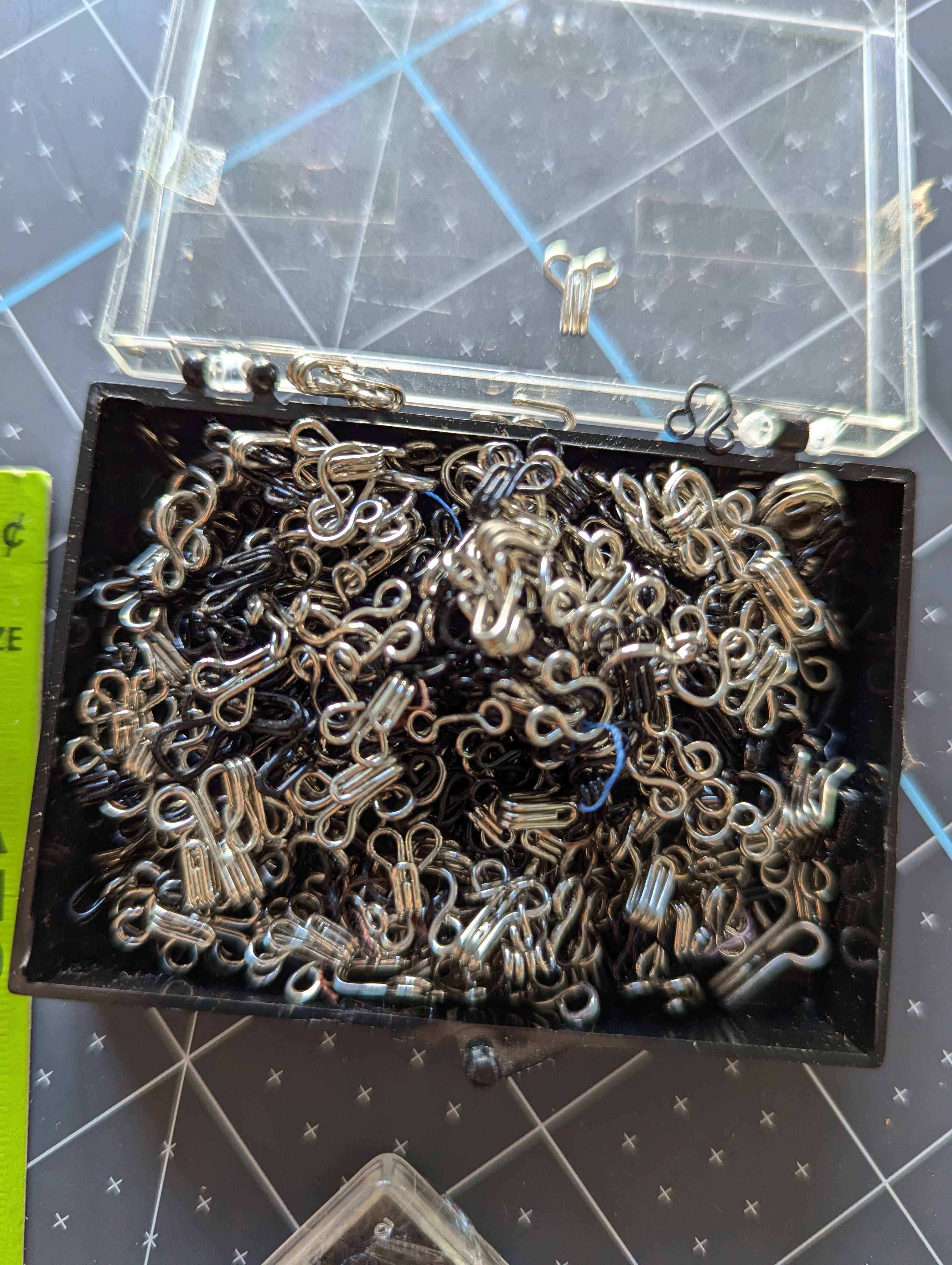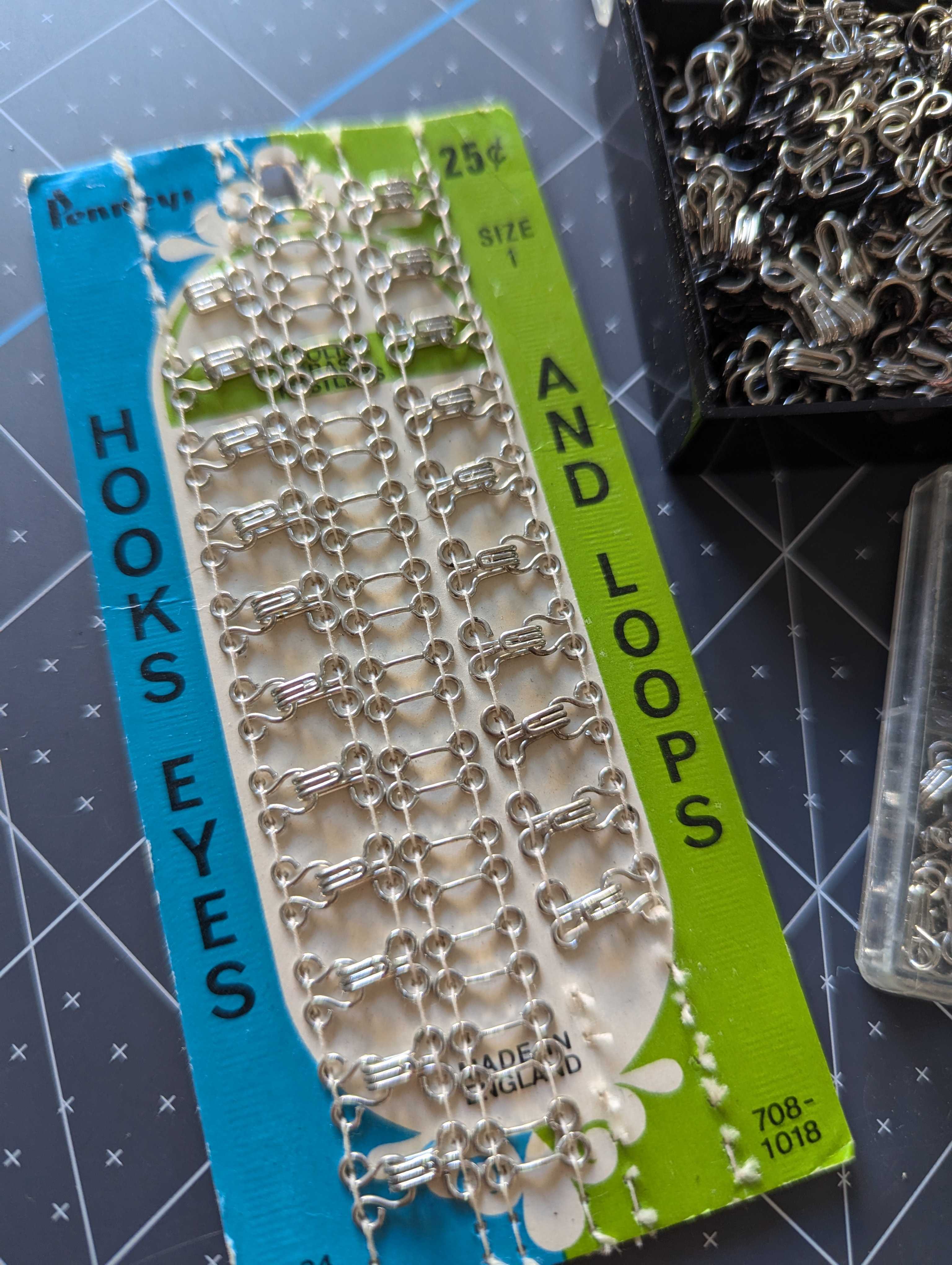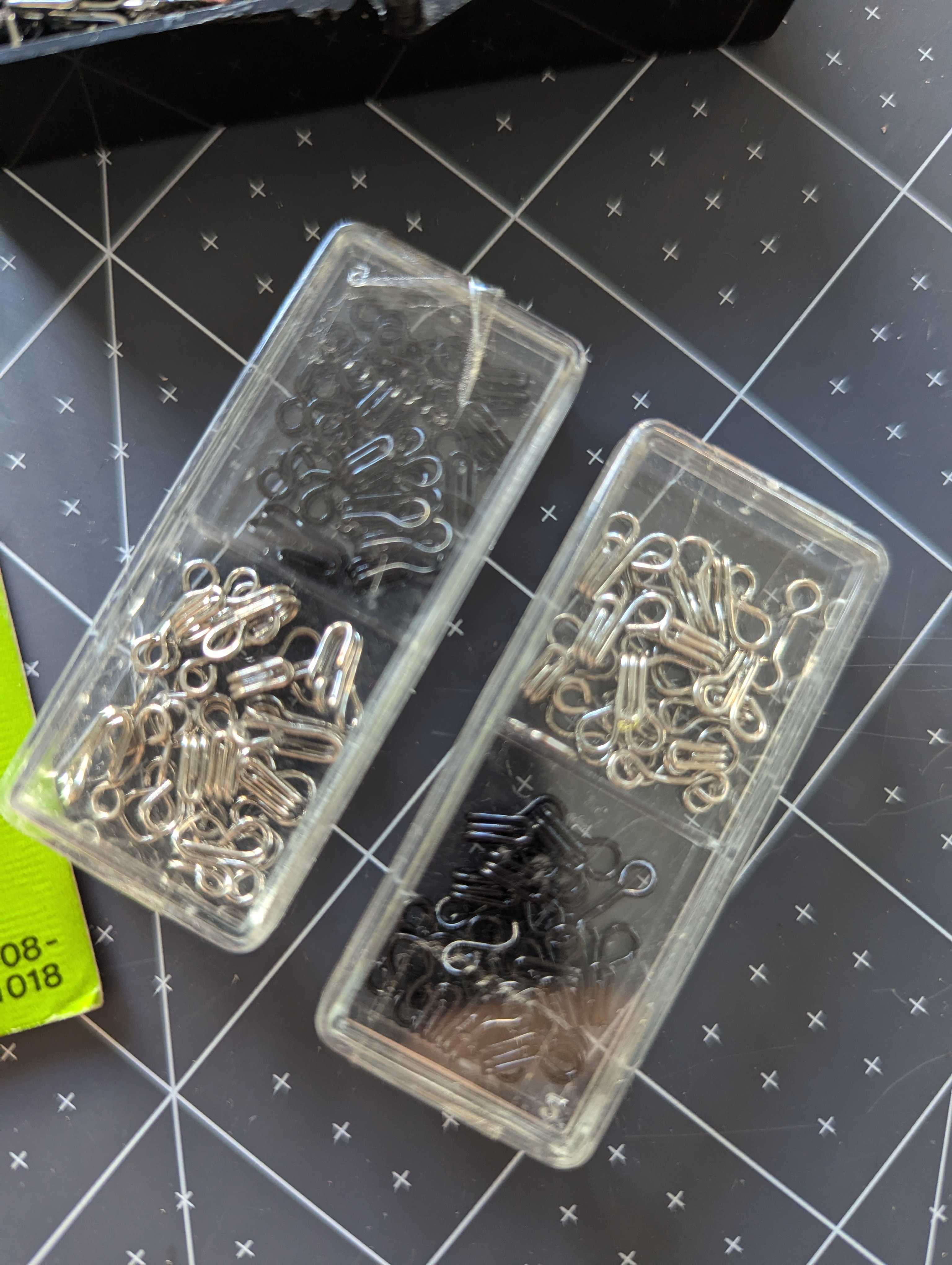 You'll receive everything pictured in this lot of hooks and eyes sets. Mat board is in inches for size reference.