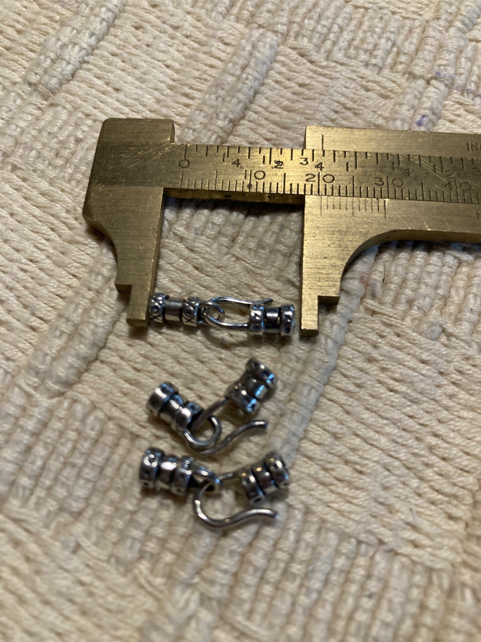 These sterling silver 20mm, measurement of the entire length of ‘hook and eye’ clasp. If you are unfamiliar with these clasps they are a delight to use. See the how each piece has a center, that is the crimp. You thread you material through the clasp and crimp down and it’s attached!