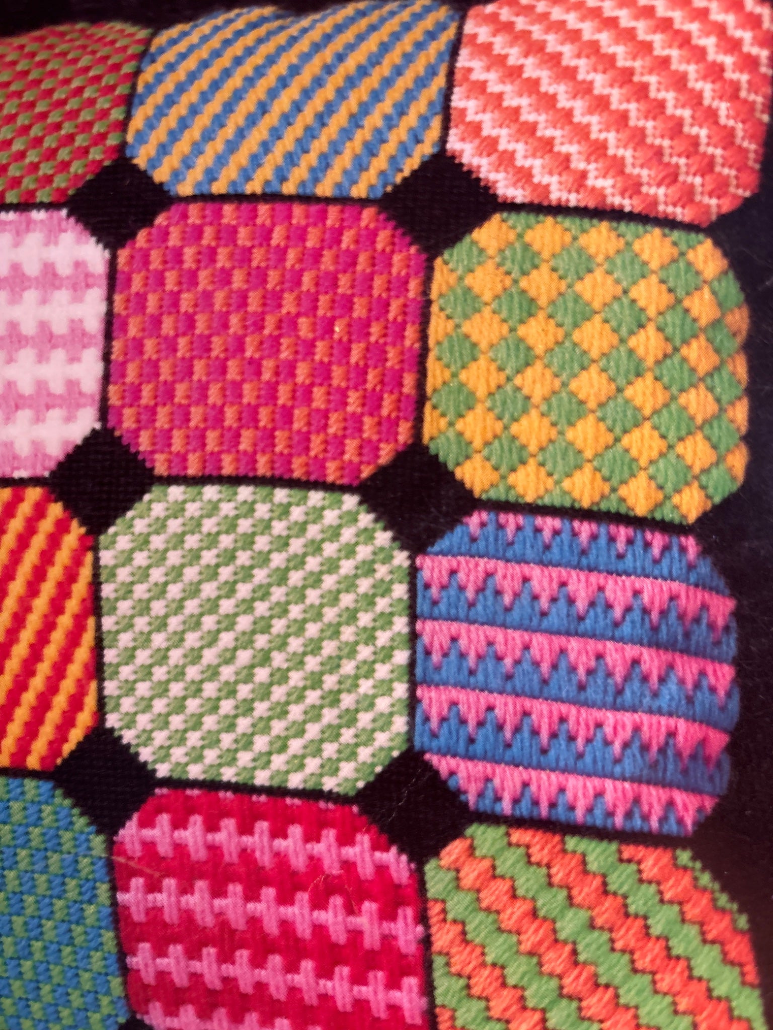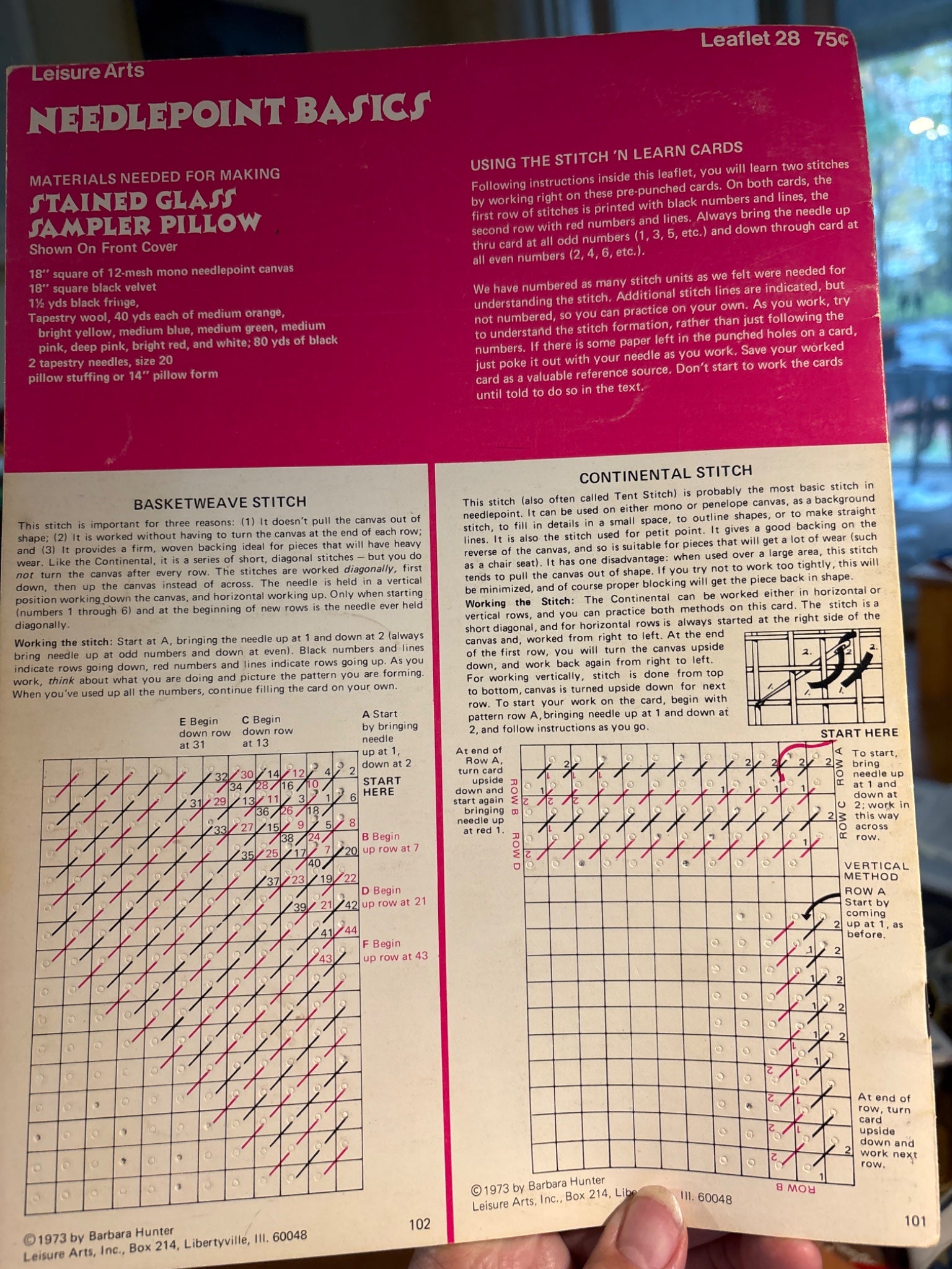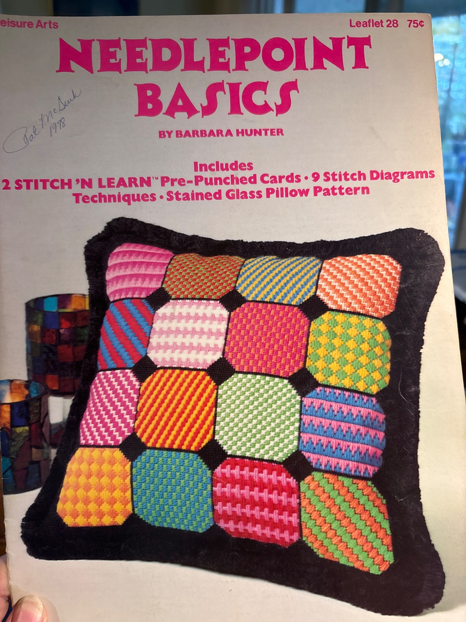 Includes 2 stitch and learn cards, nine stitch diagrams techniques, stained glass pillow pattern