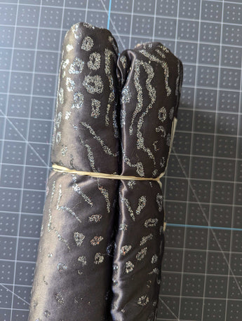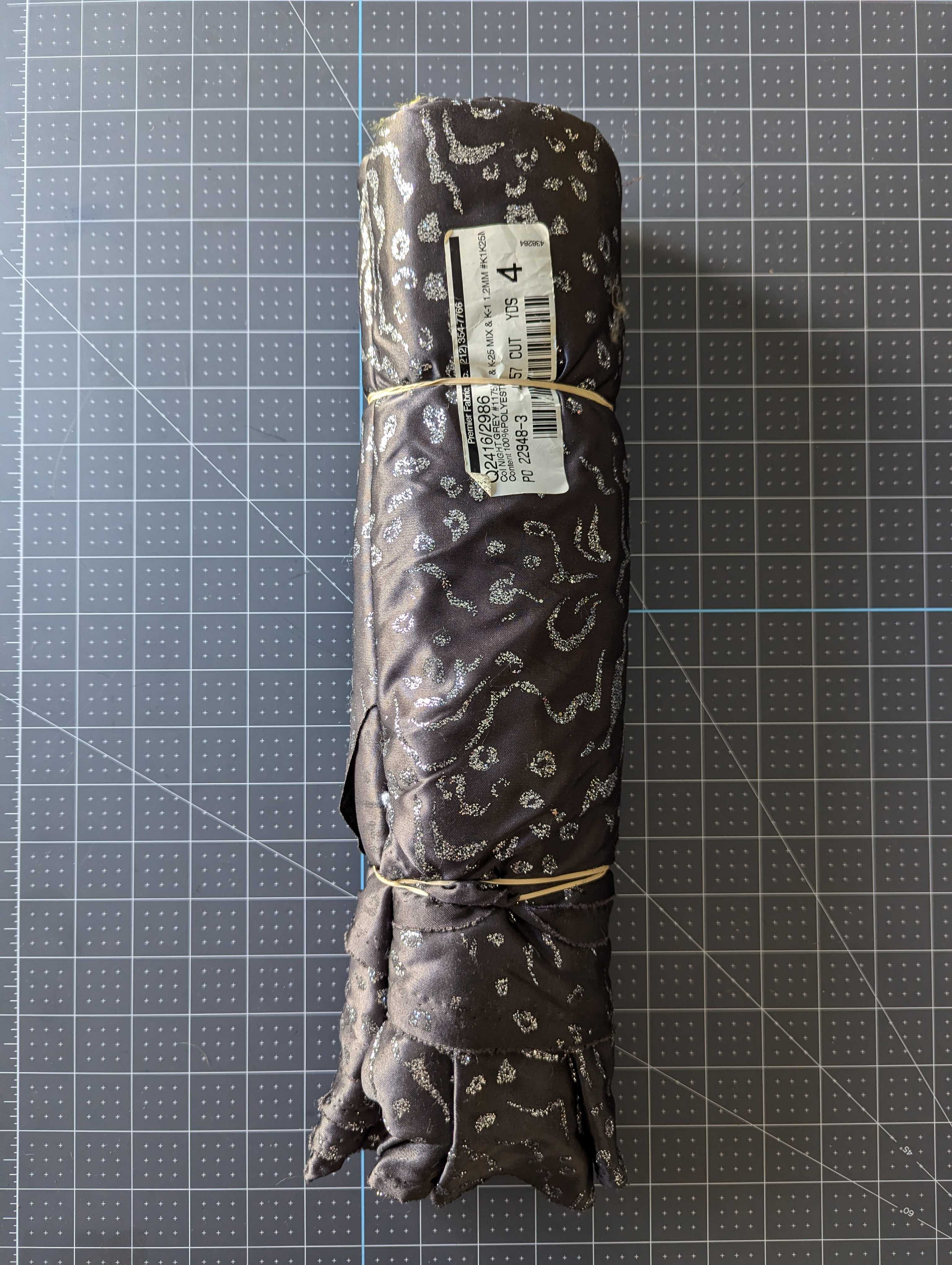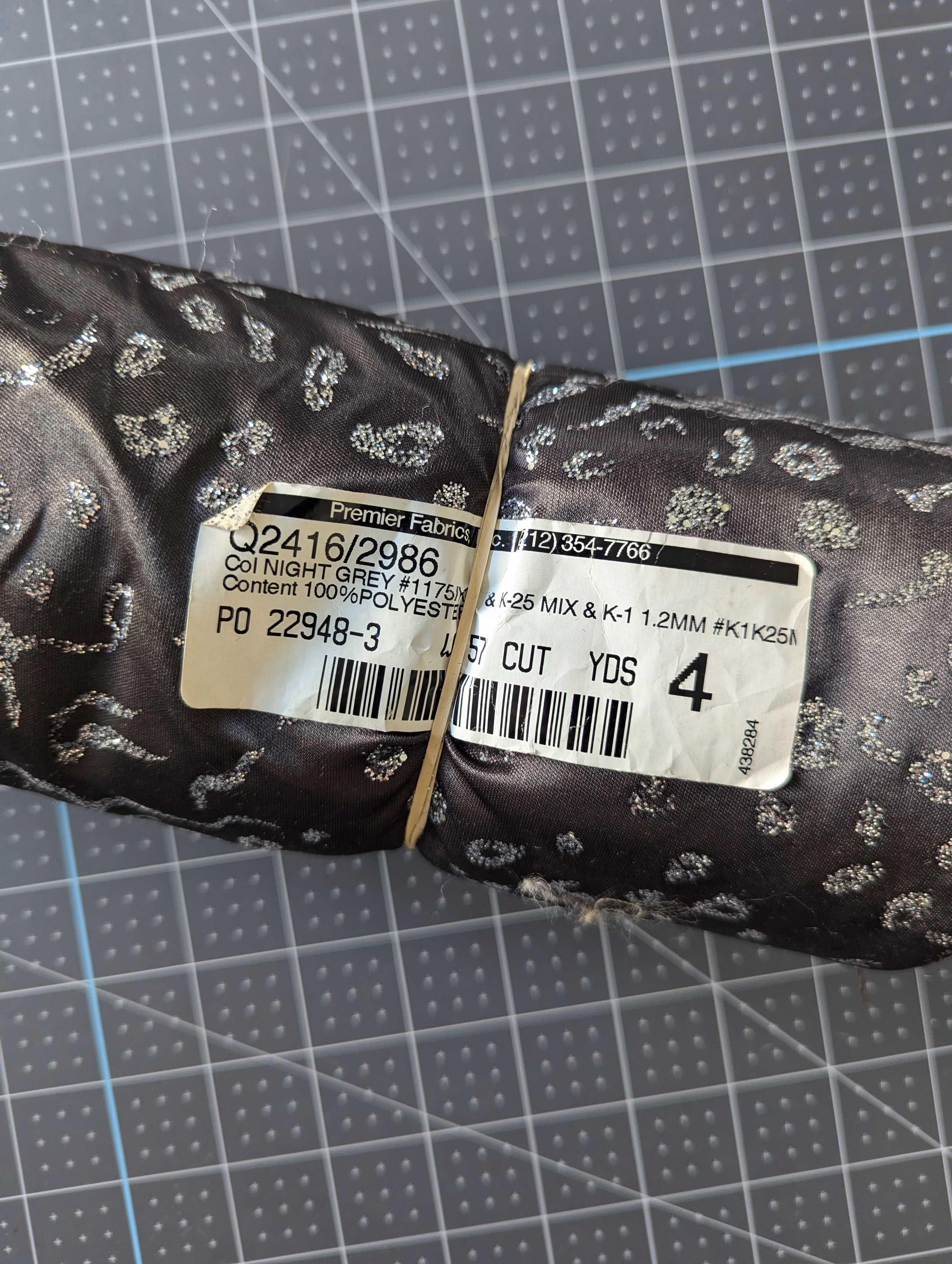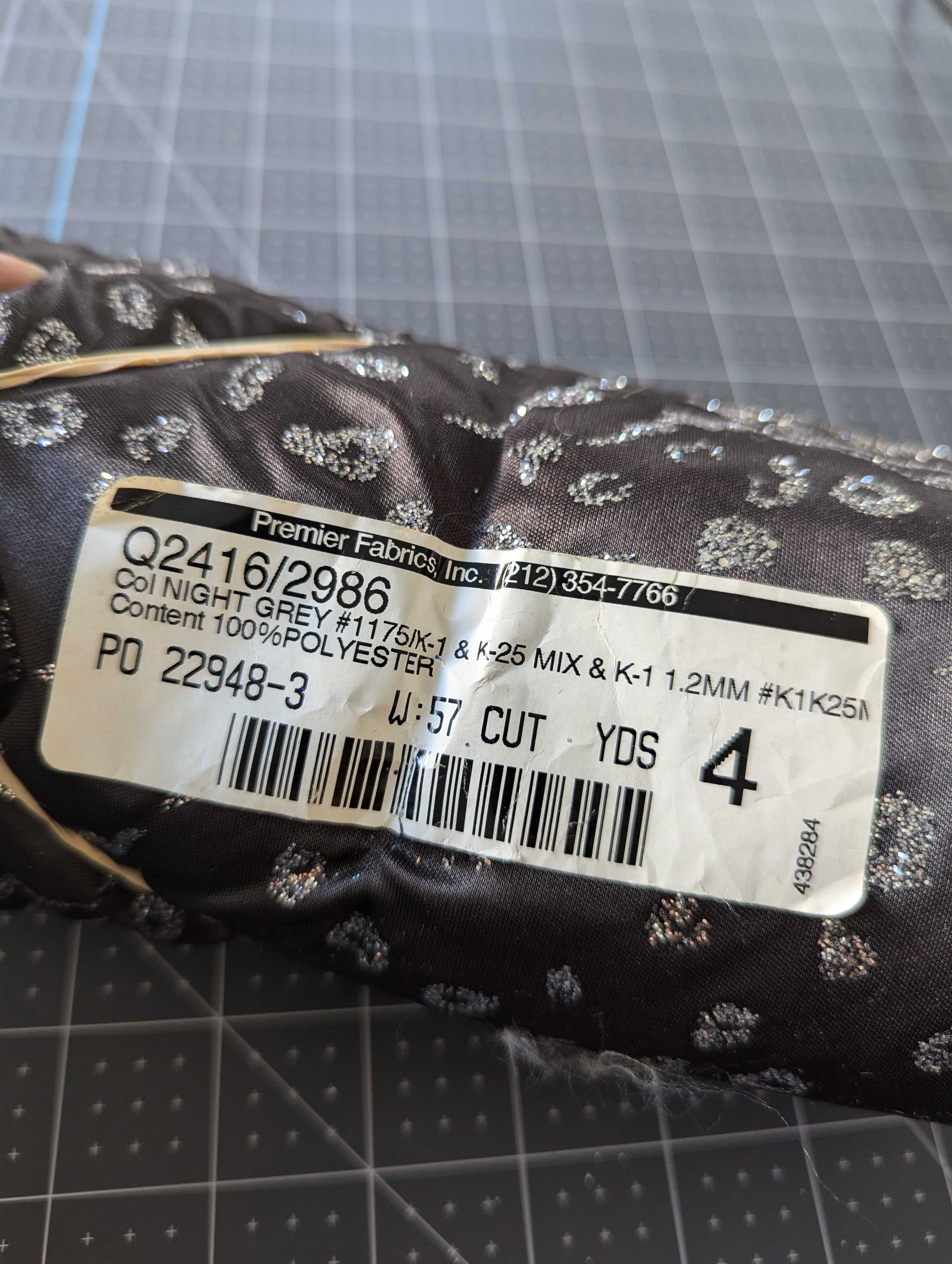 This came to us as a pre-rolled piece, and we have not unrolled it to check but it would appear it's never been unrolled and all yardage remains as described (4 yds). Color is Night Grey #1175 by Premier Fabrics, Inc. It is 100% polyester.