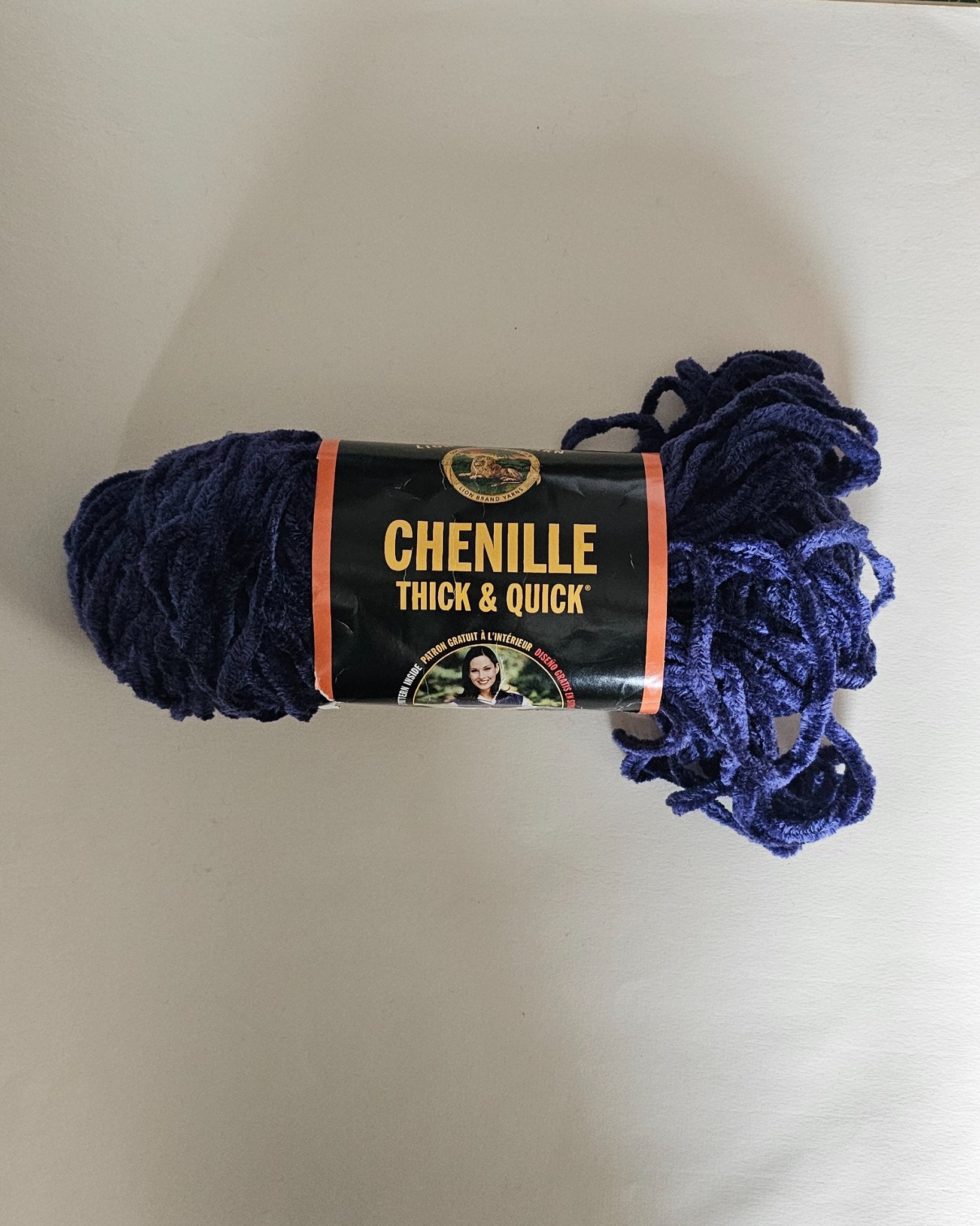 Novelty Yarn Chenille Thick & Quick Lion Brand Dark Purpleish Blue 150 grams. This is a full skein. I am including a pic of a differrent label so you can see more of the specs.