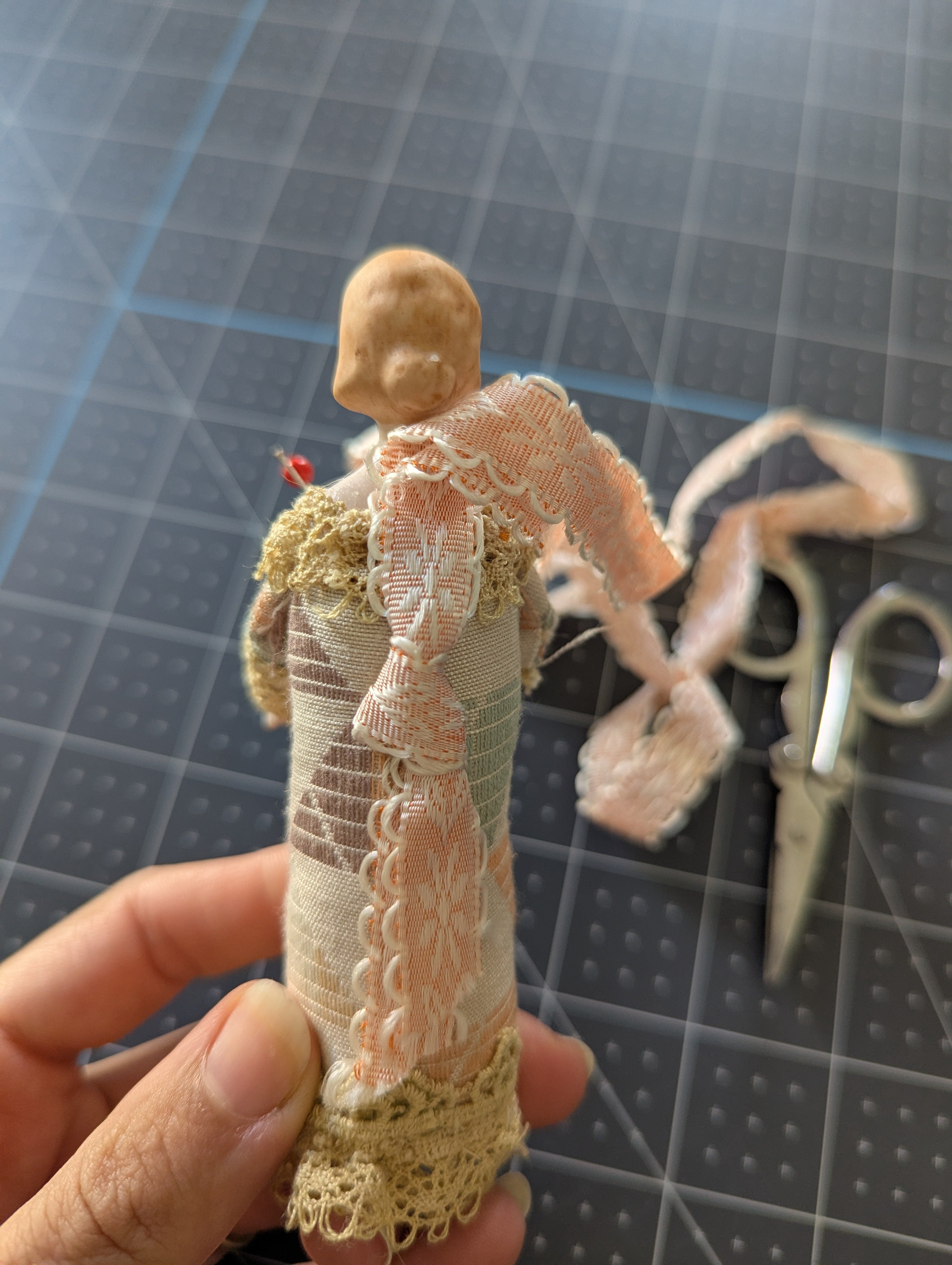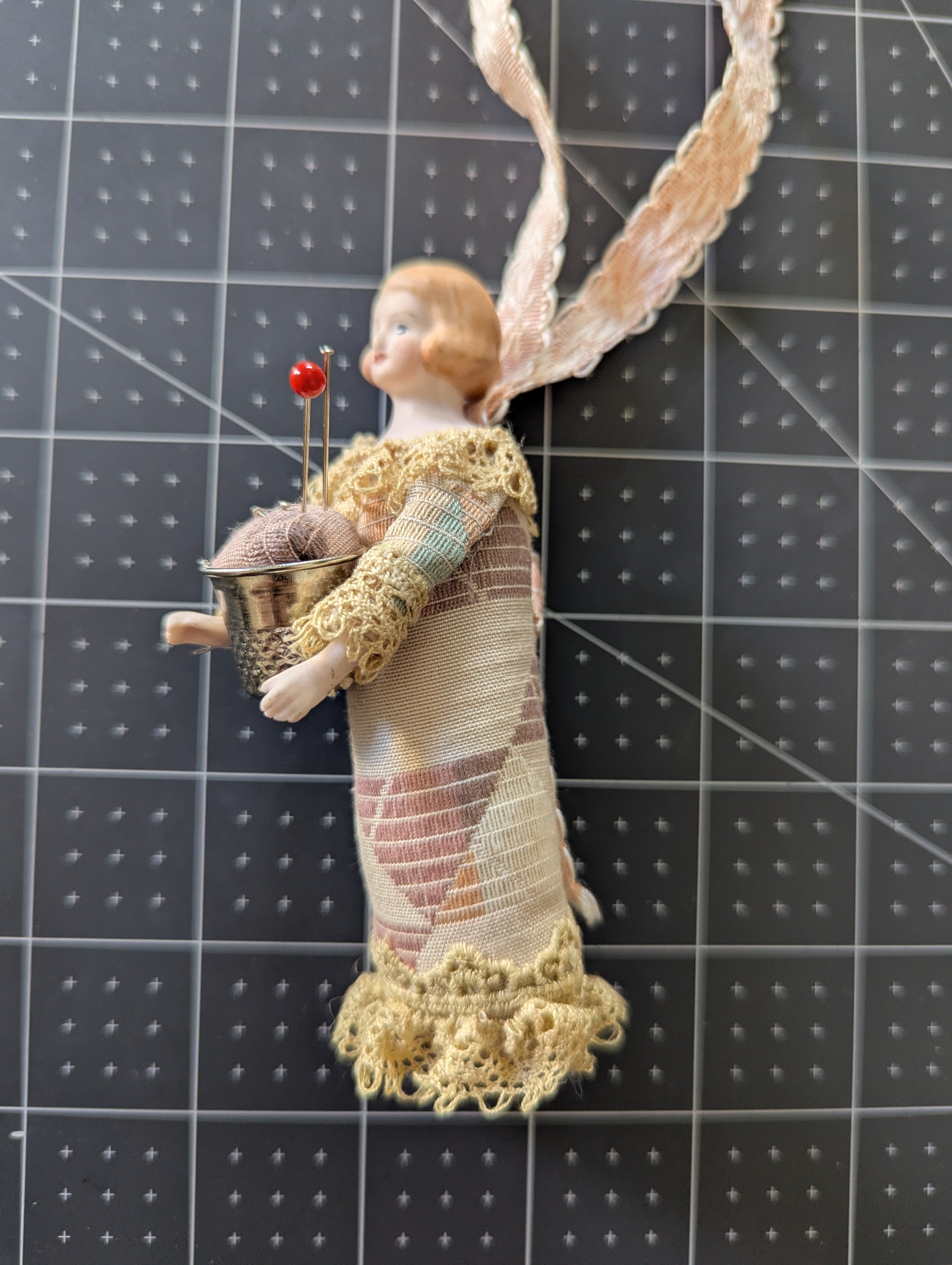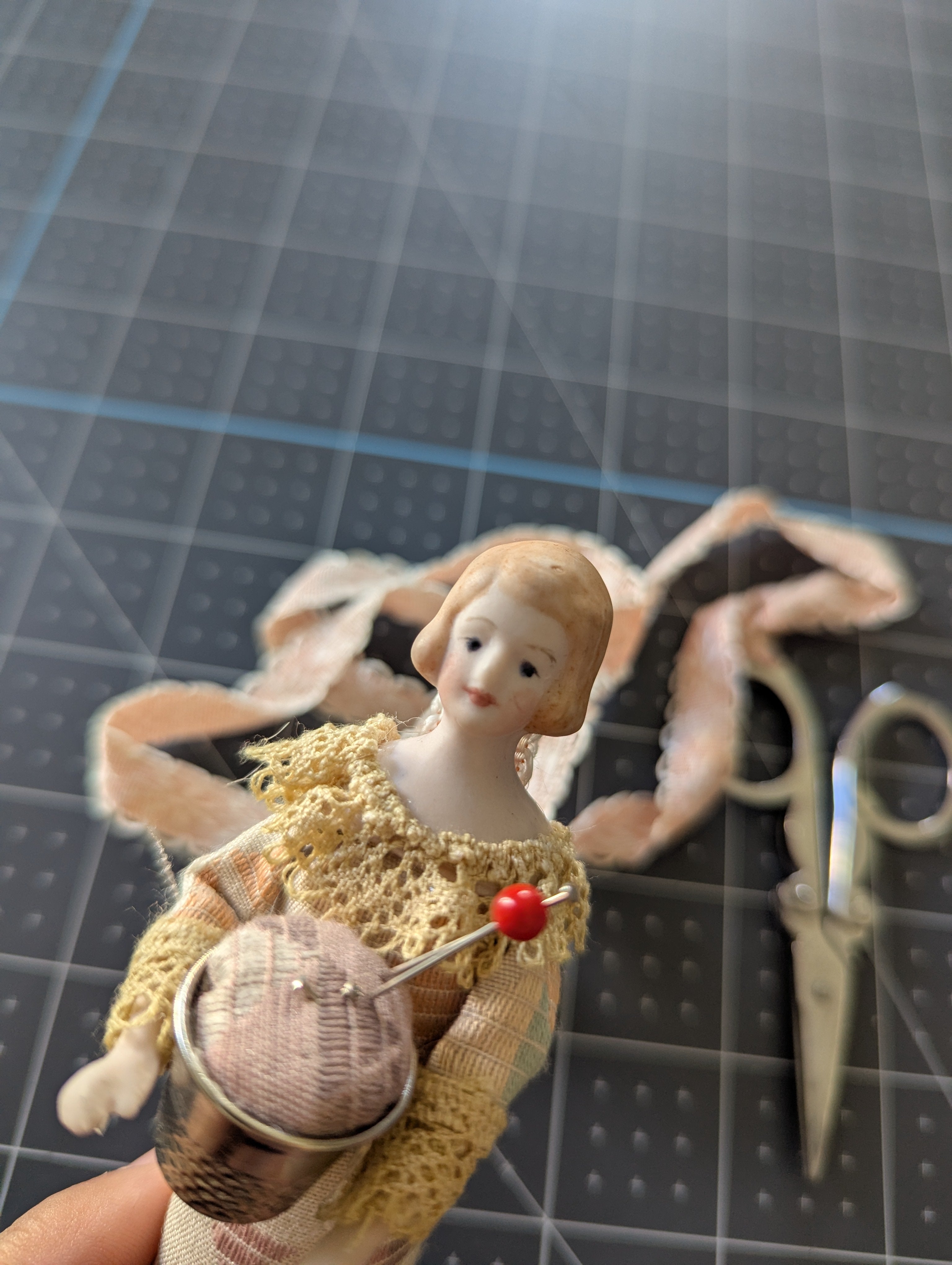A cute, handmade pin doll head pin cushion in good condition. Pins not included. One of the doll arms is unglued from the thimble it's holding.