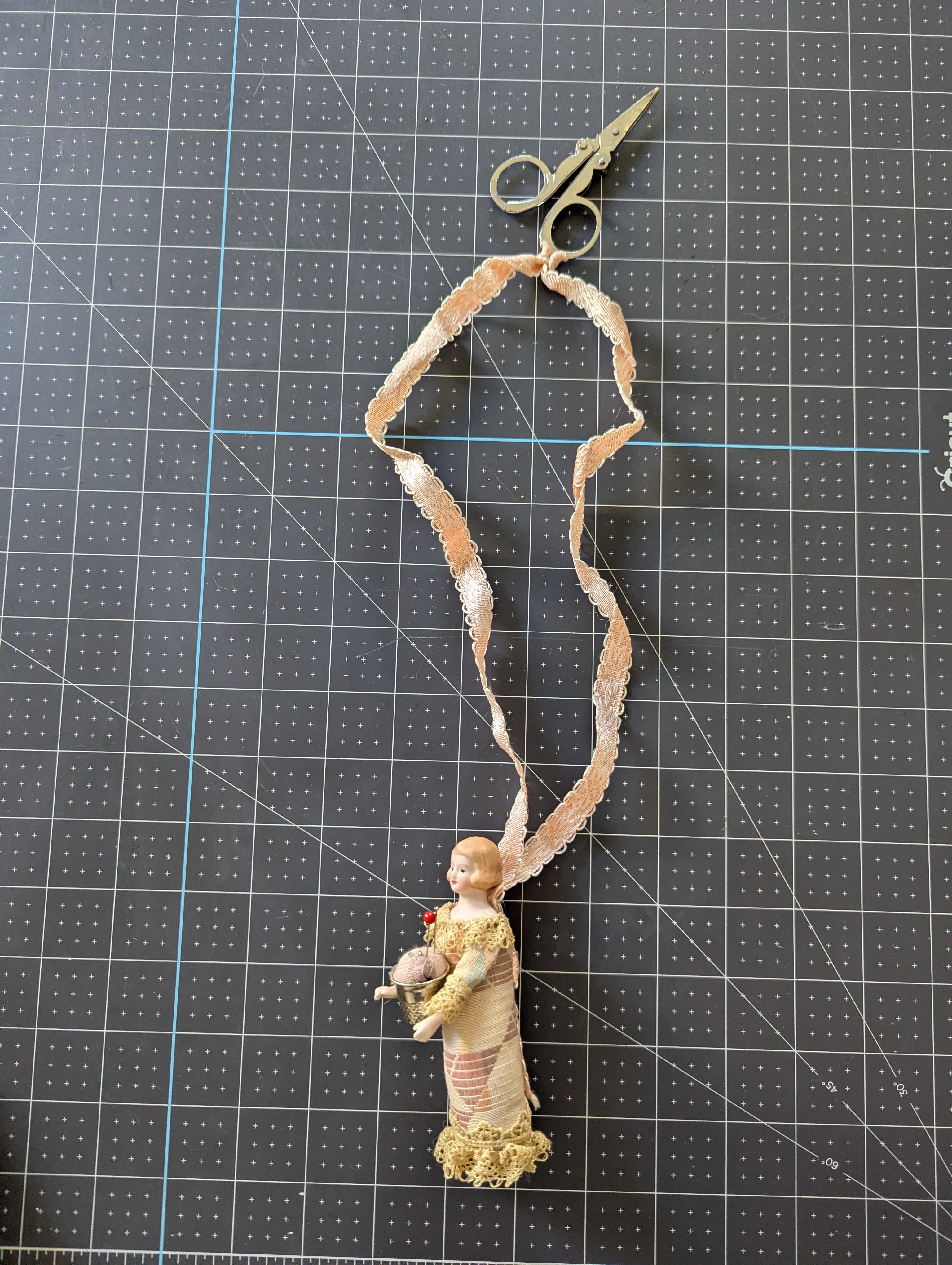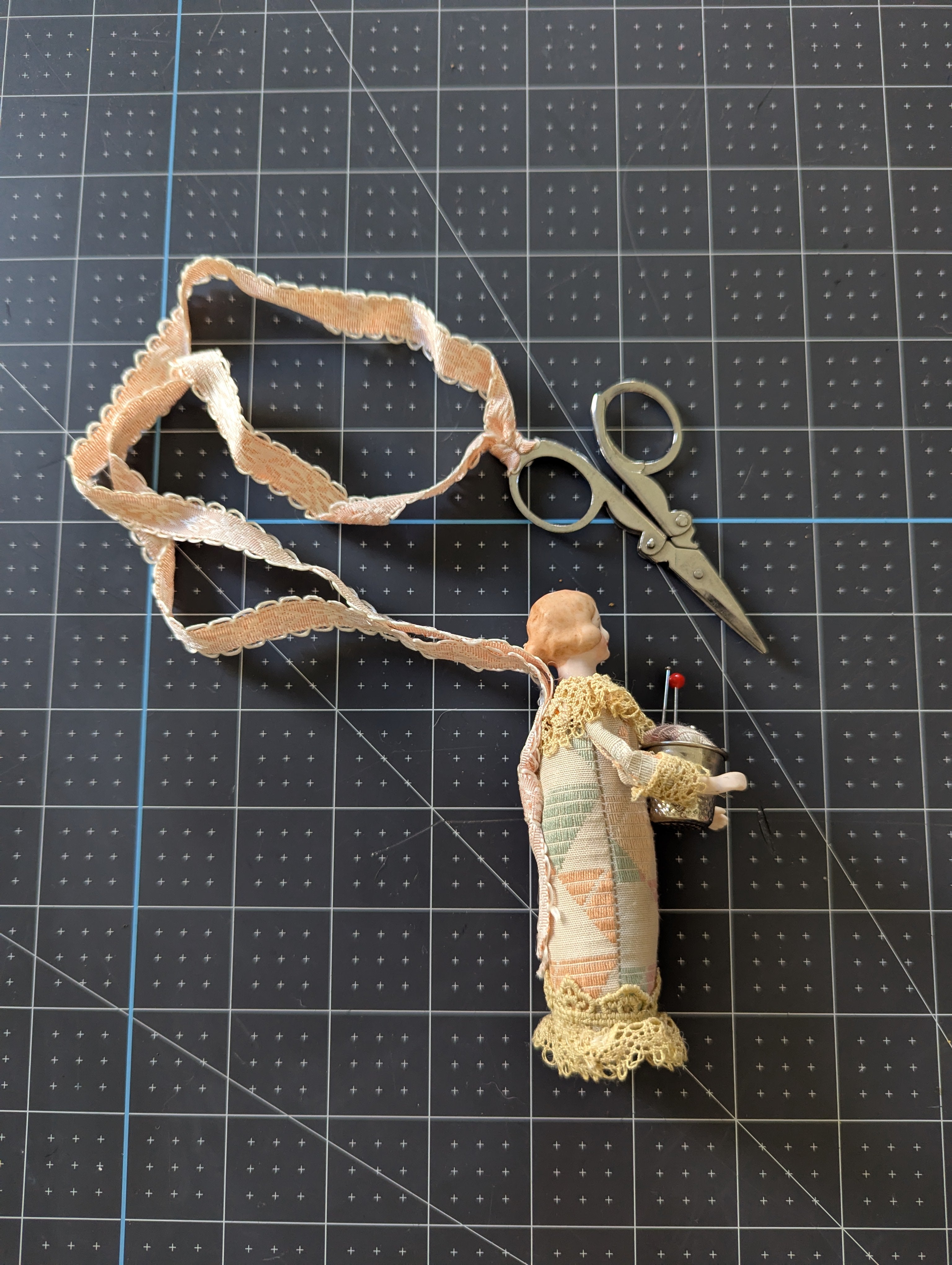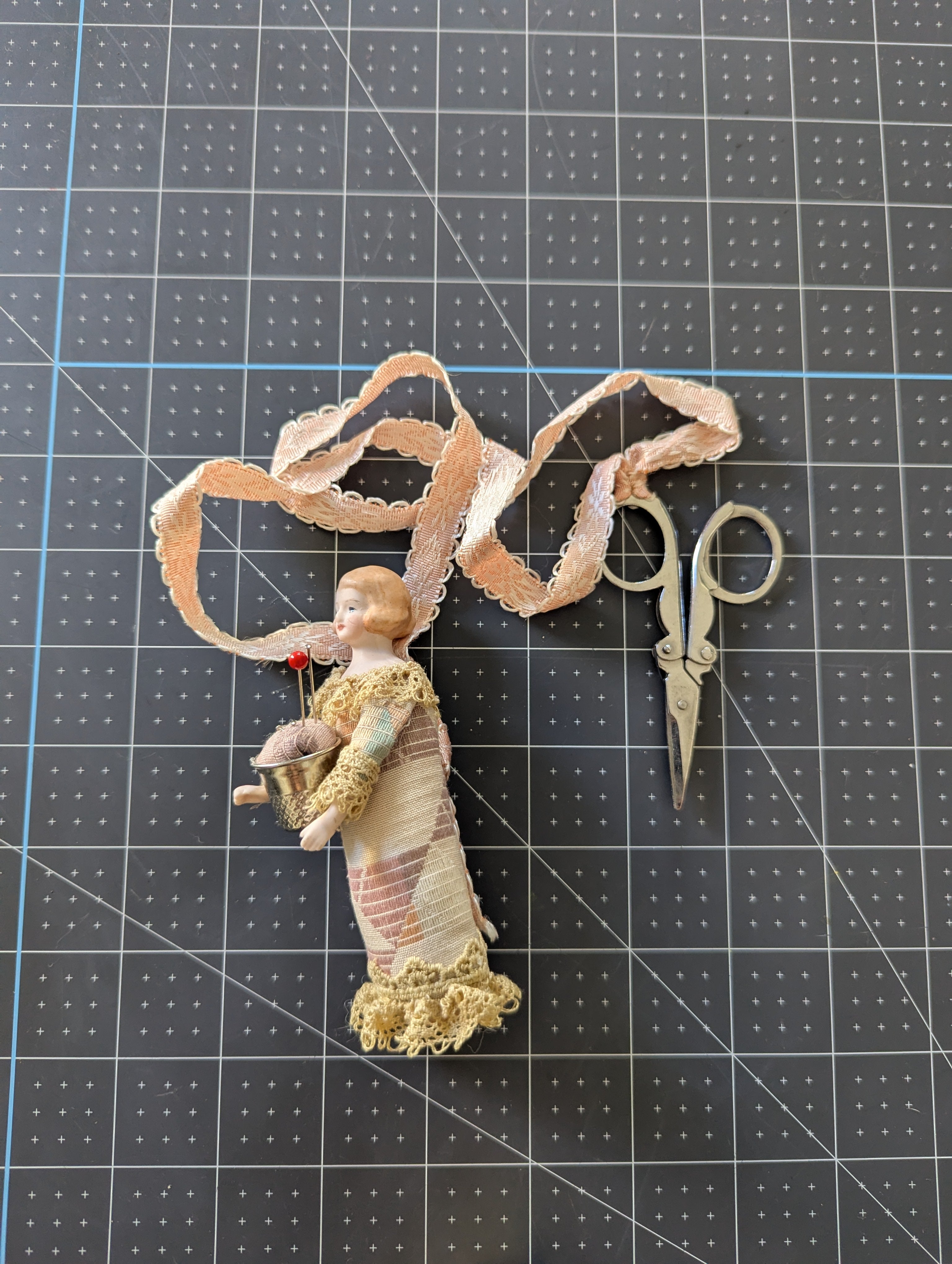 A cute, handmade pin doll head pin cushion in good condition. Pins not included. One of the doll arms is unglued from the thimble it's holding.