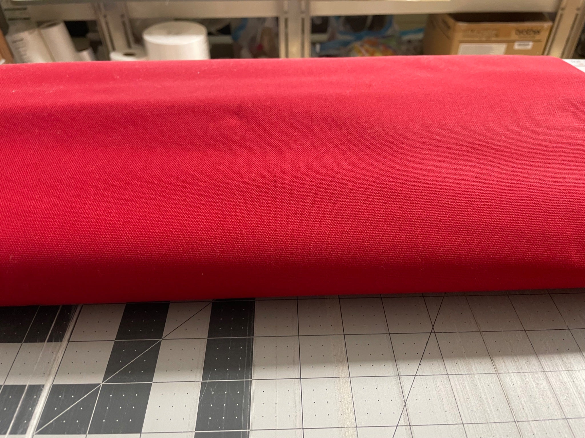 Red duck/light-weight canvas.  100% cotton.  Fading on one side, but does not show on the other side.  60" width.  4 yards