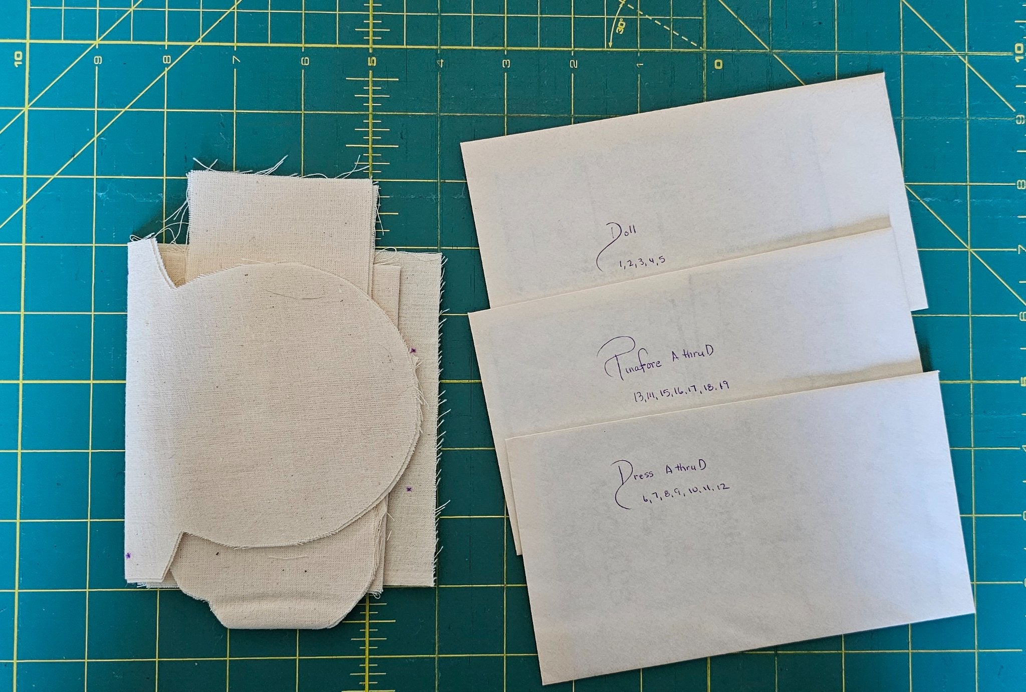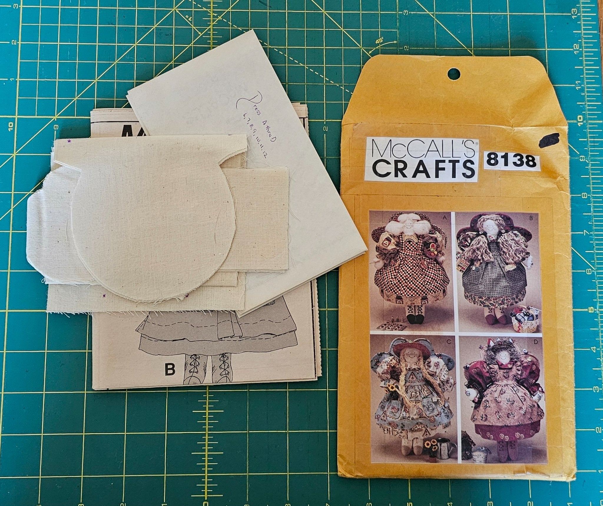 This is a used pattern, but it has crefully been repackaged in a manilla envelope with package details carefully cut out and taped down. All instructions are included. The patterns have been cut out and carefully put in envelopes that are clearly labeled. There is even one whole doll cut out of muslin and carefully folded.