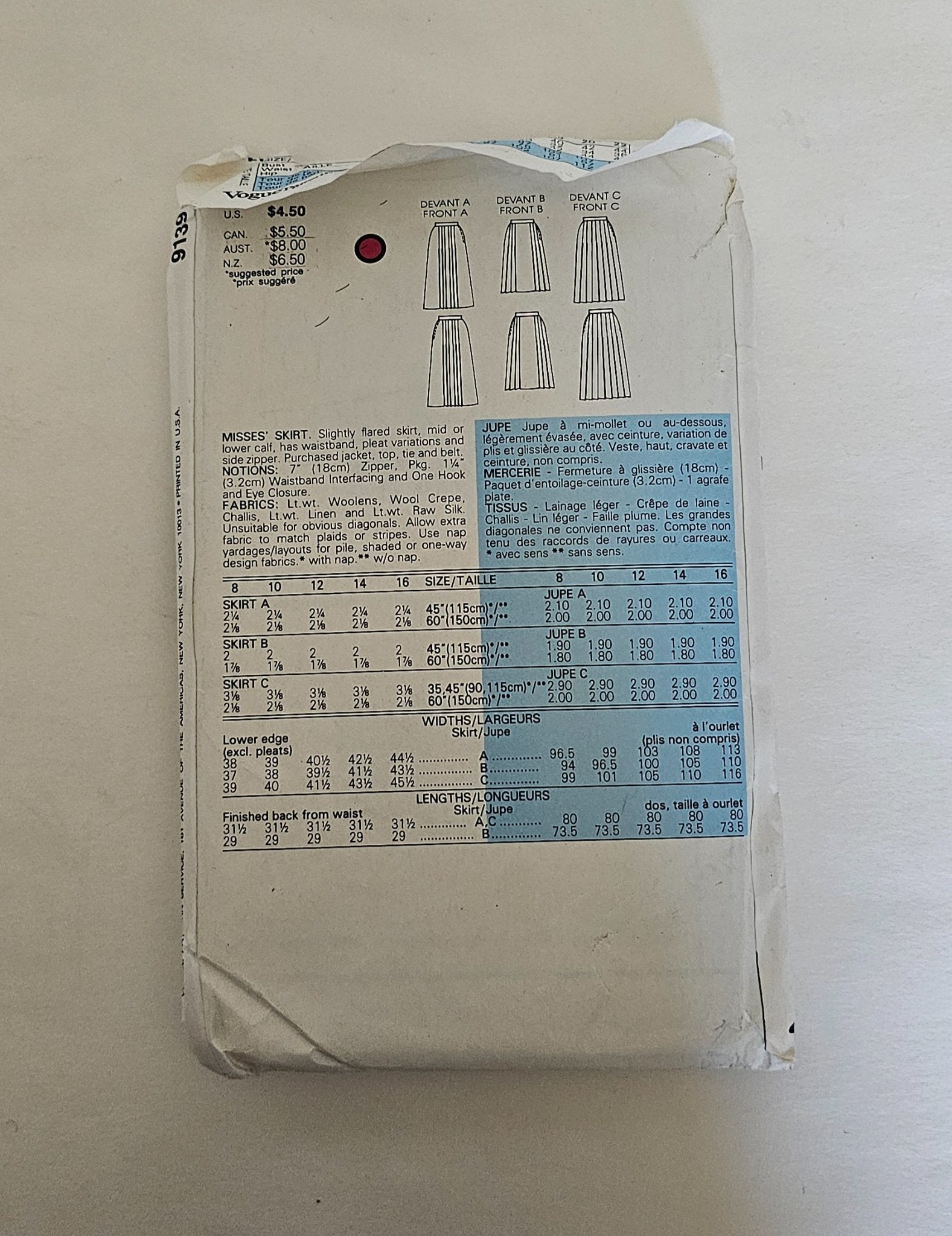 Sewing Pattern Vogue Patterns 9139 Pleated Skirt 3 Ways Unused