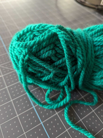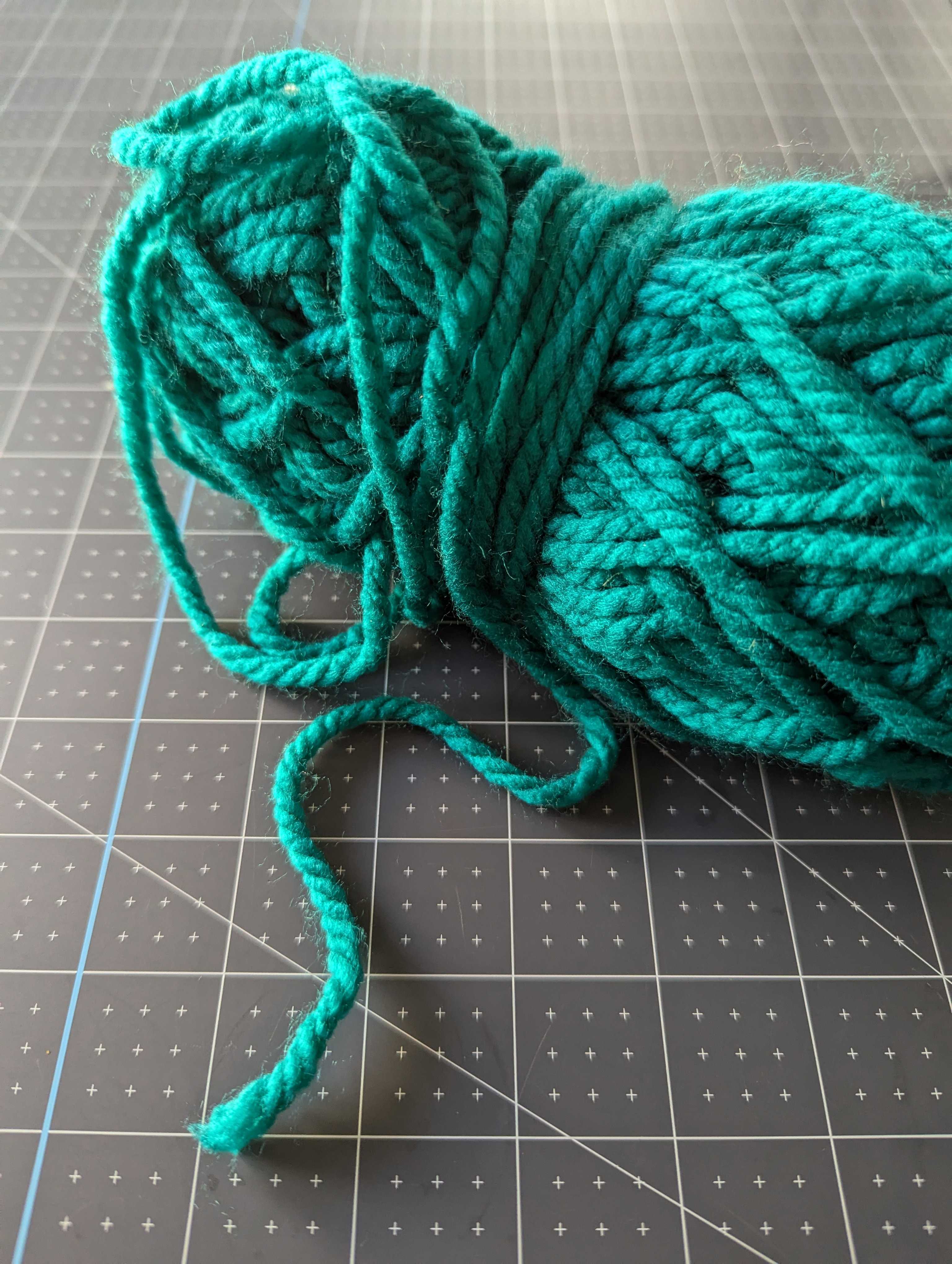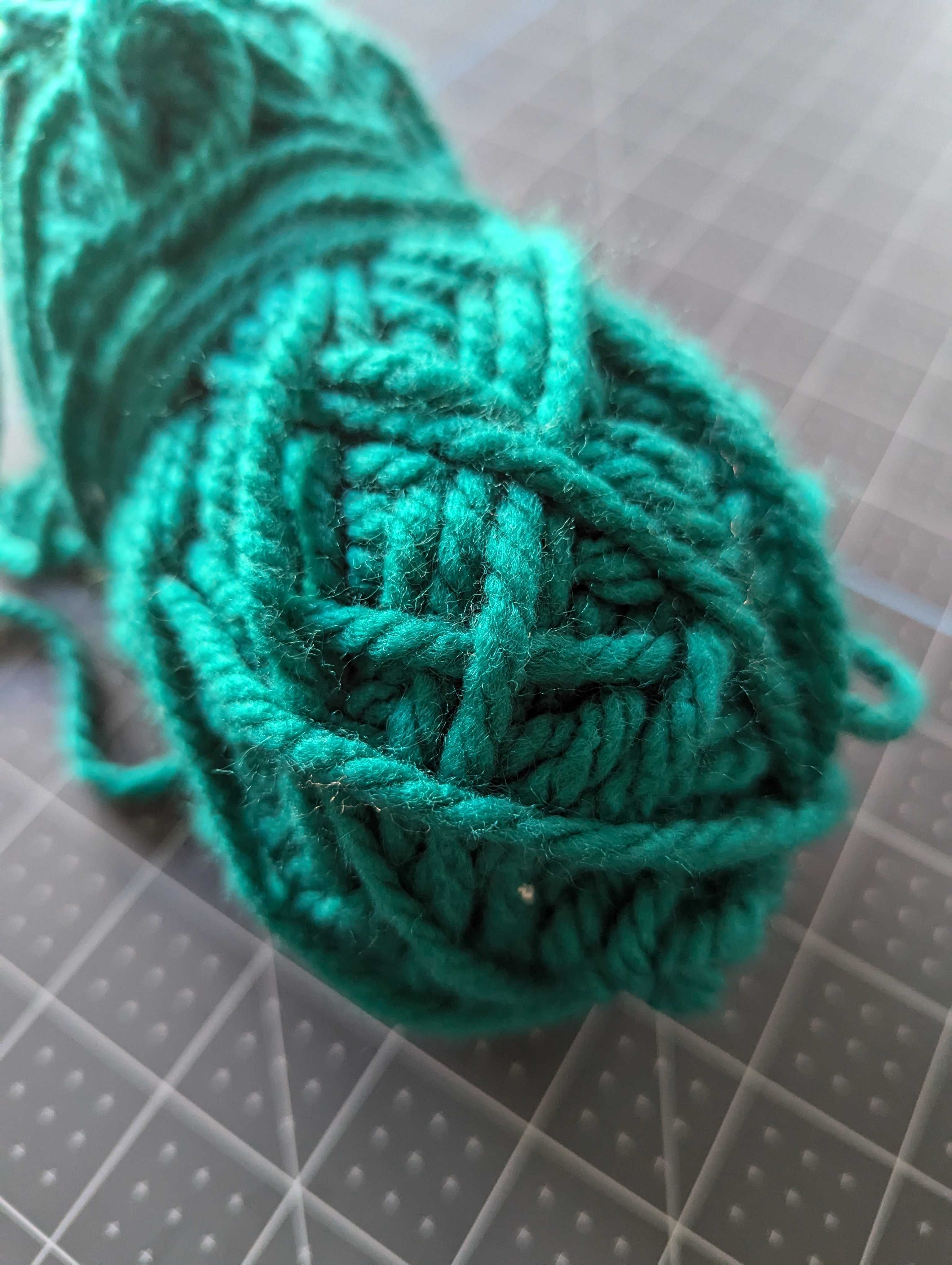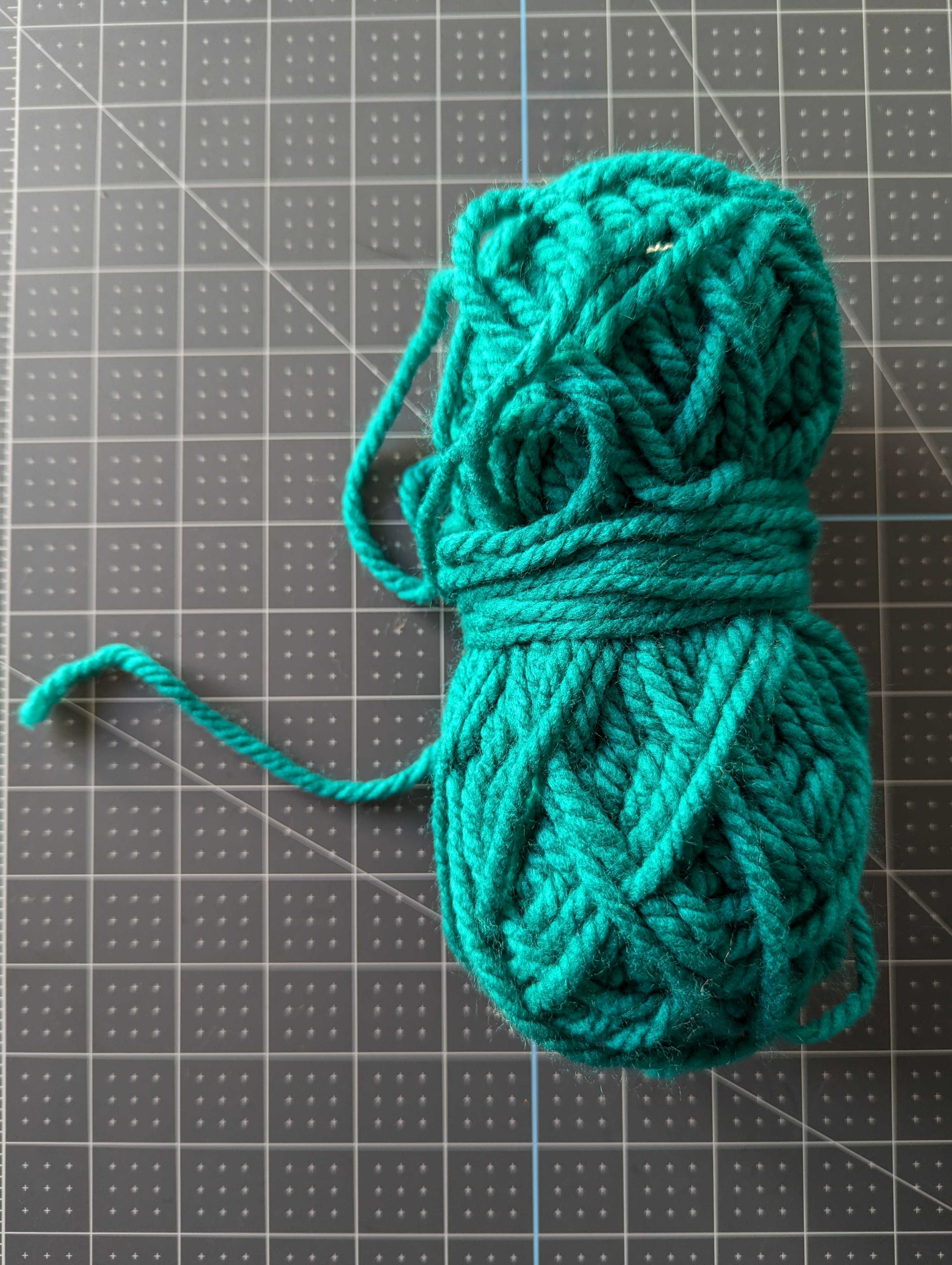 2.2 oz remains on this spool of chunky teal yarn. Mat board is in inches for size reference.