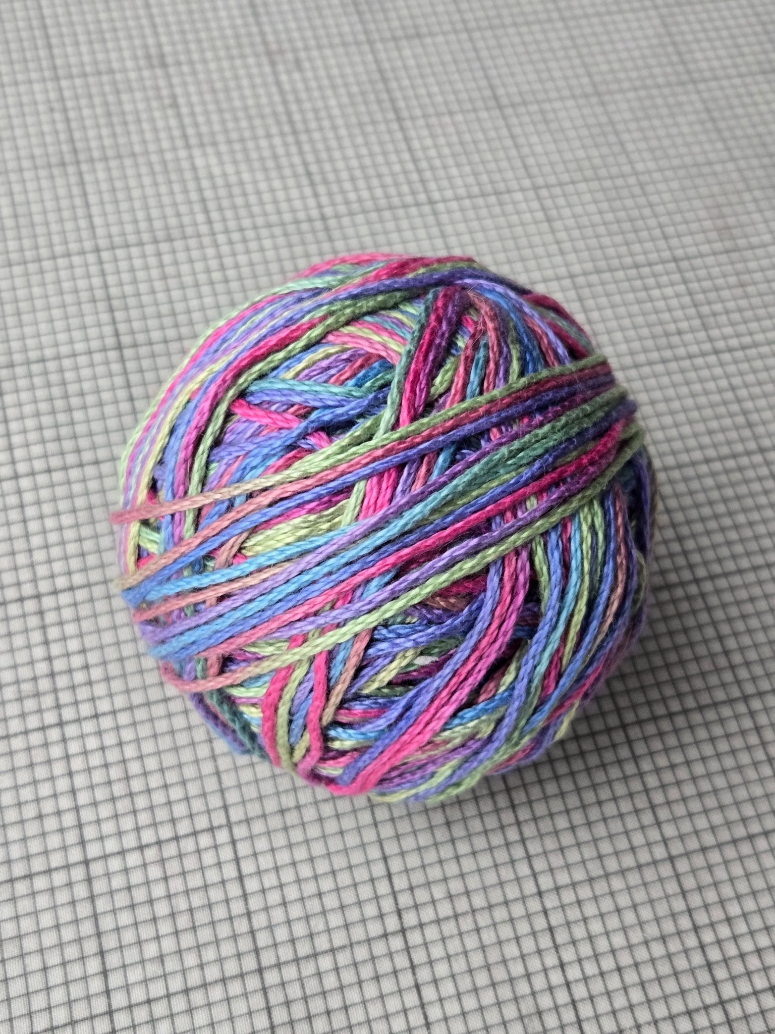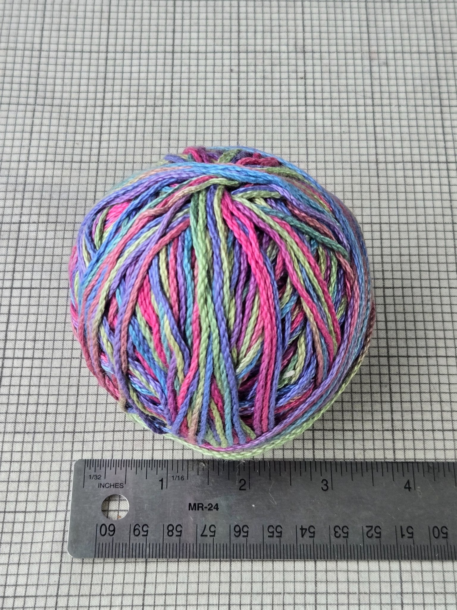 Colorful variegated mercerized cotton yarn ball. Weighs about 3.2 oz / 92 g