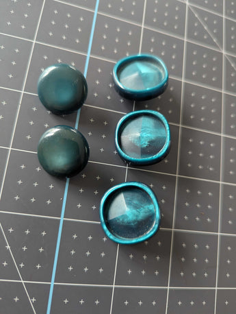 A set of two buttons in teal with incredible detail in the center. Button gauge for size references only.