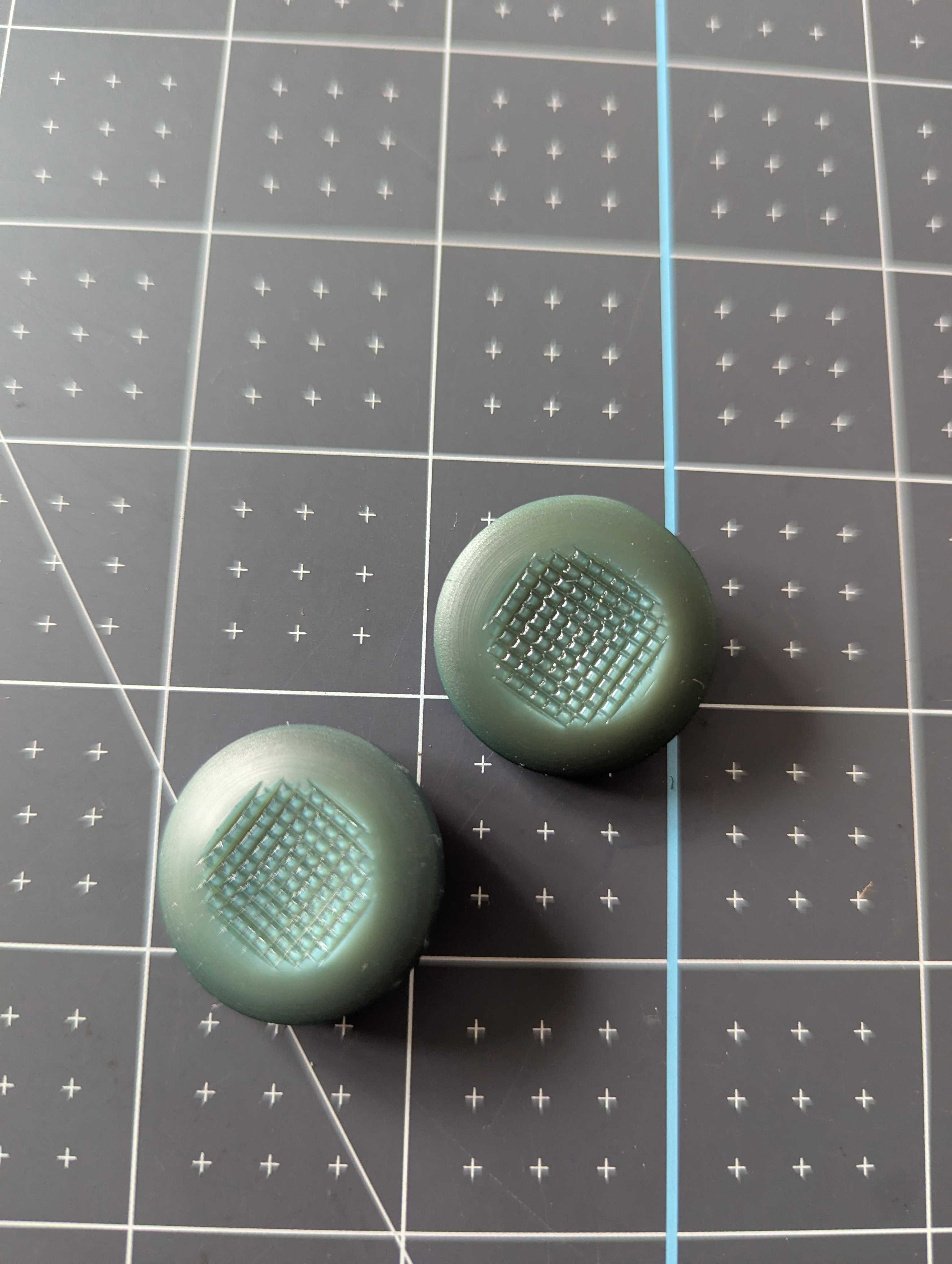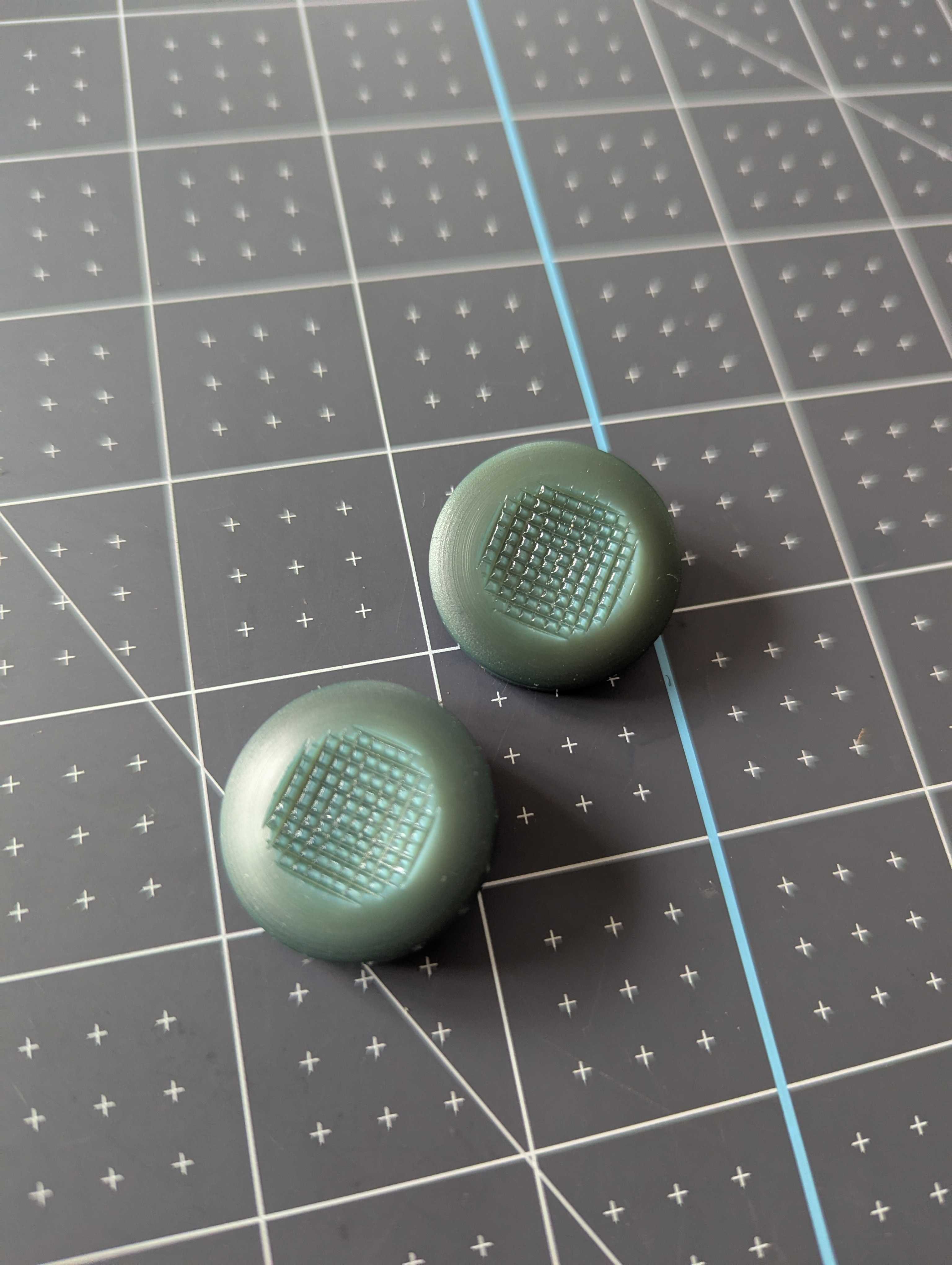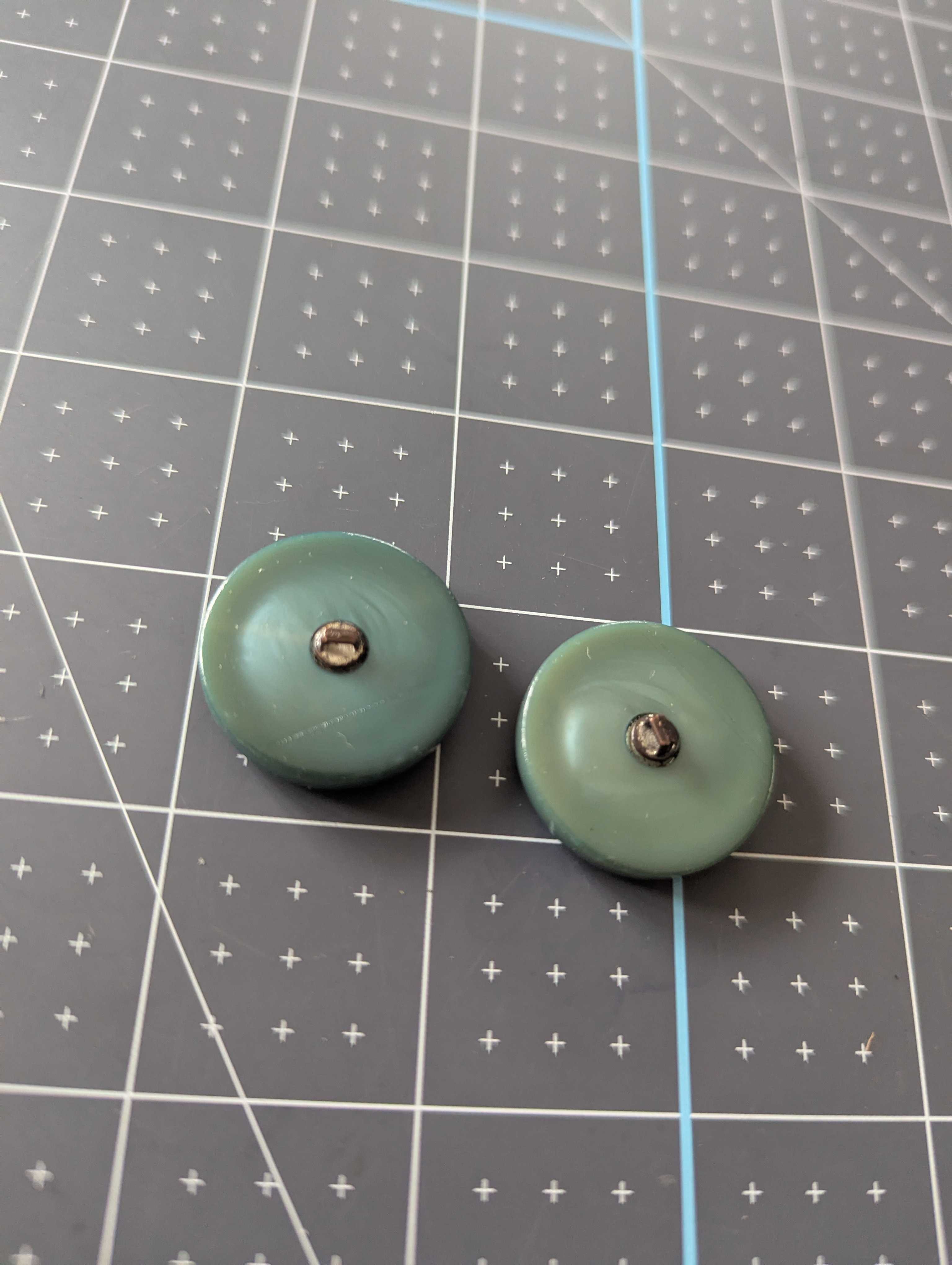 A set of two buttons in teal with incredible detail in the center. Button gauge for size references only.