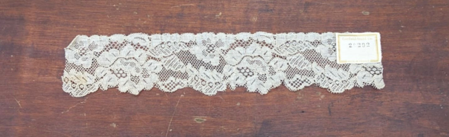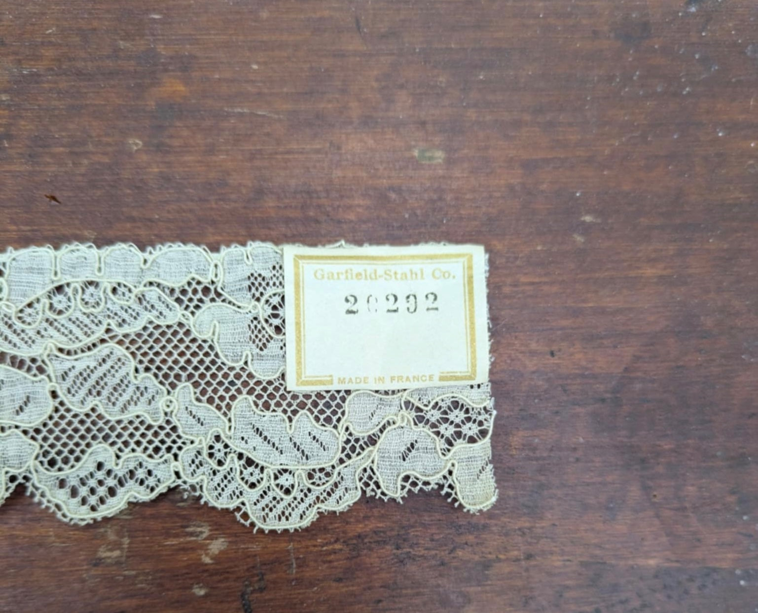 Lovely, delicate lace sample with original tag "Garfield-Stahl Co. Made In France."