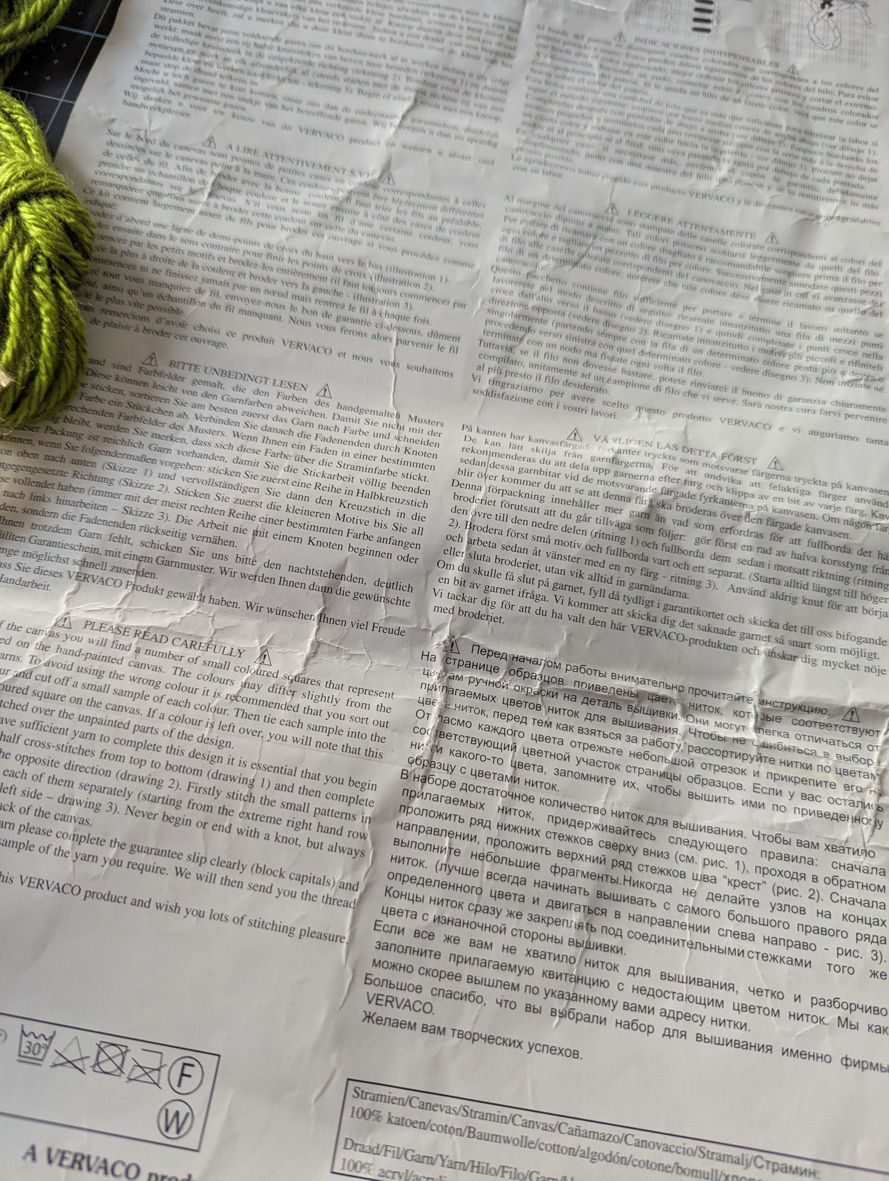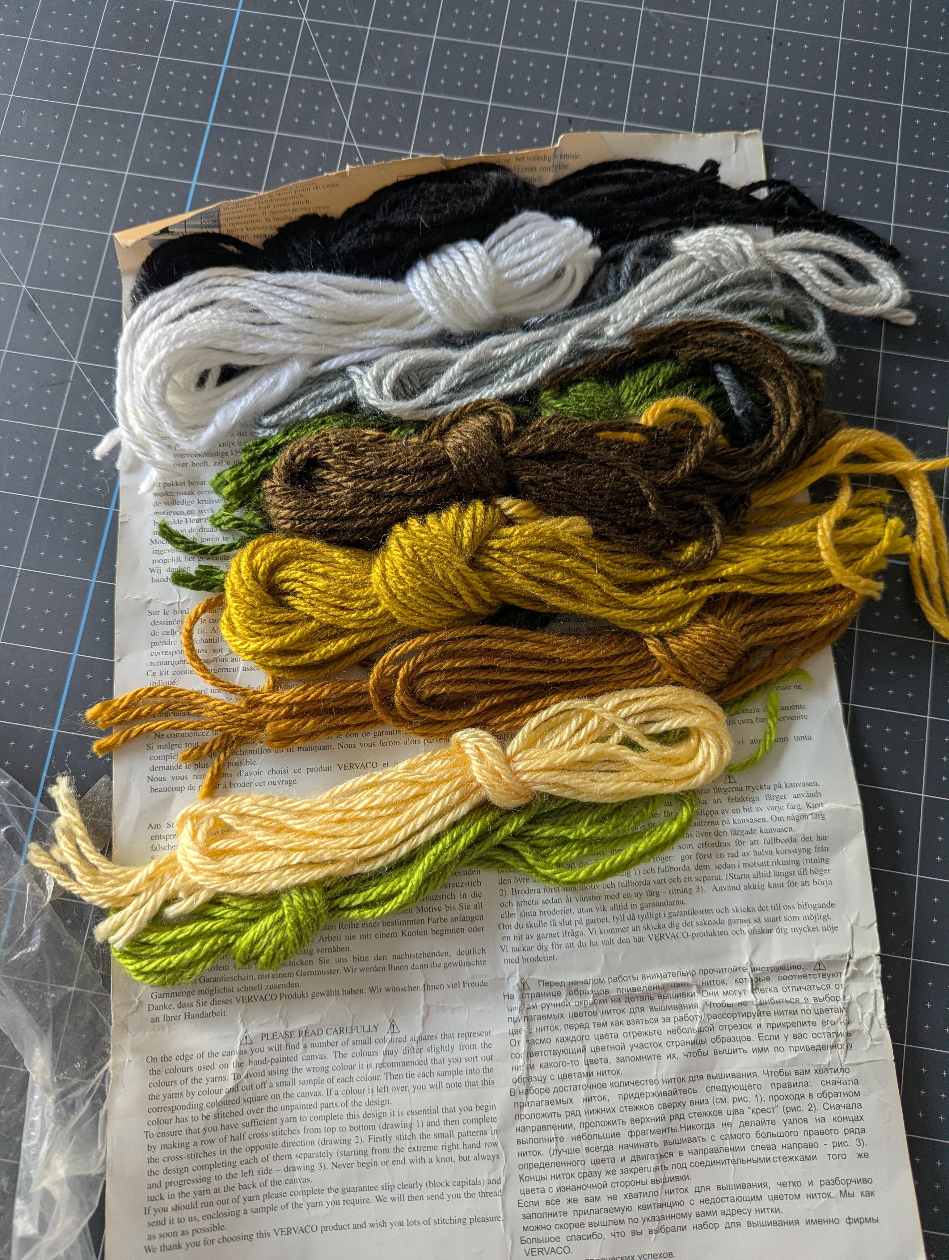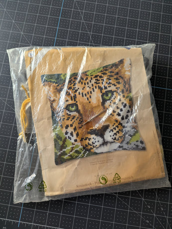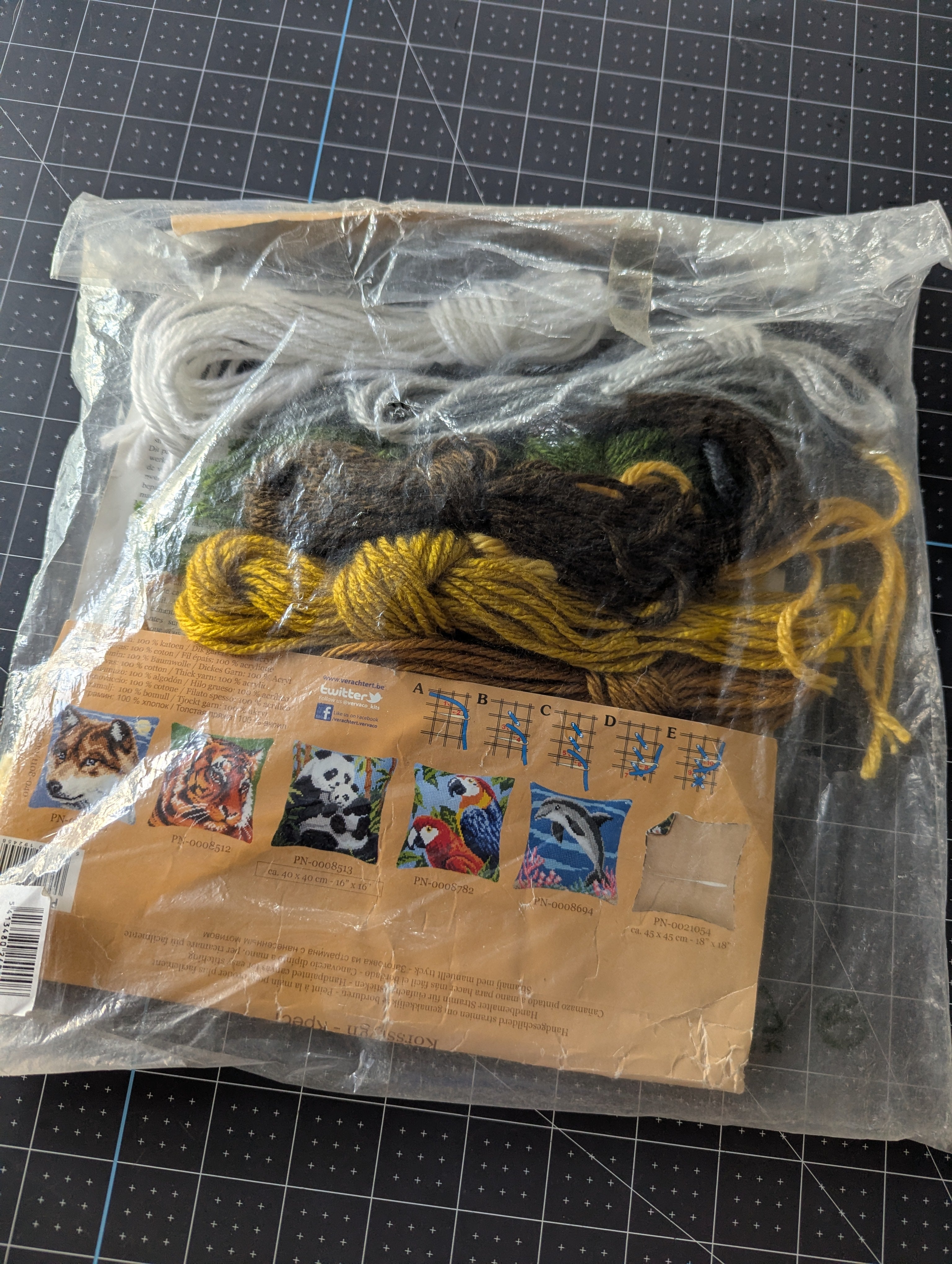 Note: This is NOT a complete kit. Includes some leftover yarn, and inspiration photo. Instructions on reverse are not in English. Unclear if all necessary yarn is present. The textile is not included. Additional supplies will be needed to complete the piece.