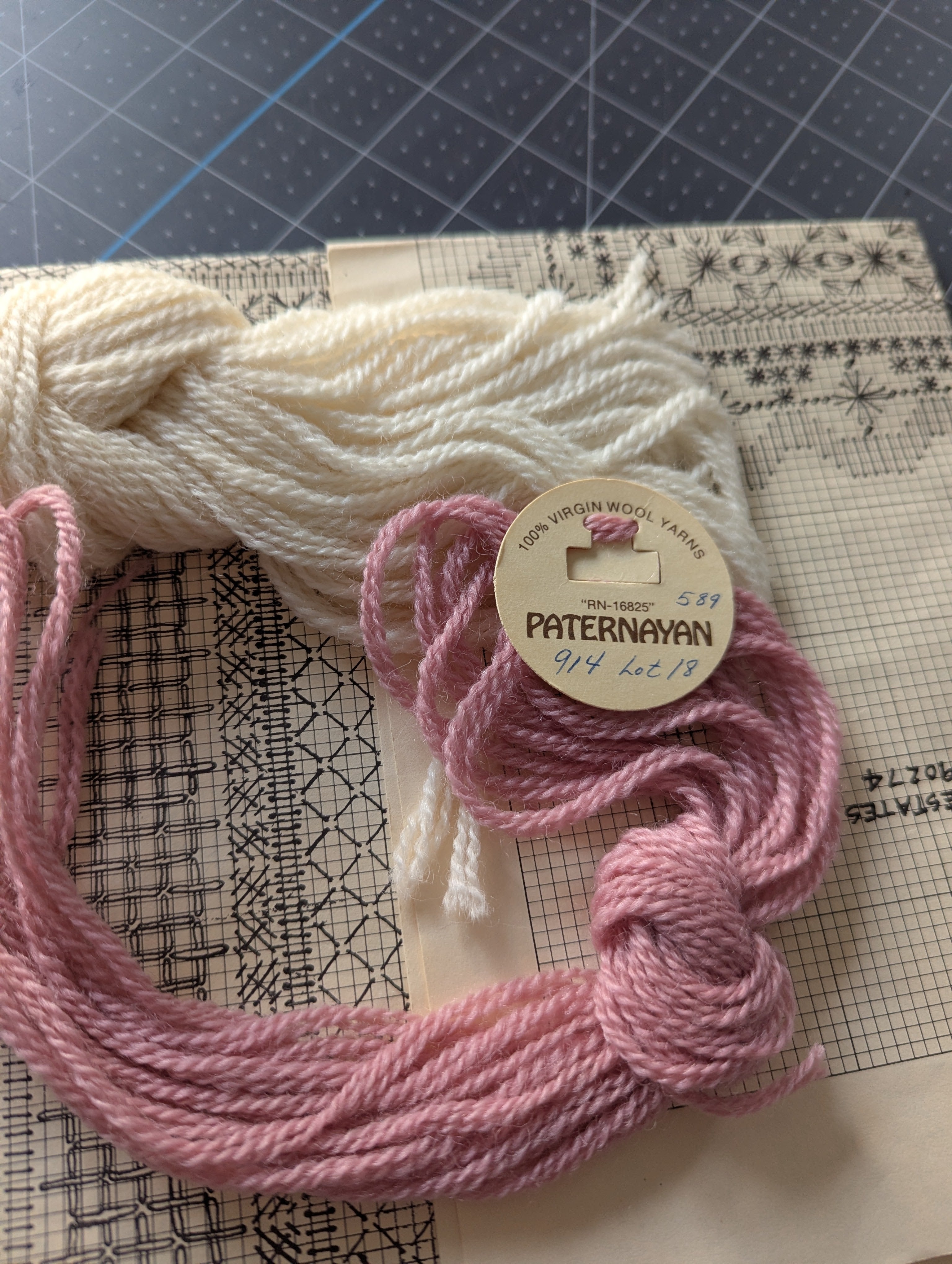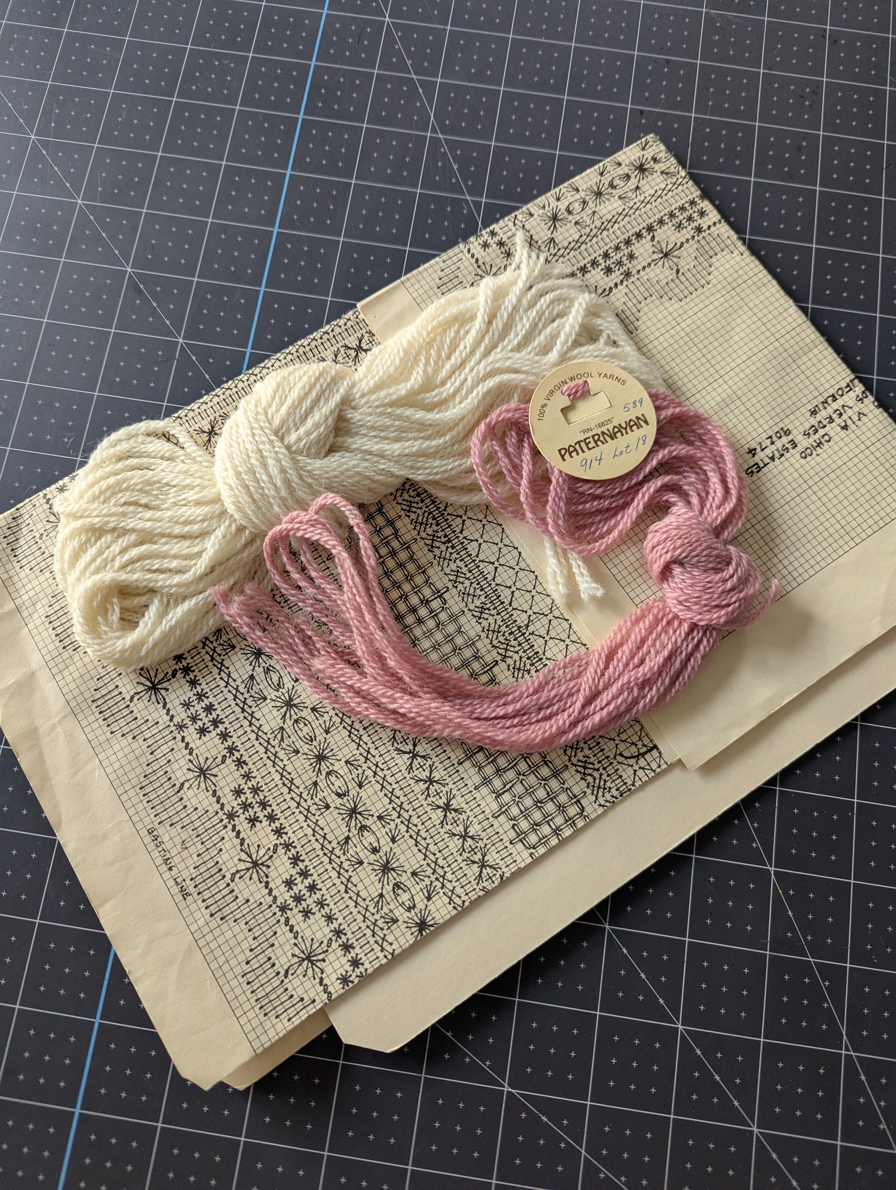 Note: This is NOT a complete kit. Includes some leftover yarn, and a paper pattern with inspiration photo and instructions. Unclear if all necessary floss is present. The textile is not included. Additional supplies will be needed to complete the piece.