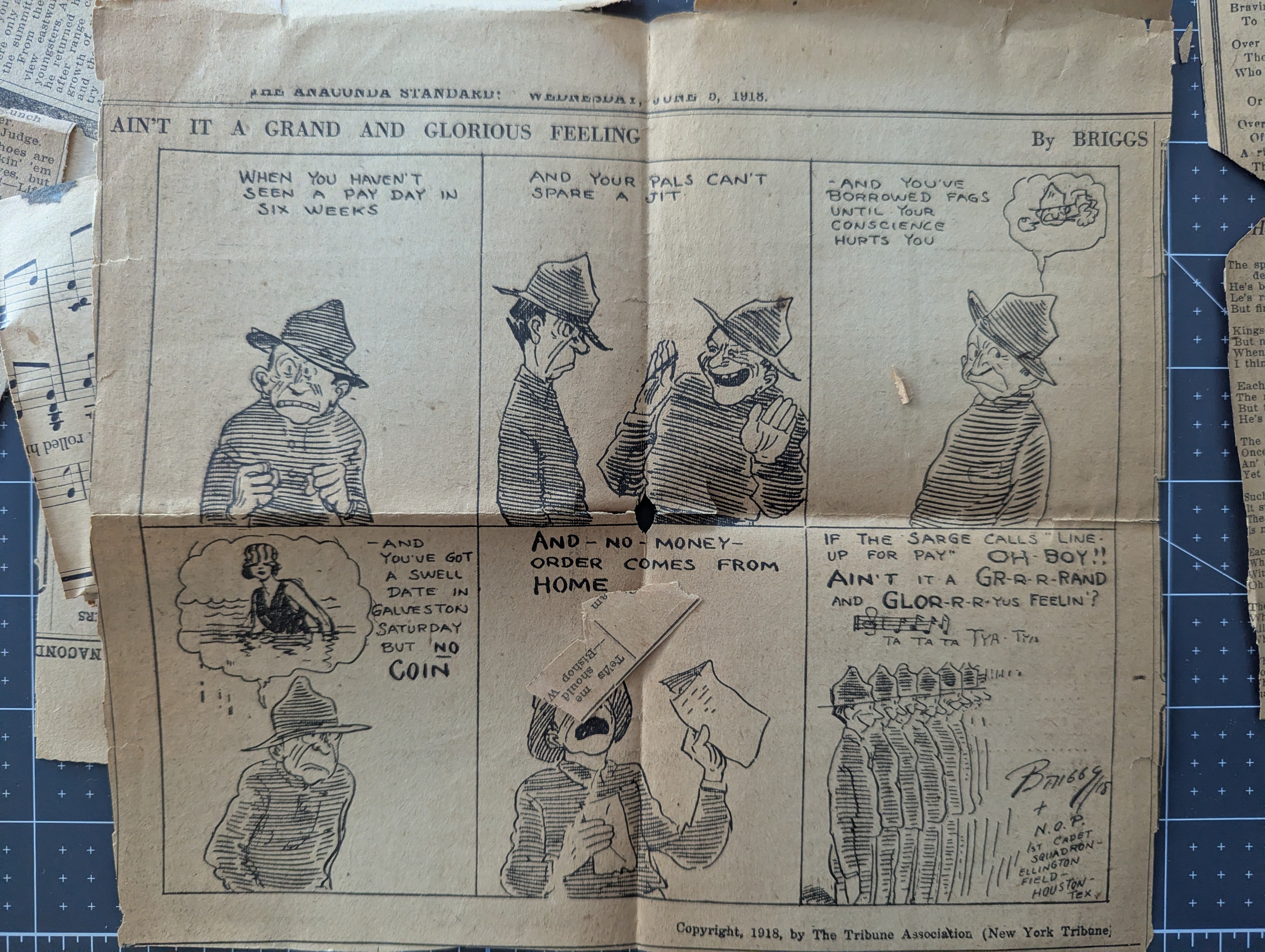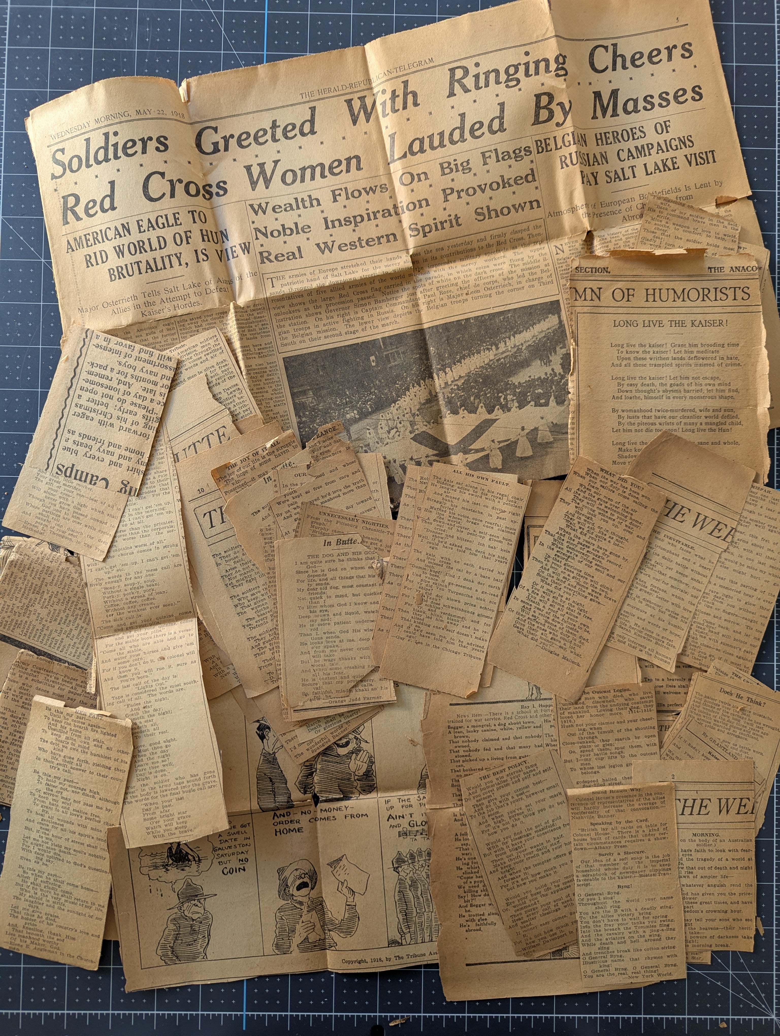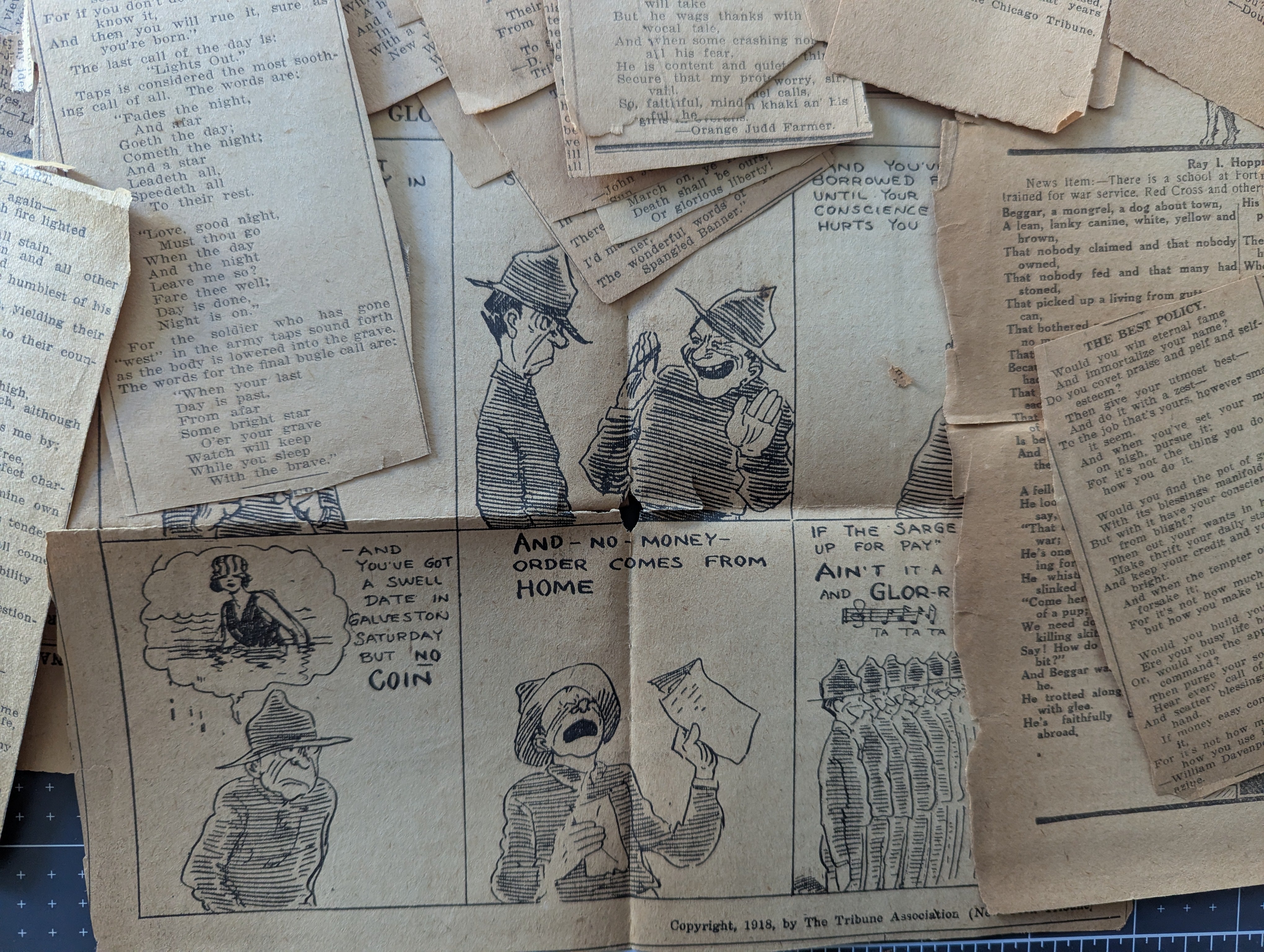 A set of very old clippings, paper is very worn and brittle but the poems are legible and would be very unique for a larger project. Includes approximately 40 poem clippings, plus a few misc. pieces including a comic. The only dates we found are for 1918, and they were in a bag labeled 1918. We don't know if the years vary or not.