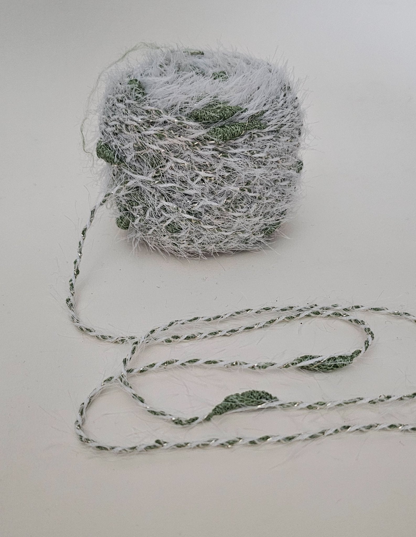 Yarn Novelty Eyelash Satin Moss Green Knots Fluffy White Eyelash with Metallic Gold Flecks 90 grams