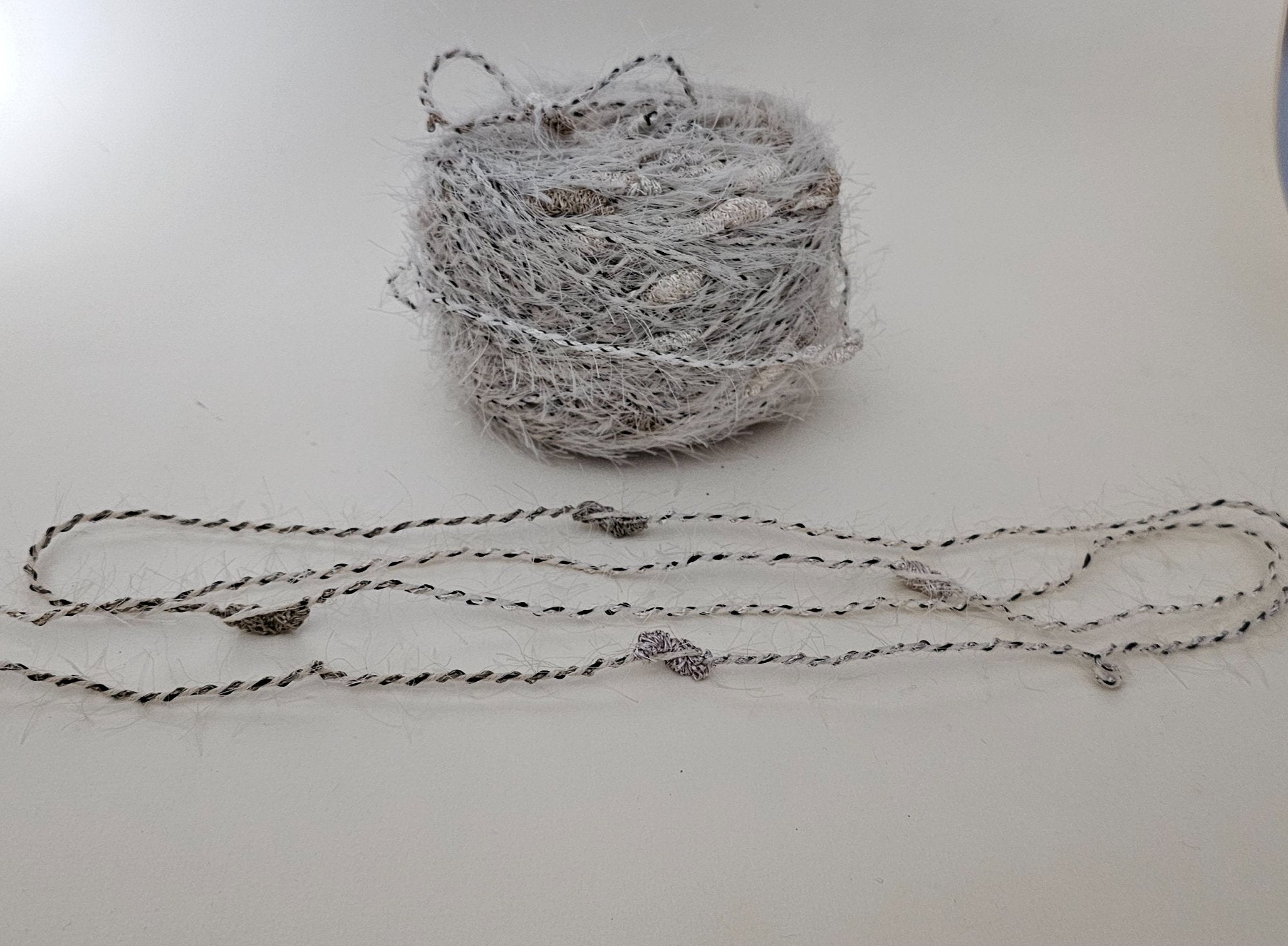 Yarn Novelty Eyelash Satin White and Grey Knots Fluffy White Eyelash with Black Flecks 150 grams