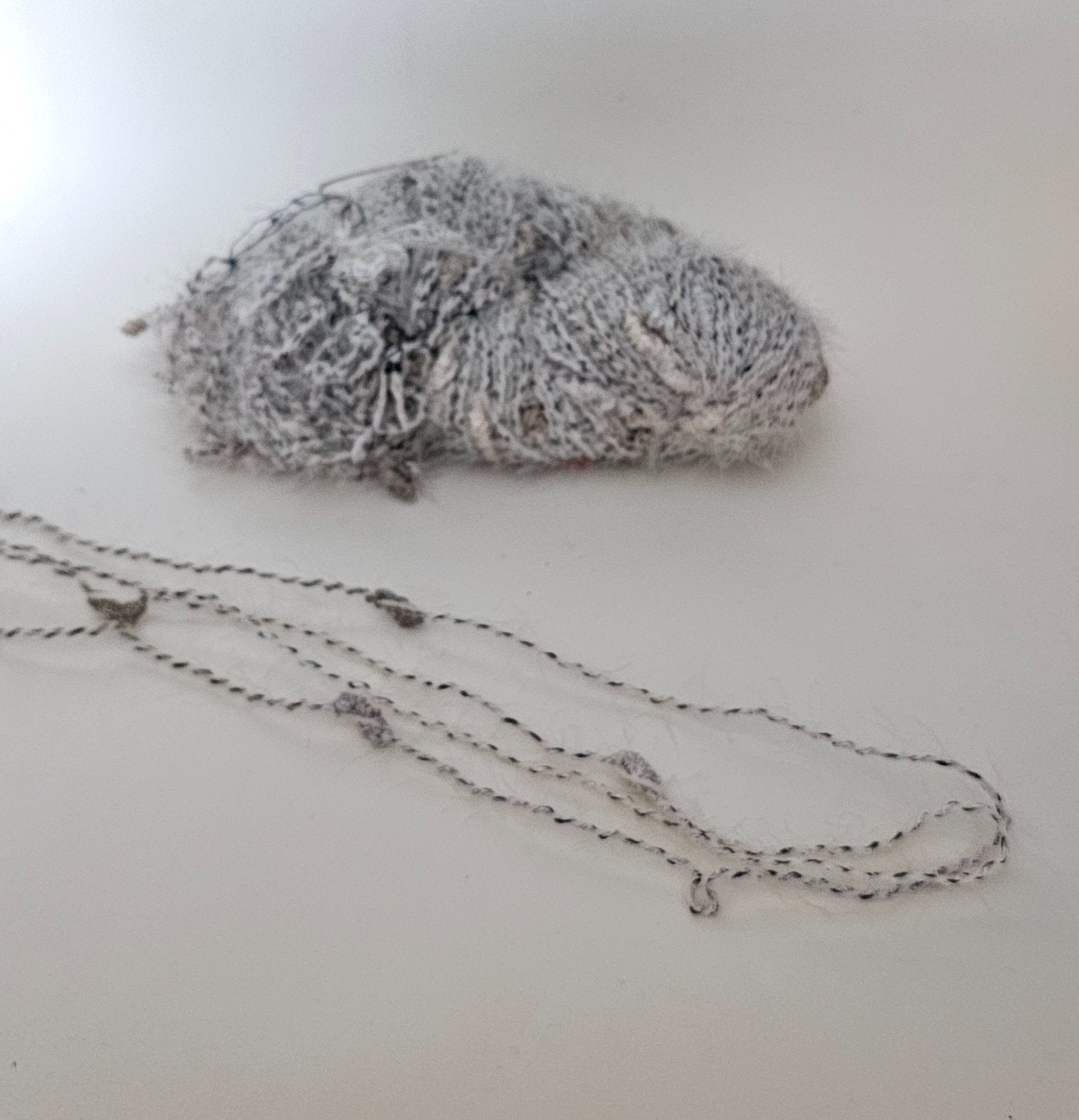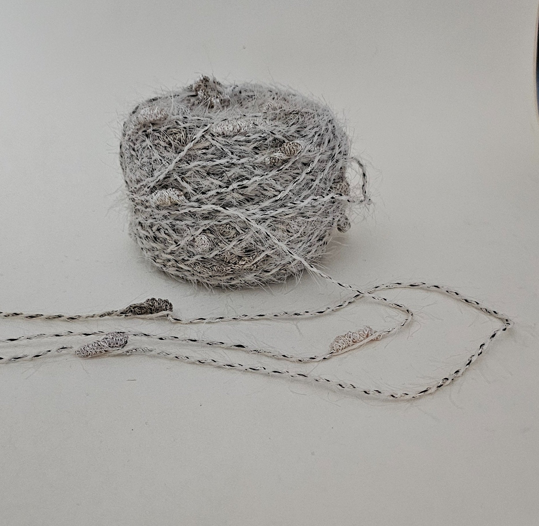 Yarn Novelty Eyelash Satin White and Grey Knots Fluffy White Eyelash with Black Flecks 170 grams