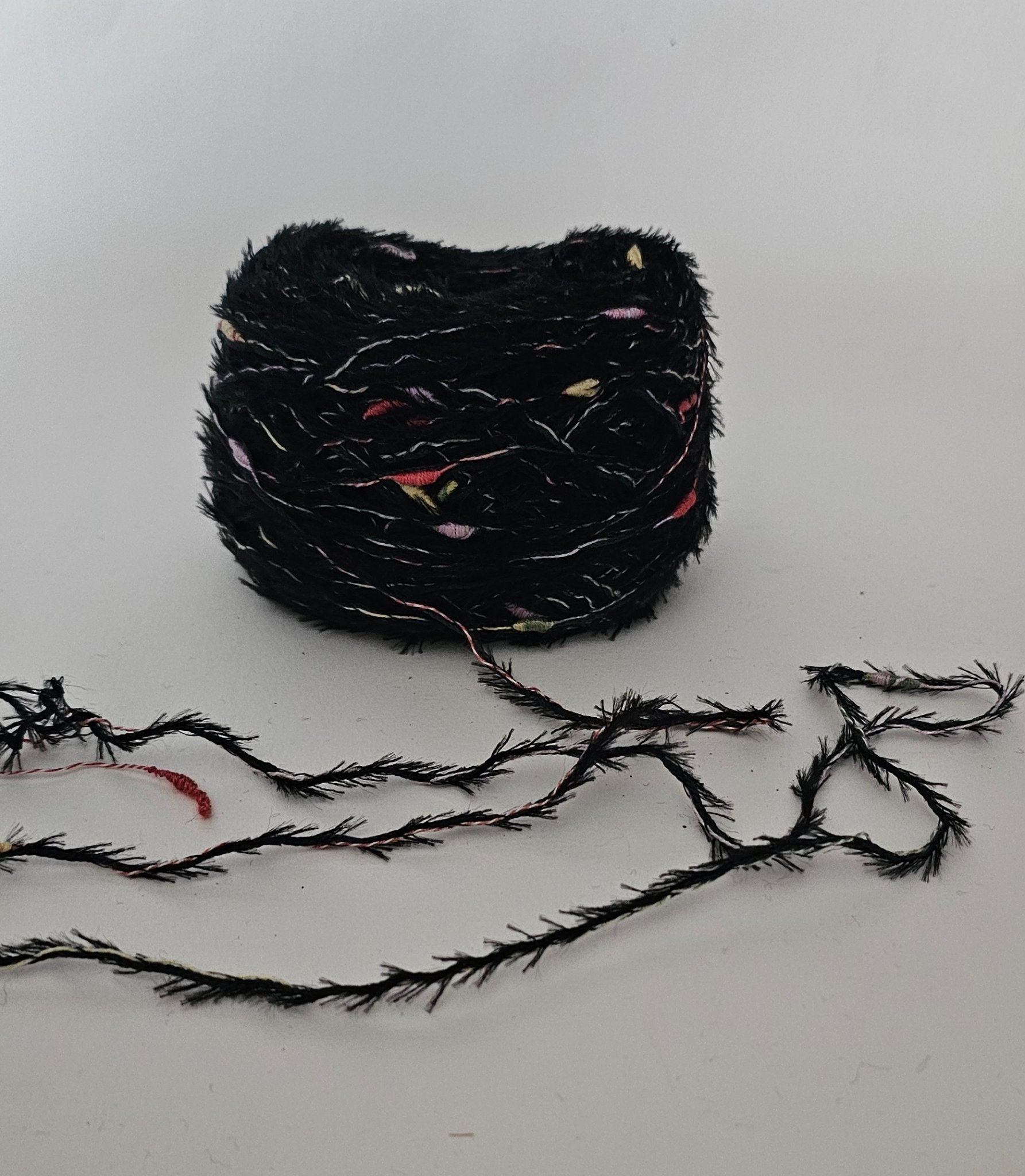 Yarn Novelty Eyelash Black with Red Green Gold Pale Purple Knots 90 grams